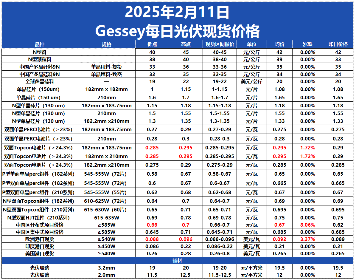 Gessey:2月11日每日光伏市場行情2025-02-11 17:53來源:gessey瀏覽數:165次