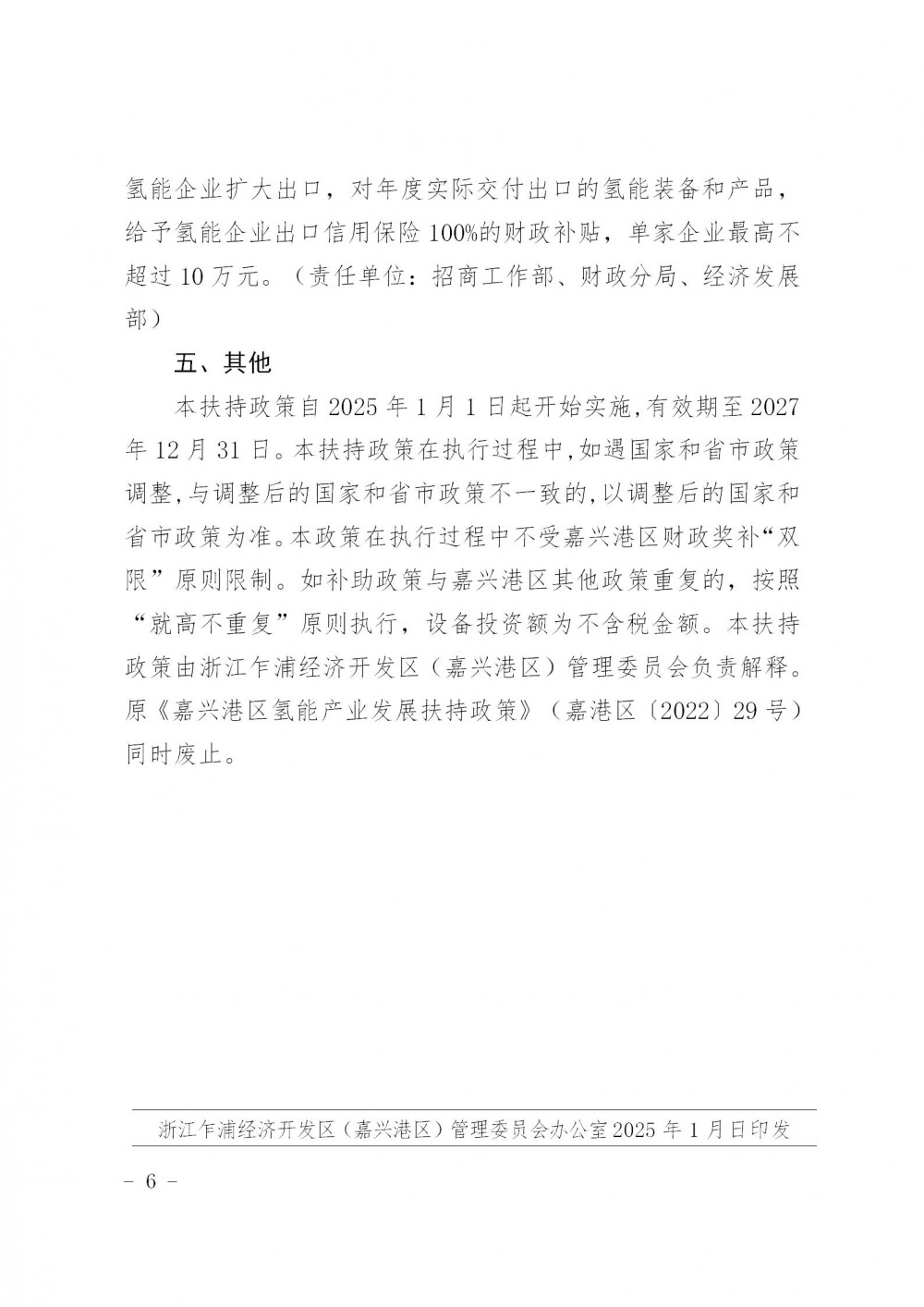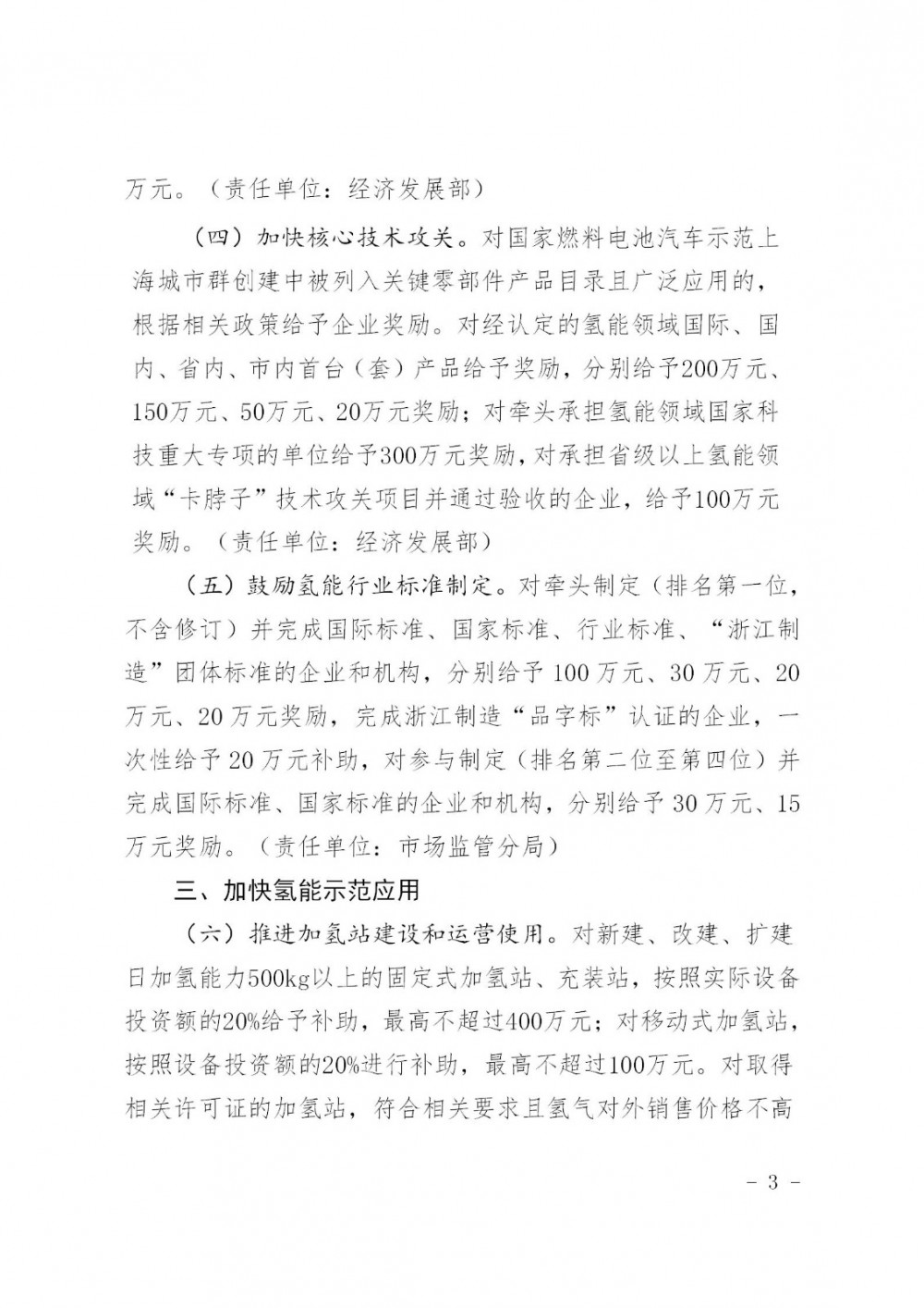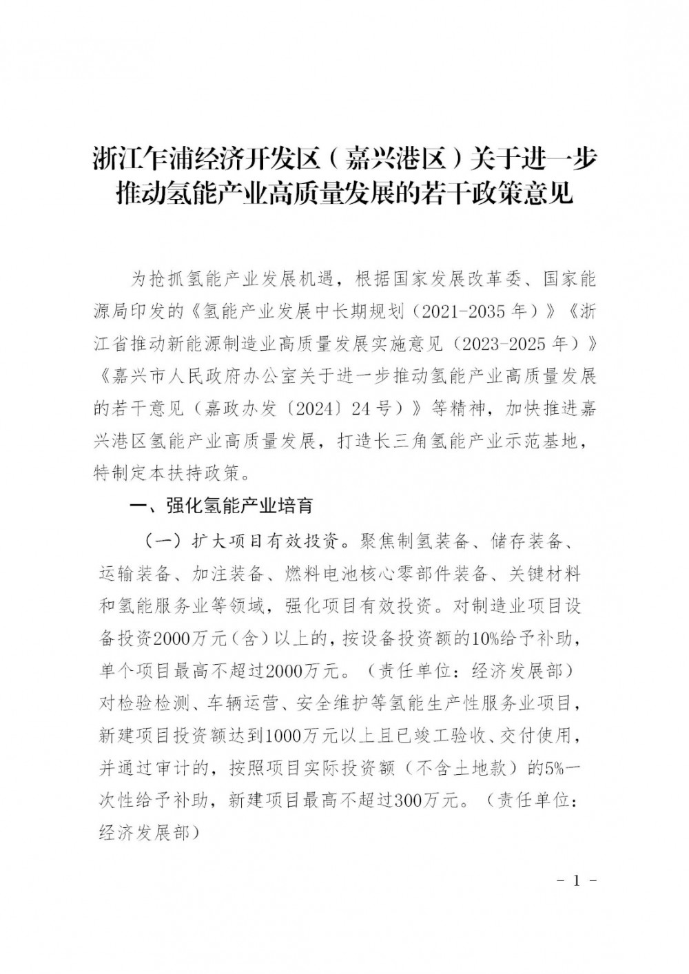 1月22日(ri),浙江(jiang)乍(zha)浦經濟(ji)(ji)開(kai)(kai)發(fa)區(qu)(嘉興港(gang)區(qu))管理委(wei)員會發(fa)布關(guan)于《浙江(jiang)乍(zha)浦經濟(ji)(ji)開(kai)(kai)發(fa)區(qu)(嘉興港(gang)區(qu))關(guan)于進一(yi)步推動氫能產業高質量發(fa)展的若干政策意見(征求意見稿)》公(gong)開(kai)(kai)征求意見的公(gong)告(gao)。 公告指出: 擴大項(xiang)(xiang)目有(you)效投資(zi)。聚焦制(zhi)氫裝(zhuang)(zhuang)備(bei)(bei)、儲(chu)存裝(zhuang)(zhuang)備(bei)(bei)、運輸裝(zhuang)(zhuang)備(bei)(bei)、加(jia)注(zhu)裝(zhuang)(zhuang)備(bei)(bei)、燃(ran)料電池(chi)核心零部(bu)件裝(zhuang)(zhuang)備(bei)(bei)、關(guan)鍵材(cai)料和氫能服務業(ye)等領域,強化(hua)項(xiang)(xiang)目有(you)效投資(zi)。對制(zhi)造(zao)業(ye)項(xiang)(xiang)目設備(bei)(bei)投資(zi)2000萬(wan)元(yuan)(含)以上的(de),按設備(bei)(bei)投資(zi)額的(de)10%給予補助(zhu),單(dan)個項(xiang)(xiang)目最高不超過(guo)2000萬(wan)元(yuan)。 該(gai)《扶(fu)持政(zheng)策》涉(she)及氫能全產業鏈(lian),從上游(you)到(dao)下游(you),獎勵10萬(wan)到(dao)2000萬(wan)不(bu)等的資(zi)金(jin)補貼。本扶(fu)持政(zheng)策自2025年1月1日起開始實施(shi),有效期至2027年12月31日。 氫(qing)能匯(微信公(gong)眾號:h2-2005)獲悉,2024年9月14日,嘉(jia)興市正式發(fa)布(bu)了《關(guan)于(yu)進一(yi)步(bu)推(tui)動(dong)氫(qing)能產業高質量(liang)發(fa)展的(de)若(ruo)干意見》(以下(xia)簡稱(cheng)《意見》)。此前(qian)在8月1日,嘉(jia)興市發(fa)布(bu)了《關(guan)于(yu)進一(yi)步(bu)推(tui)動(dong)氫(qing)能產業高質量(liang)發(fa)展的(de)若(ruo)干意見》(征求意見稿)。 根據《意見》,到(dao)2027年(nian),嘉(jia)興市氫(qing)(qing)(qing)能制造業(ye)產(chan)值規(gui)模達到(dao)200億(yi)元(yuan)以(yi)上(shang),在氫(qing)(qing)(qing)能產(chan)業(ye)鏈(lian)關鍵環(huan)節(jie)引育(yu)行(xing)業(ye)龍頭(tou)企業(ye)2家(jia)以(yi)上(shang)、億(yi)元(yuan)企業(ye)5家(jia)以(yi)上(shang),新增加氫(qing)(qing)(qing)站10座(zuo)以(yi)上(shang),氫(qing)(qing)(qing)能車輛(liang)推(tui)廣應(ying)用(yong)突破1500輛(liang),其(qi)中氫(qing)(qing)(qing)能貨車超1000輛(liang)。氫(qing)(qing)(qing)能船舶示(shi)范(fan)應(ying)用(yong)10艘以(yi)上(shang)。積極建(jian)設嘉(jia)興—上(shang)海(hai)—蘇州“長三角(jiao)氫(qing)(qing)(qing)能走廊”。 此(ci)外,《意見》還提到(dao),到(dao)2027年,力爭乍浦港(gang)區港(gang)口內短(duan)駁(bo)運輸氫(qing)能集卡使(shi)用(yong)(yong)比例超過70%,臨(lin)空經(jing)濟示范區內氫(qing)能貨車(che)使(shi)用(yong)(yong)比例達到(dao)30%,全市氫(qing)能叉車(che)使(shi)用(yong)(yong)超60臺。 原文如下: 關于《浙江乍浦經濟開發區(嘉興港區)關于進一步推動氫能產業高質量發展的若干政策意見(征求意見稿)》公開征求意見的公告 為(wei)進一(yi)(yi)步貫徹落實(shi)黨中央國務院關于加快建(jian)設全國統(tong)一(yi)(yi)大市場的文件精神,嚴格落實(shi)公(gong)平競爭審查制度,經研究(jiu)擬決定對《浙(zhe)江乍浦(pu)經濟開發(fa)區(qu)(嘉興港區(qu))關于進一(yi)(yi)步推動氫能(neng)產業高質量發(fa)展的若(ruo)干政策(ce)意(yi)(yi)見(jian)(征求(qiu)(qiu)意(yi)(yi)見(jian)稿)》公(gong)開征求(qiu)(qiu)意(yi)(yi)見(jian)。公(gong)開征求(qiu)(qiu)意(yi)(yi)見(jian)截止(zhi)時間為(wei)2025年1月(yue)24日(ri),逾期(qi)未回復視(shi)為(wei)無意(yi)(yi)見(jian)。 特此公告! 聯系電話:0573-85525131 電子(zi)郵箱(xiang):744491464@qq.com 附件1-浙江乍浦經濟開發(fa)(fa)區(嘉興港區)關于(yu)進一步推動氫能產業高質(zhi)量發(fa)(fa)展的若干政策(ce)意見(征(zheng)求意見稿) 浙江乍浦經濟開發區(嘉興港區)經(jing)濟發展(zhan)部 2025年1月22日