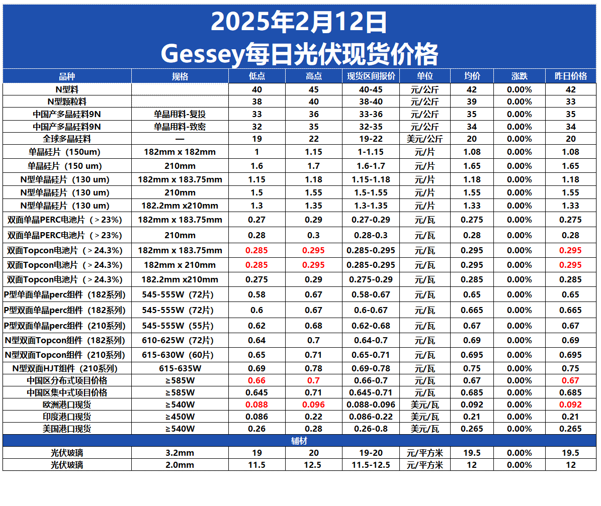 Gessey:2月12日每日光伏市場行情2025-02-12 17:47來源:gessey瀏覽數:454次