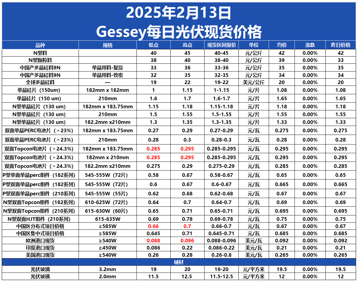 Gessey:2月13日每日光伏市場行情2025-02-13 18:02來源:gessey瀏覽數:266次