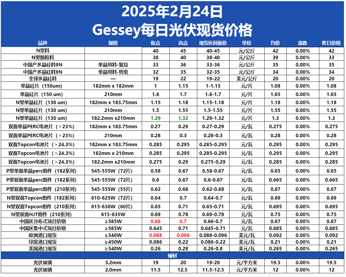 Gessey:2月24日每日光伏市場行情2025-02-24 19:35瀏覽數:189次