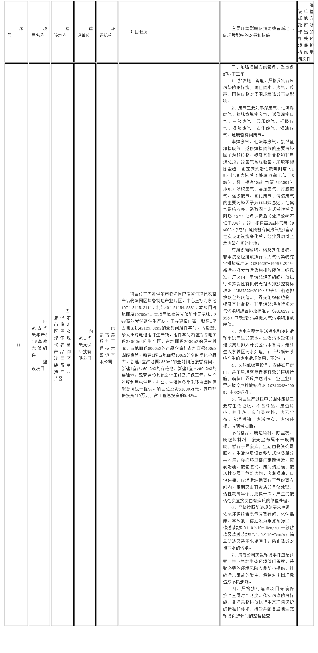 根據建設(she)(she)項目環境(jing)(jing)影(ying)響(xiang)評價(jia)審(shen)批程序的有關規定,經審(shen)查,我局擬對(dui)內蒙古華(hua)晟(sheng)年產3GW高效光伏組件(jian)(jian)建設(she)(she)項目環境(jing)(jing)影(ying)響(xiang)報告(gao)表作(zuo)(zuo)(zuo)出審(shen)批意(yi)見(jian)。為保證(zheng)此次(ci)審(shen)查工作(zuo)(zuo)(zuo)的嚴肅性和(he)公(gong)正(zheng)性,現(xian)將擬作(zuo)(zuo)(zuo)出審(shen)批意(yi)見(jian)的環境(jing)(jing)影(ying)響(xiang)評價(jia)文(wen)件(jian)(jian)基本情況予(yu)以公(gong)示(shi),公(gong)示(shi)期(qi)自(zi)2025年3月7日(ri)開始(公(gong)示(shi)期(qi)為5個工作(zuo)(zuo)(zuo)日(ri))。聽(ting)證(zheng)權利(li)告(gao)知:依據《中華(hua)人(ren)民共和(he)國行政許可法》,自(zi)公(gong)示(shi)起五日(ri)內申請人(ren)、利(li)害關系人(ren)可對(dui)以下擬作(zuo)(zuo)(zuo)出的建設(she)(she)項目環境(jing)(jing)影(ying)響(xiang)評價(jia)文(wen)件(jian)(jian)審(shen)批意(yi)見(jian)要(yao)求(qiu)聽(ting)證(zheng)。 聯(lian)系電話:0478-8227307 8521317 傳 真:0478-8273663 郵 編(bian):015000 通訊地址(zhi):巴彥(yan)淖(nao)爾市(shi)生態環境(jing)局臨河區分局 605室 擬批準建設項目環境影響評價文件的內容