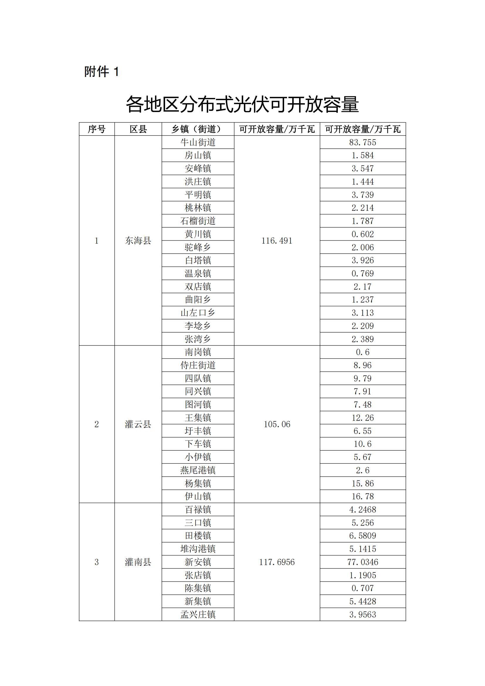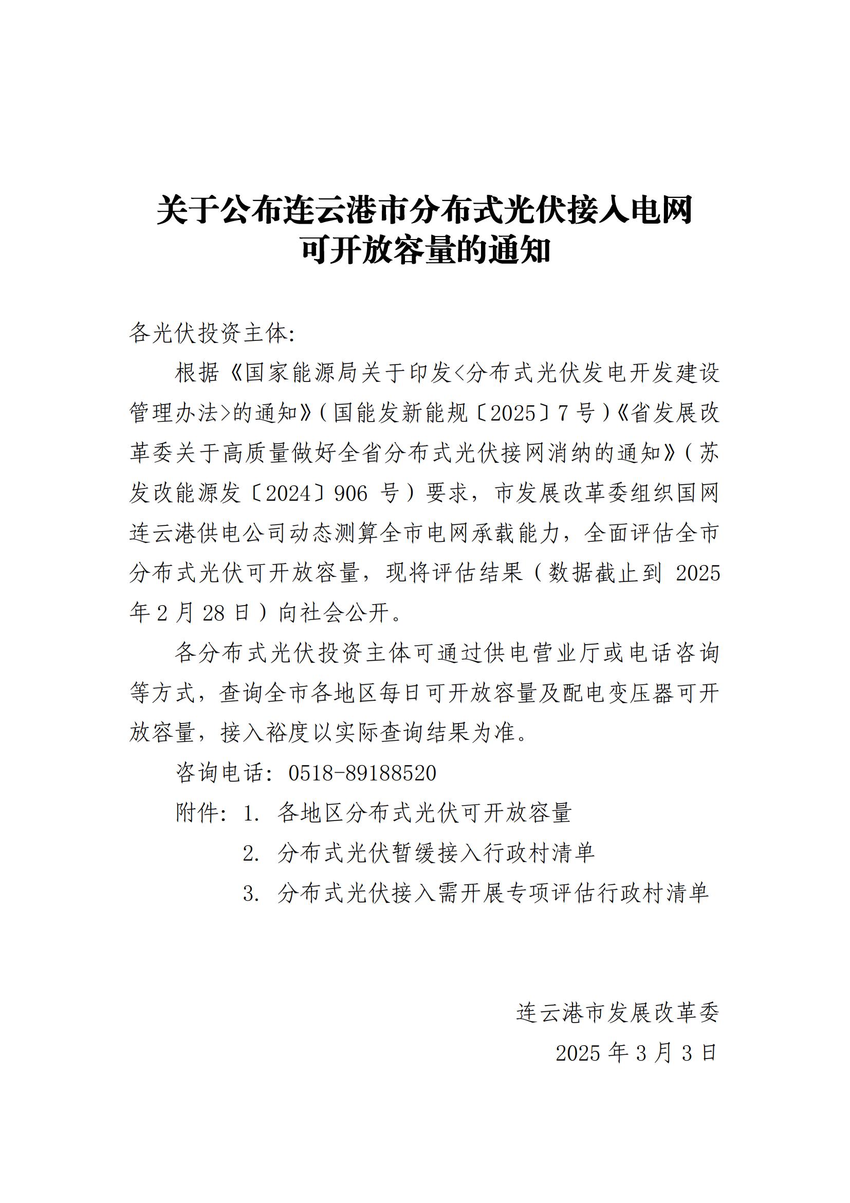 3月3日,江蘇省連云港市發展和改革委員會公布連云港市分布式光伏接入電網可開放容量。 文件提出,連云港市發展改革委組織國網連云港供電公司動態測算全市電網承載能力,全面評估全市分布式光伏可開放容量,現將評估結果(數據截止到2025年2月28日)向社會公開。 根據文件,連云港市分布式光伏可開放容量為521.01554萬千瓦。其中東海縣116.491萬千瓦,灌云縣105.06萬千瓦,灌南縣117.6956萬千瓦,贛榆區5.6015萬千瓦,海州117.84948萬千瓦,連云58.31796萬千瓦。
