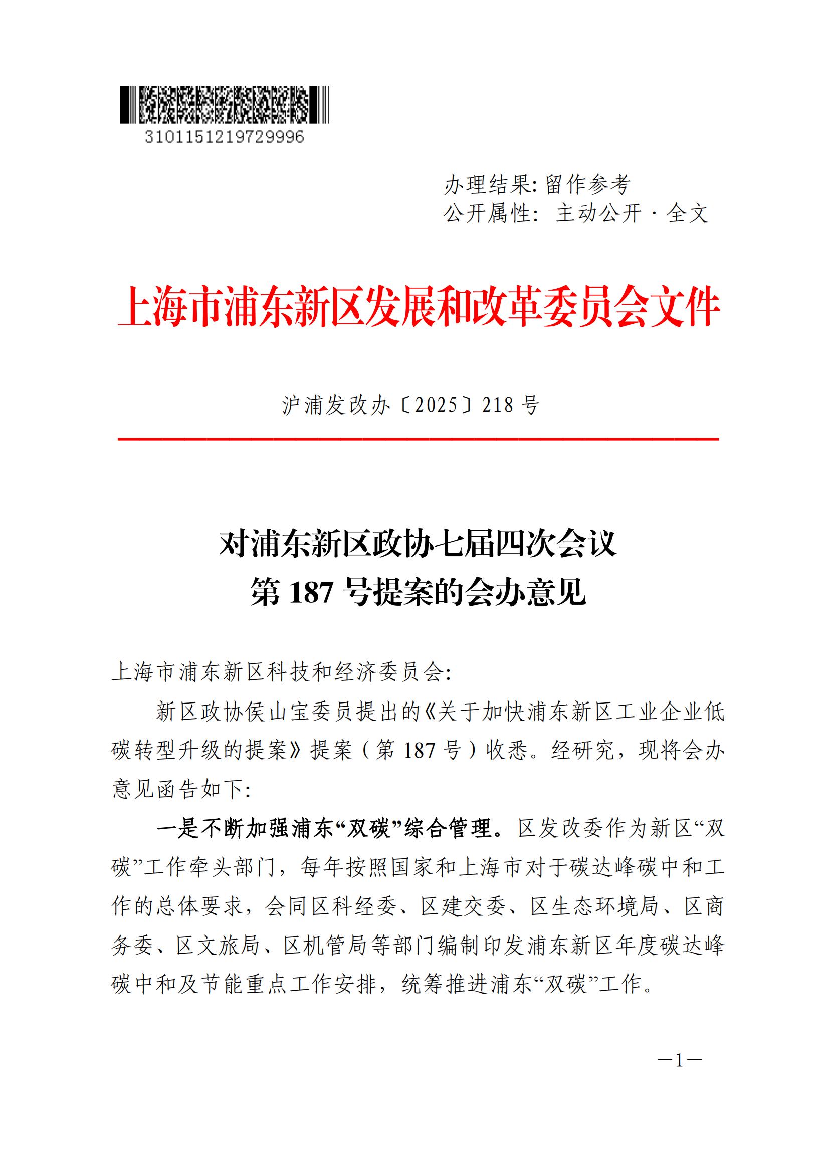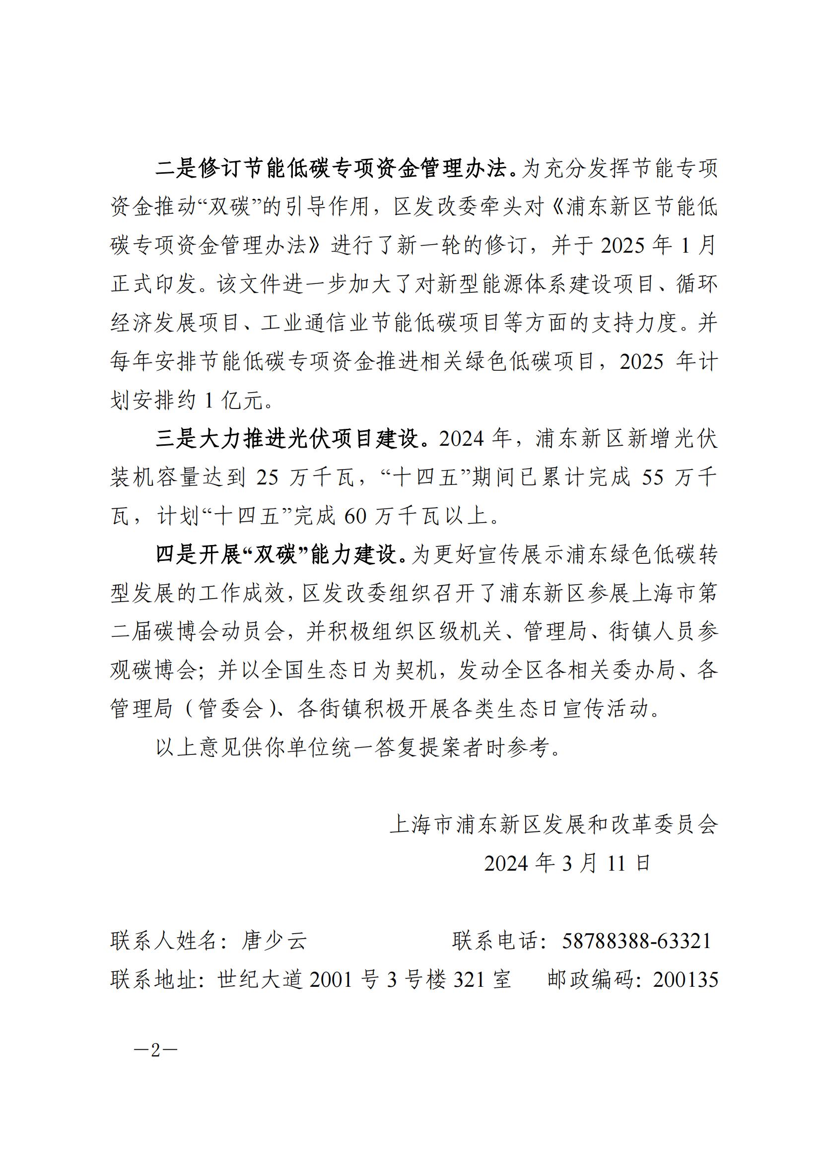 3月12日,上海浦東新區發改委發布《對浦東新區政協七屆四次會議第187號提案的會辦意見》。《意見》中指出,大力推進光伏項目建設。2024年,浦東新區新增光伏裝機容量達到25萬千瓦,“十四五”期間已累計完成55萬千瓦,計劃“十四五”完成60萬千瓦以上。 原文如下: 對浦東新區政協七屆四次會議第187號提案的會辦意見 滬浦發改辦〔2025〕0218號 上海市浦東新區科技和經濟委員會: 新區政協侯山寶委員提出的《關于加快浦東新區工業企業低碳轉型升級的提案》提案(第187號)收悉。經研究,現將會辦意見函告如下: 一是不斷加強浦東“雙碳”綜合管理。區發改委作為新區“雙碳”工作牽頭部門,每年按照國家和上海市對于碳達峰碳中和工作的總體要求,會同區科經委、區建交委、區生態環境局、區商務委、區文旅局、區機管局等部門編制印發浦東新區年度碳達峰碳中和及節能重點工作安排,統籌推進浦東“雙碳”工作。 二是修訂節能低碳專項資金管理辦法。為充分發揮節能專項資金推動“雙碳”的引導作用,區發改委牽頭對《浦東新區節能低碳專項資金管理辦法》進行了新一輪的修訂,并于2025年1月正式印發。該文件進一步加大了對新型能源體系建設項目、循環經濟發展項目、工業通信業節能低碳項目等方面的支持力度。并每年安排節能低碳專項資金推進相關綠色低碳項目,2025年計劃安排約1億元。 三是大力推進光伏項目建設。2024年,浦東新區新增光伏裝機容量達到25萬千瓦,“十四五”期間已累計完成55萬千瓦,計劃“十四五”完成60萬千瓦以上。 四是開展“雙碳”能力建設。為更好宣傳展示浦東綠色低碳轉型發展的工作成效,區發改委組織召開了浦東新區參展上海市第二屆碳博會動員會,并積極組織區級機關、管理局、街鎮人員參觀碳博會;并以全國生態日為契機,發動全區各相關委辦局、各管理局(管委會)、各街鎮積極開展各類生態日宣傳活動。 以上意見供你單位統一答復提案者時參考。 上海市浦東新區發展和改革委員會 2024年3月11日 聯系人姓名:唐少云 聯系電話:58788388-63321 聯系地址:世紀大道2001號3號樓321室 郵政編碼:200135