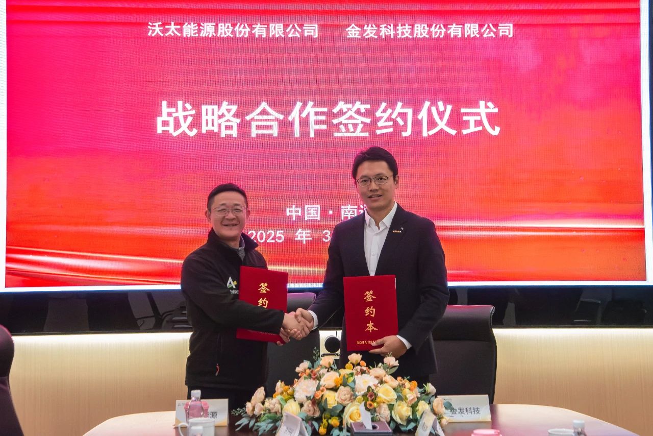 3月12日,沃太能源股份有限公司與金發科技股份有限公司正式簽署戰略合作協議。金發科技集團總經理吳敵、產業園董事長余啟生,沃太能源董事長袁宏亮、董事兼CFO王少奇等雙方代表出席現場,見證這一重要時刻。雙方強強聯合,正式開啟以技術賦能、產業共興為核心的合作新篇章。 ▲ 右四:金發科技產業園董事長余啟生;右五:沃太能源董事長袁宏亮;右六:金發科技集團總經理吳敵;右七:沃太能源董事兼CFO王少奇 在簽約儀式上,雙方就低碳智慧園區的建設規劃、產業鏈協同開發以及未來合作方向等多個層面,展開了深入探討。金發科技在高性能新材料領域擁有深厚的產業積淀和行業資源,沃太能源則掌握優越的儲能系統解決方案和國內外市場資源。此次合作,雙方將充分發揮各自的技術專長和行業優勢,攜手構建起深層次、高效的合作交流平臺,旨在實現珠三角區域新能源市場藍圖部署,為能源行業帶來更多創新與價值。 ▲ 左一:沃太能源董事長袁宏亮;左二:金發科技集團總經理吳敵 當日,金發科技代表團一行全面領略了公司最新的儲能技術及研發成果,并參觀了先進的智能化生產車間,對公司的智能制造實力、能源管理能力以及全生命周期管理和服務體系有了更為深刻且全面的理解,為雙方今后合作的順利推進與深化夯實了基礎。 展望未來,雙方將秉持資源共享、優勢互補、業務創新的合作原則,緊抓市場新機遇,積極探索發展新路徑,以更有效地助力能源結構轉型升級與綠色可持續發展。 上一篇: 蓋錫咨詢:3月17日光伏行業要聞速覽