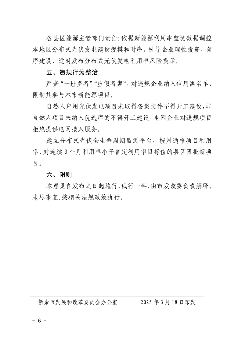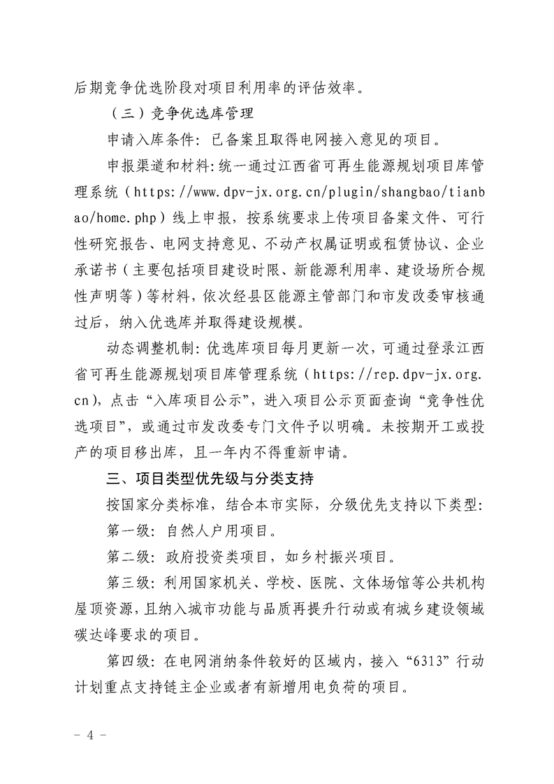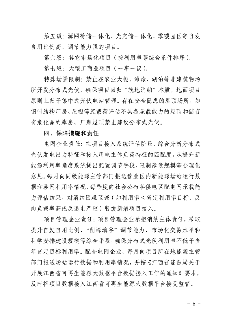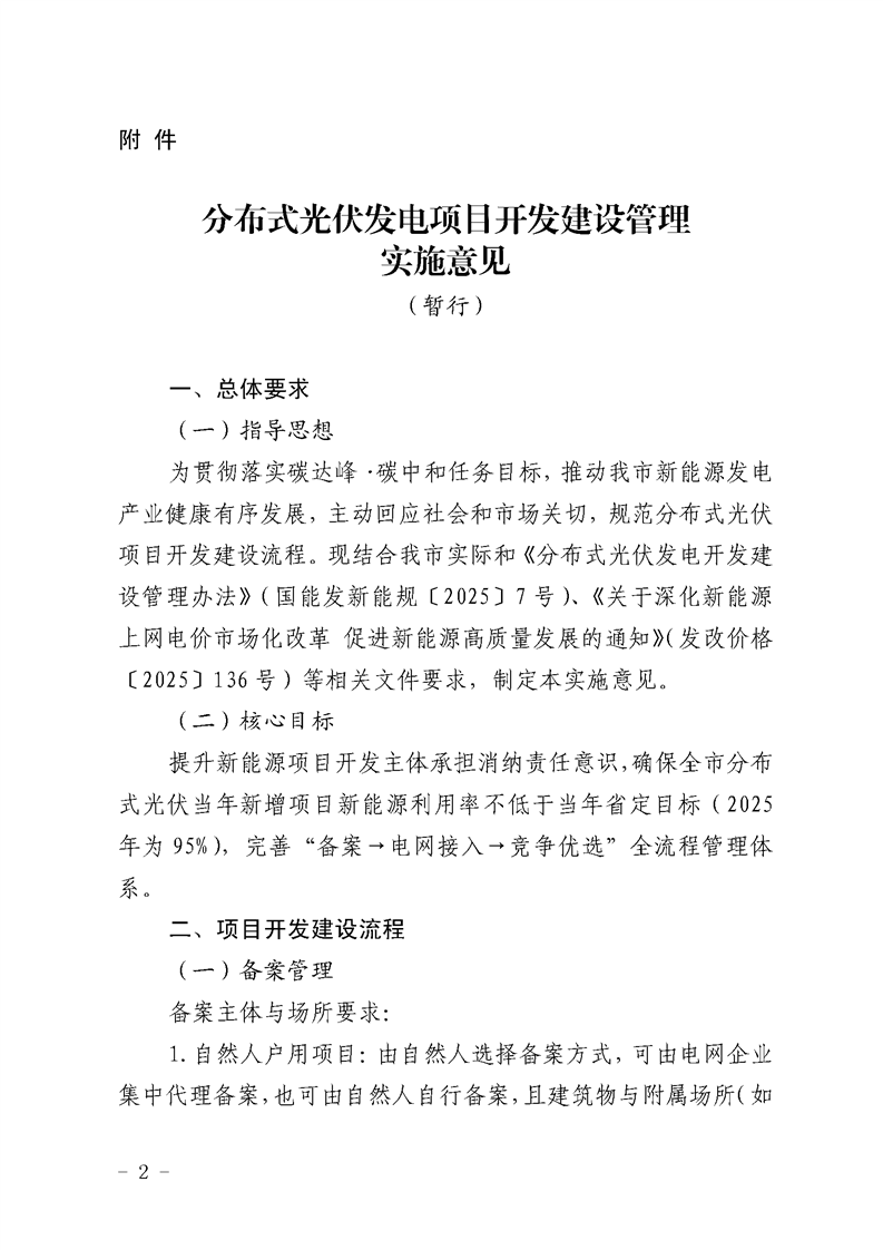 近日,江西省新余市發展和改革委員會發布關于印發《分布式光伏發電項目開發建設管理實施意見(暫行)》的通知。 提升新能源項目開發主體承擔消納責任意識,確保全市分布式光伏當年新增項目新能源利用率不低于當年省定目標(2025年為95%),完善“備案一電網接入一競爭優選”全流程管理體系。 明確七級優先支持項目類型 按國家分類標準,結合本市實際,分級優先支持以下類型: 第一級:自然人戶用項目。 第二級:政府投資類項目,如鄉村振興項目。 第三級:利用國家機關、學校、醫院、文體場館等公共機構屋頂資源,且納入城市功能與品質再提升行動或有城鄉建設領域碳達峰要求的項目。 第四級:在電網消納條件較好的區域內,接入“6313”行動計劃重點支持鏈主企業或者有新增用電負荷的項目。 第五級:源網荷儲一體化、光充儲一體化、零碳園區等自發自用比例高、調節能力強的項目。 第六級:其它市場化項目(按利用率等綜合條件排序)。 第七級:大型工商業項目(一事一議)。 特殊場景限制:禁止在農業大棚、灘涂、湖泊等非建筑物場所開發分布式光伏,確保項目回歸“就地消納”本質,地面項目原則上歸于集中式光伏電站管理。存在安全隱患的屋頂場所,如鋼制結構廠房、屋棚等經載荷評估不具備承載能力的屋頂和儲存有危化品的庫房、廠房屋頂禁止建設分布式光伏。 下一篇: 特朗普將光伏制造從《國防生產法》中排除
