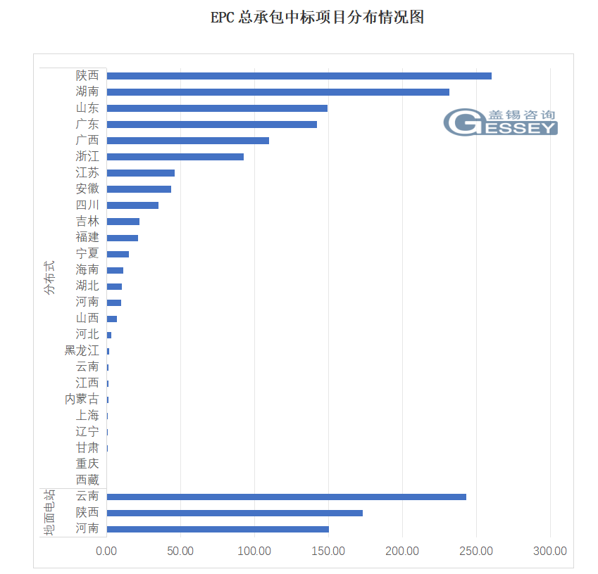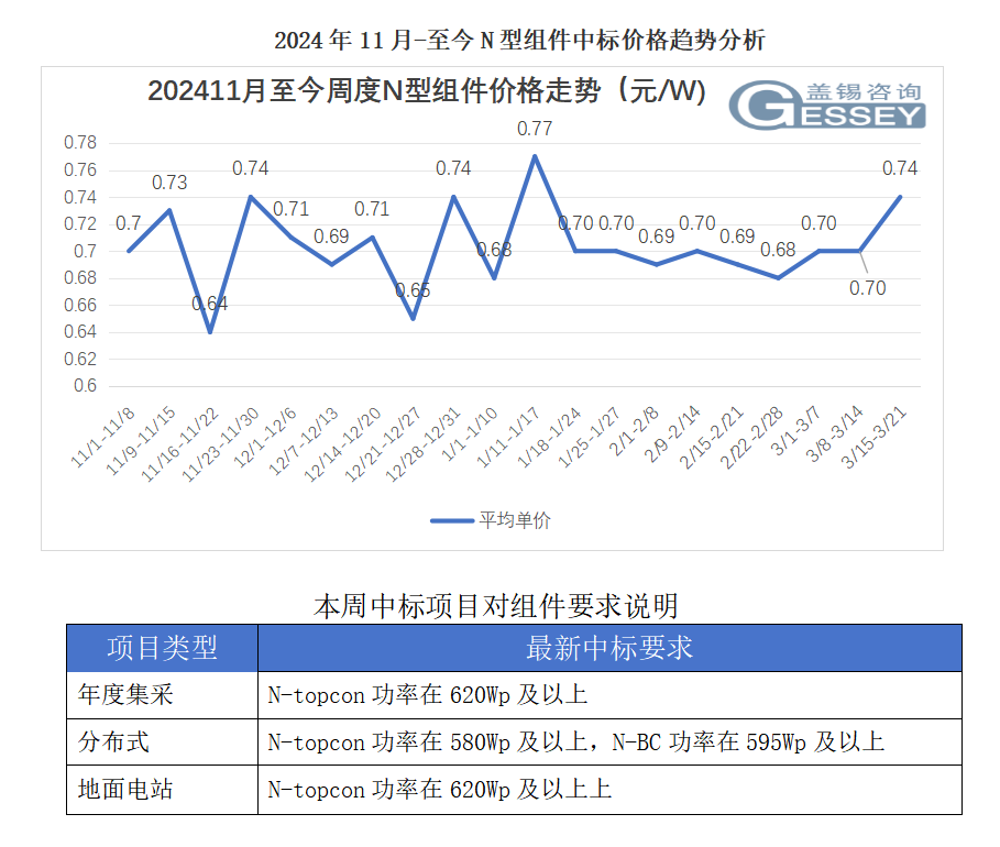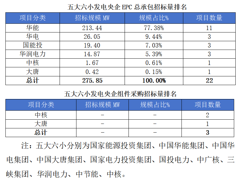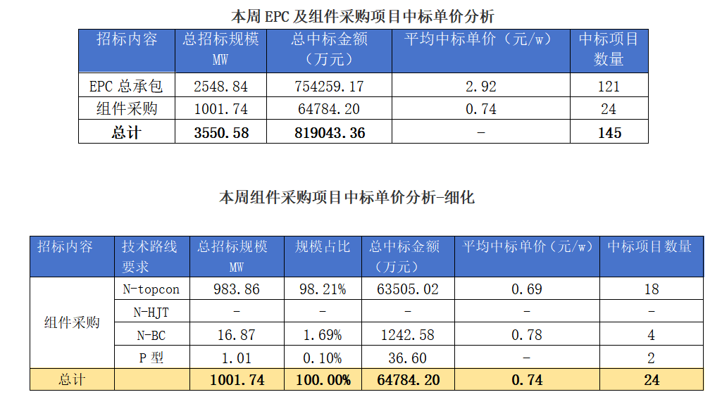 一、光伏項目招標情況匯總: 根據(ju)Gessey蓋錫咨(zi)詢(xun)統計,3月15日(ri)-3月21日(ri)累計光伏招(zhao)(zhao)標(biao)項(xiang)目為(wei)(wei)239個,項(xiang)目規(gui)模(mo)合計為(wei)(wei)2449.17MW。光伏組件采(cai)購(gou)招(zhao)(zhao)標(biao)項(xiang)目為(wei)(wei)25個,招(zhao)(zhao)標(biao)規(gui)模(mo)為(wei)(wei)233.26MW,EPC總承包招(zhao)(zhao)標(biao)項(xiang)目為(wei)(wei)214個,招(zhao)(zhao)標(biao)規(gui)模(mo)為(wei)(wei)2215.92MW。 我們統(tong)計包含大型央(yang)企(qi)國企(qi)、地方(fang)能源集團(tuan)、地方(fang)政(zheng)府機關、兩大電網、央(yang)企(qi)總(zong)包企(qi)業、知(zhi)名(ming)光伏企(qi)業等,其中五大六小發電央(yang)企(qi)占(zhan)總(zong)招標規模較高,具體(ti)各企(qi)業排名(ming)如下表: 二、中標項目分布類型匯總情況 本(ben)周中(zhong)(zhong)標(biao)項(xiang)目需求按照招(zhao)標(biao)場景地(di)分布,分布式(shi)光伏(fu)(fu)主(zhu)要集(ji)中(zhong)(zhong)在陜西、湖南、山東、廣東等地(di)區(qu),即(ji)主(zhu)要集(ji)中(zhong)(zhong)在中(zhong)(zhong)東部(bu)地(di)區(qu);集(ji)中(zhong)(zhong)式(shi)光伏(fu)(fu)主(zhu)要集(ji)中(zhong)(zhong)在云南、陜西、河(he)南等地(di)區(qu),即(ji)主(zhu)要集(ji)中(zhong)(zhong)在西南部(bu)地(di)區(qu)。 三、EPC總承包及組件采購情況匯總 本周光伏EPC總承包中標(biao)規模(mo)達2548.84MW,總中標(biao)金額754259.17萬元(yuan),平均中標(biao)單價為2.92元(yuan)/W,中標(biao)數量(liang)121個。 本周(zhou)光伏組件采購中(zhong)標規模達1001.74MW,總中(zhong)標金(jin)額(e)64784.20萬元(yuan),平均中(zhong)標單價為0.74元(yuan)/W,中(zhong)標數量24個。 上一篇: 硅片調漲, 明日執行最新價格!