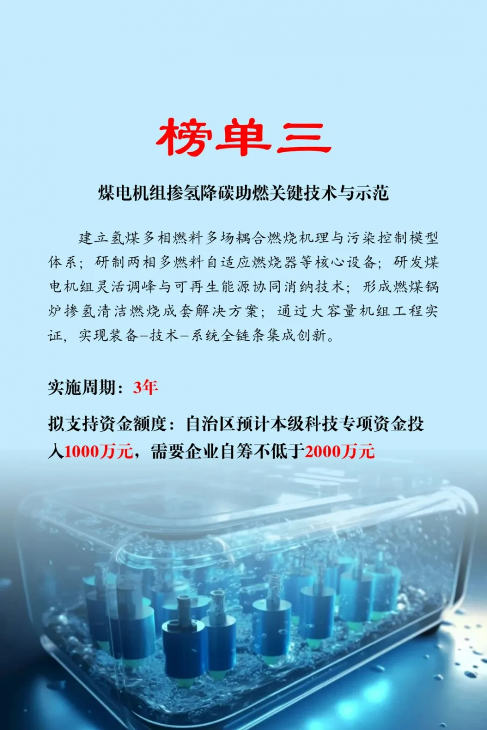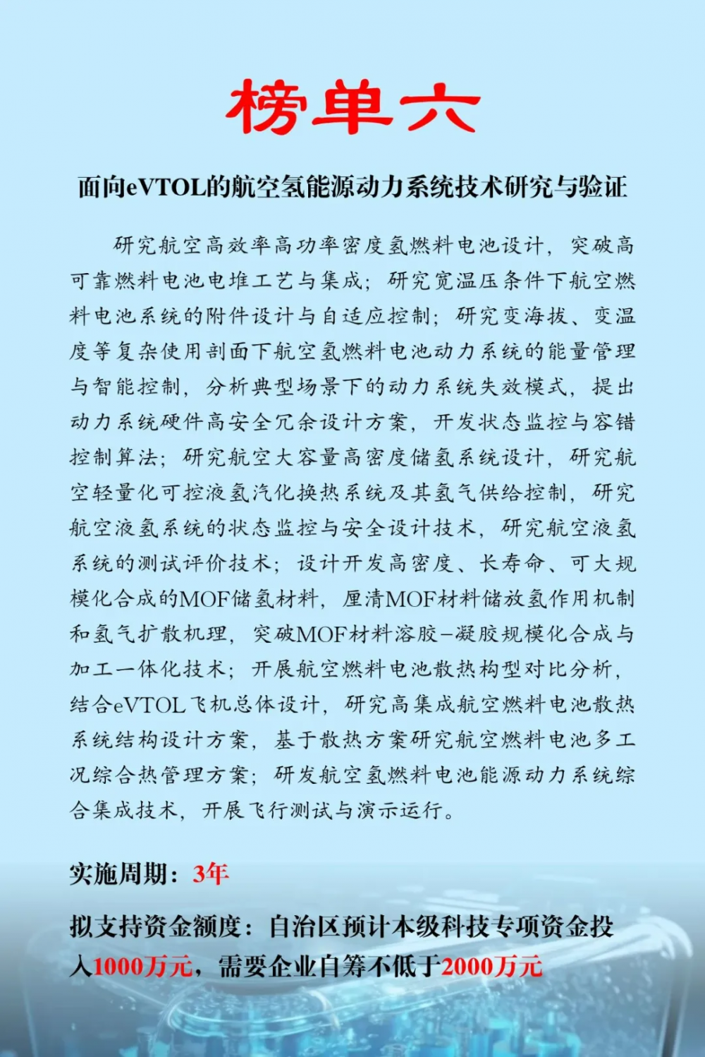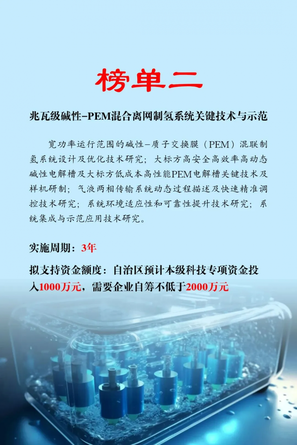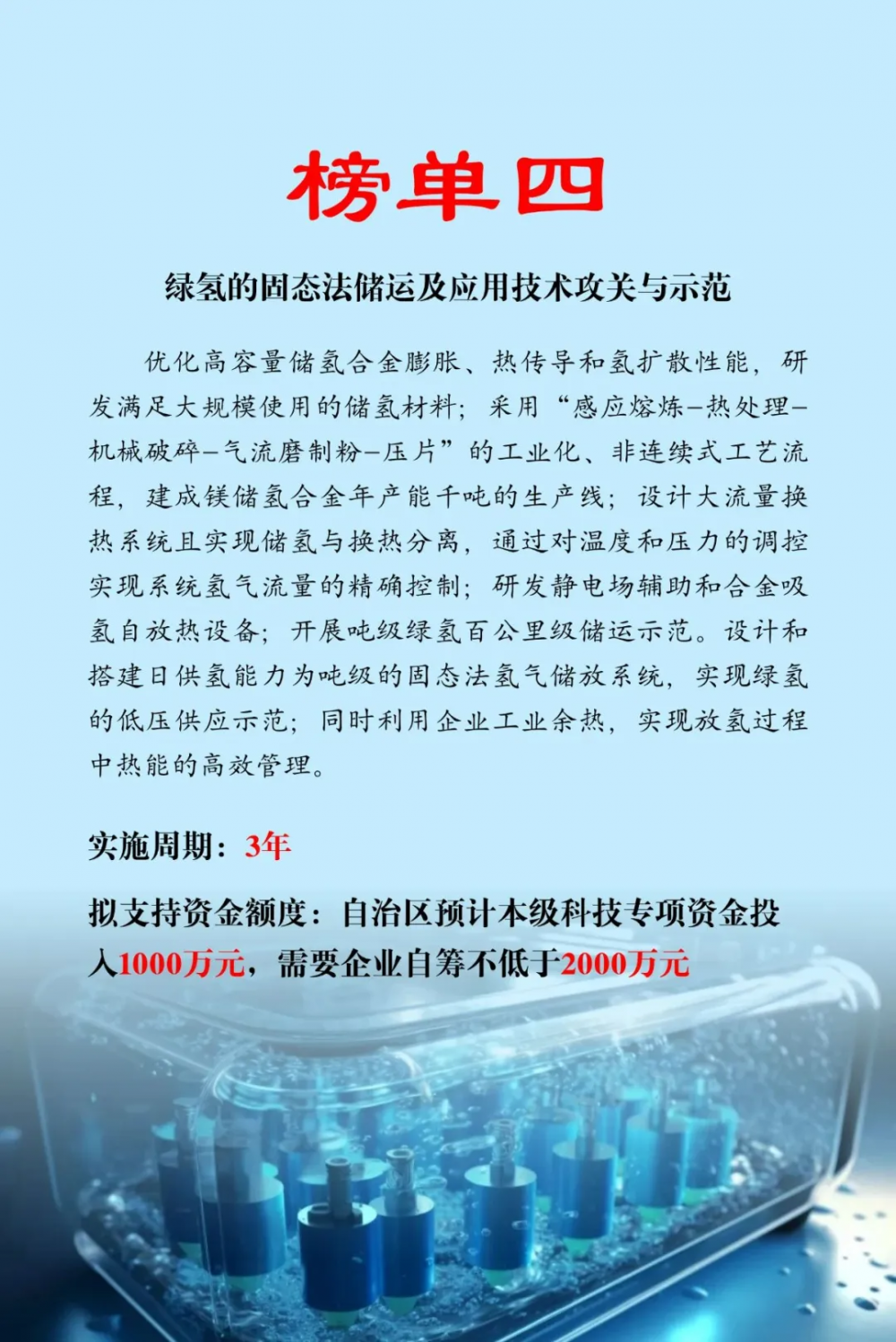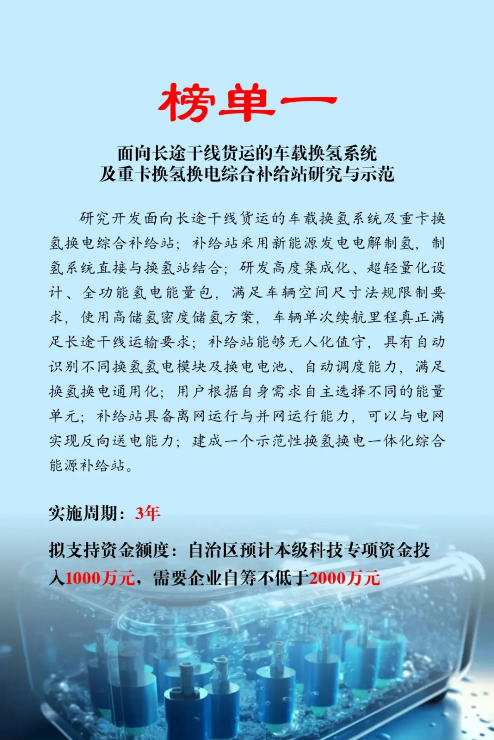 近日,內蒙(meng)古(gu)自(zi)治區(qu)科學技(ji)術(shu)(shu)廳發布2025年科技(ji)突圍專(zhuan)項技(ji)術(shu)(shu)榜單,榜單分為人工智能(neng)+、低空(kong)經濟、生物(wu)技(ji)術(shu)(shu)、氫(qing)能(neng)四個方(fang)向。其中氫(qing)能(neng)榜單共(gong)(gong)6項,涉及科技(ji)專(zhuan)項資(zi)金補貼共(gong)(gong)6000萬元。