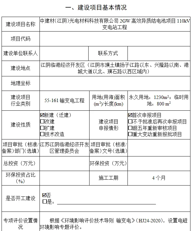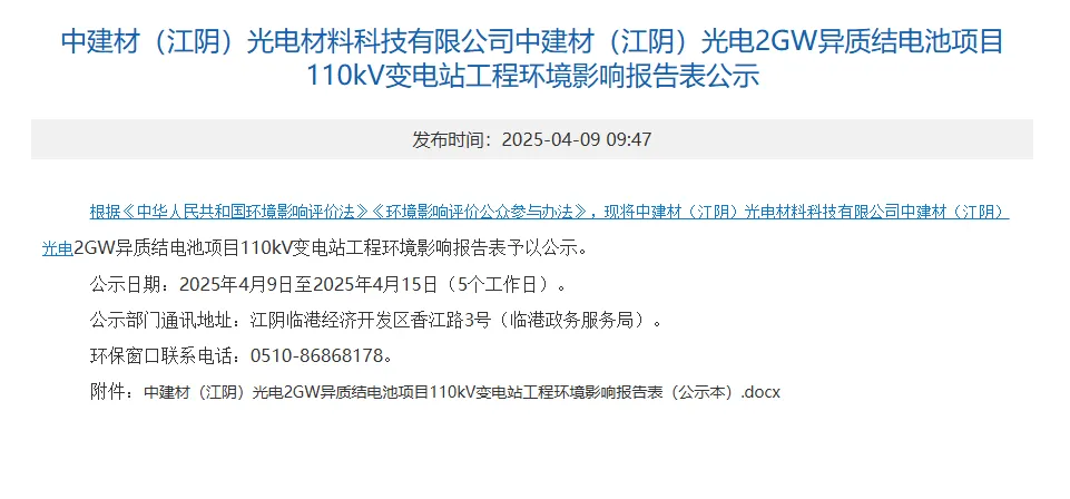 4月9日江陰市人民政府發布了《中建(jian)材(cai)(江陰)光電(dian)材(cai)料科技有限公司(si)中建(jian)材(cai)(江陰)光電(dian)2GW異質結電(dian)池項目(mu)110kV變(bian)電(dian)站工(gong)程環境影響(xiang)報告表公示》。 以(yi)下為(wei)文件原文: 根據《中(zhong)(zhong)華人民共和國環境(jing)影(ying)(ying)響(xiang)評價(jia)法》《環境(jing)影(ying)(ying)響(xiang)評價(jia)公眾參與辦法》,現將中(zhong)(zhong)建(jian)材(江陰)光電(dian)材料科技有限公司(si)中(zhong)(zhong)建(jian)材(江陰)光電(dian)2GW異質結(jie)電(dian)池項目110kV變電(dian)站工程環境(jing)影(ying)(ying)響(xiang)報告表予以(yi)公示。 公示日期:2025年4月9日至2025年4月15日(5個工作日)。 公示部門通(tong)訊地(di)址(zhi):江陰臨(lin)(lin)港經濟開發區香江路3號(hao)(臨(lin)(lin)港政務服務局)。 環保窗口聯系電話(hua):0510-86868178。 附件:中建(jian)材(cai)(江陰)光電2GW異質(zhi)結電池項目(mu)110kV變電站工程環(huan)境(jing)影響(xiang)報告表(公(gong)示本).docx