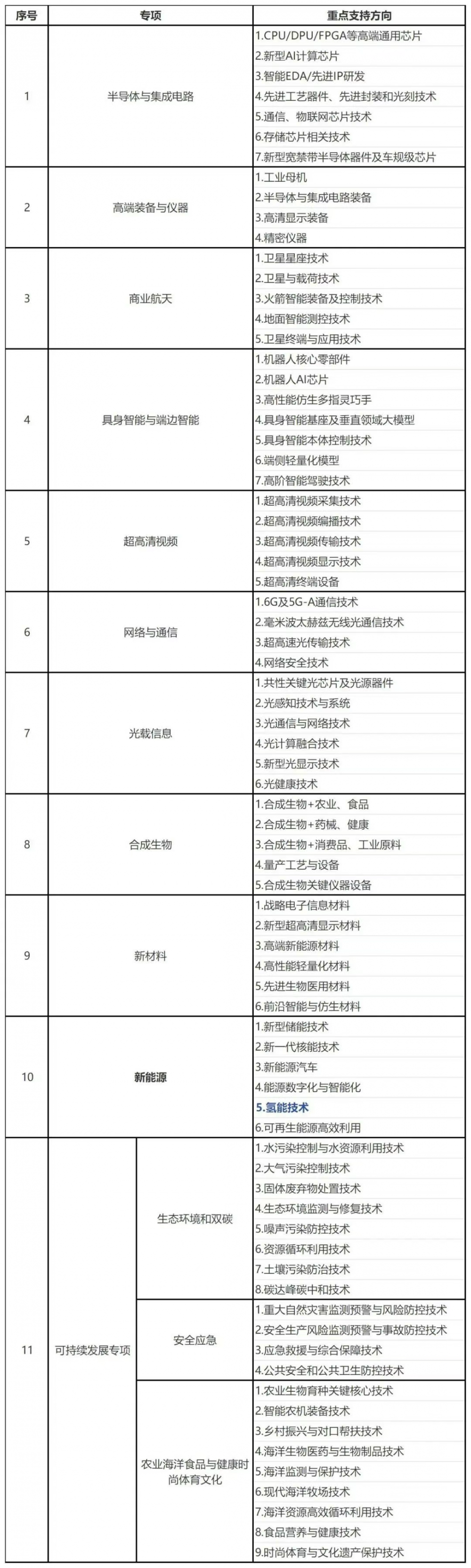 近(jin)日,深(shen)圳市科技(ji)創新(xin)局發(fa)布了2025年度深(shen)圳市重點(dian)(dian)產業研(yan)發(fa)計劃備選課題(第一批)的(de)征集(ji)通知,其中(zhong)新(xin)能(neng)源專項中(zhong)的(de)重點(dian)(dian)支持方向(xiang)包(bao)括新(xin)型儲能(neng)技(ji)術、新(xin)一代核能(neng)技(ji)術、新(xin)能(neng)源汽車、能(neng)源數字化與智能(neng)化、氫能(neng)技(ji)術和可再生能(neng)源高效利用(yong)六(liu)大方向(xiang)。 其中(zhong),氫能技術(shu)圍(wei)繞關鍵材料、前沿制氫技術(shu)、儲運技術(shu)、系統研發等方向進行重點支持: 關(guan)鍵材(cai)料:質子交換(huan)膜、高(gao)效催化劑、氣體擴散(san)層、超薄雙極(ji)板(ban)、固體合金儲(chu)氫材(cai)料等(deng);· 前(qian)沿制(zhi)氫技(ji)術:攻關(guan)海(hai)水制(zhi)氫、高(gao)溫(wen)(wen)固體氧化物電解池制(zhi)氫、核能高(gao)溫(wen)(wen)制(zhi)氫等(deng);· 儲(chu)運(yun)技(ji)術:發展(zhan)低溫(wen)(wen)液態(tai)儲(chu)氫、高(gao)壓微管儲(chu)氫、液態(tai)有(you)機物儲(chu)氫等(deng)儲(chu)運(yun)技(ji)術,突(tu)破70MPa高(gao)壓儲(chu)氫瓶及設備輕量化、安全預警控制(zhi)等(deng)難題(ti)。 系(xi)統(tong)研(yan)發:研(yan)究固體氧化物(wu)燃料(liao)電(dian)池/電(dian)解池系(xi)統(tong)衰(shuai)減機(ji)理,推(tui)動(dong)“鋰電(dian)-氫能(neng)”混合儲能(neng)系(xi)統(tong)研(yan)發,探索(suo)“光(guang)儲氫一(yi)體化”微電(dian)網項目,促(cu)進協同創新。 提交時間截(jie)至2025年4月21日18:00。 原文如下: 深圳市科技創新局關于征集2025年度深圳市重點產業研發計劃備選課題(第一批)的通知 各有關單位: 為(wei)打造最好(hao)科技創(chuang)(chuang)新生態和人才發展(zhan)環境,推(tui)動我市(shi)產(chan)業科技創(chuang)(chuang)新,提升(sheng)我市(shi)科技攻關體系化能力,我局將(jiang)組(zu)織實施(shi)2025年度深圳市(shi)重(zhong)點產(chan)業研(yan)發計(ji)劃。現面向我市(shi)企業、高校、科研(yan)機(ji)構、醫療衛生機(ji)構等征(zheng)集備選課題,征(zheng)集的課題將(jiang)作為(wei)2025年度深圳市(shi)重(zhong)點產(chan)業研(yan)發計(ji)劃指(zhi)南編制(zhi)參考。 一、征集的專項及重點支持方向 二、征集原則 課題征集(ji)面向上(shang)述表格所列領域和方向,請嚴格按照征集(ji)要求提交,不(bu)符合的(de)課題將不(bu)予采納(na)。建(jian)議資助金額1000萬元以上(shang)(含)的(de)課題,應上(shang)傳重大課題情況說明(模板可在(zai)業務管理系統下載,各建(jian)議單位均需加蓋公章(zhang))。 三、注意事項 (一)提交時間:2025年3月31日起至2025年4月21日18:00。 (二)提(ti)交方式:登錄(lu)深圳市科(ke)技業(ye)務管理系統(//sticapply.sz.gov.cn)“項目征集(ji)(ji)”欄目在線填報(bao)(可(ke)持續發(fa)展專項選擇(ze)“重點產(chan)業(ye)研發(fa)計(ji)劃(可(ke)持續發(fa)展專項)征集(ji)(ji)”入口,其余專項選擇(ze)“重點產(chan)業(ye)研發(fa)計(ji)劃課題(ti)征集(ji)(ji)”入口)。 (三)備(bei)選課題應(ying)有可量化(hua)考(kao)核的(de)技術指(zhi)標。 (四)可持續(xu)發(fa)展專(zhuan)項(專(zhuan)項11)高校、科研(yan)機構牽頭(tou)提(ti)交(jiao)課(ke)(ke)題(ti)數(shu)(shu)量(liang)(liang)不超過(guo)5個(ge)(ge),其他單(dan)位(wei)牽頭(tou)提(ti)交(jiao)課(ke)(ke)題(ti)數(shu)(shu)量(liang)(liang)不超過(guo)2個(ge)(ge);其他專(zhuan)項(專(zhuan)項1-10)每家單(dan)位(wei)牽頭(tou)提(ti)交(jiao)課(ke)(ke)題(ti)數(shu)(shu)量(liang)(liang)不超過(guo)2個(ge)(ge)。2023或2024年度研(yan)究開發(fa)費用支出超過(guo)5億(yi)元的(de)企業不受此數(shu)(shu)量(liang)(liang)限制;同一備(bei)選課(ke)(ke)題(ti)不得重復提(ti)交(jiao),一經發(fa)現將取消本次提(ti)交(jiao)資格。 (五)本次征集的課題(ti)僅作為(wei)指南(nan)編制參考,課題(ti)是否被采(cai)納(na),我局(ju)不另行反饋。 四、其它事項 (一)深圳市(shi)重點產業研(yan)(yan)發計(ji)劃單個項目資(zi)助(zhu)強度(du)(du)最高(gao)不超過3000萬元。受科技研(yan)(yan)發資(zi)金年度(du)(du)總額控制,各專(zhuan)項發布課題(ti)有數量限制,一般只設少(shao)量資(zi)助(zhu)金額1000萬元以(yi)上的(de)課題(ti)、若干500萬元(含)-1000萬元(含)的(de)課題(ti)、適量500萬元以(yi)下的(de)課題(ti)。 (二)課(ke)題(ti)提交結束后我(wo)局將(jiang)組織評審、篩(shai)選、凝練(lian),形成2025年度(du)深圳市(shi)重點產業研(yan)發計(ji)劃項目申報指(zhi)南,以(yi)“揭榜掛帥”形式發布。 五、咨詢電話 半導體(ti)與集成電路、高(gao)端(duan)裝備與儀器、商業航天(tian):88102165,88121726,88100682具(ju)身智能與端(duan)邊智能、超高(gao)清視頻、網絡與通(tong)信(xin):88102496,88101447光載(zai)信(xin)息:88102692,88101862 合成(cheng)生物:88102693,88100637 新材料(liao)、新能(neng)源:88102187 可持續(xu)發(fa)展(zhan)專項:88101839,88103434,88101463 技(ji)術支持:86576087,86576088 咨詢時間:工作日9:00-12:00,14:00-18:00。 特此通知。 附件: 2025年3月31日