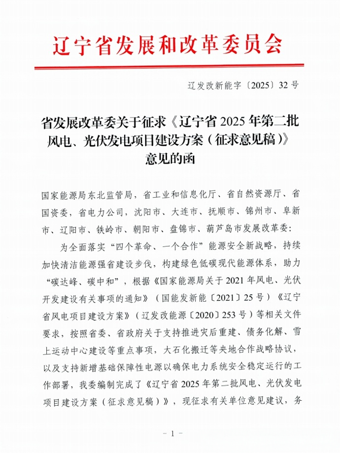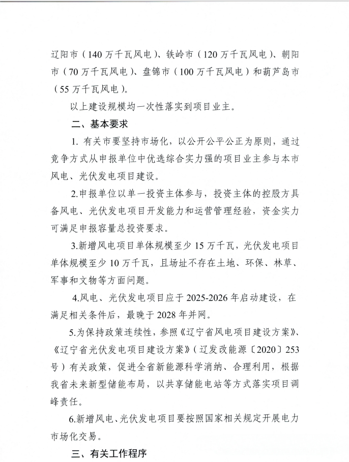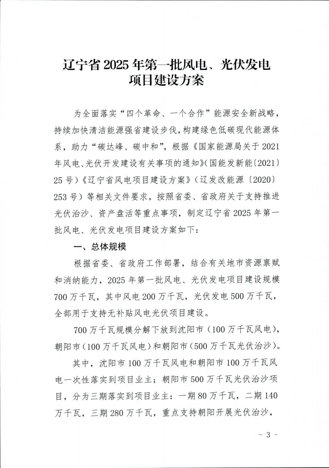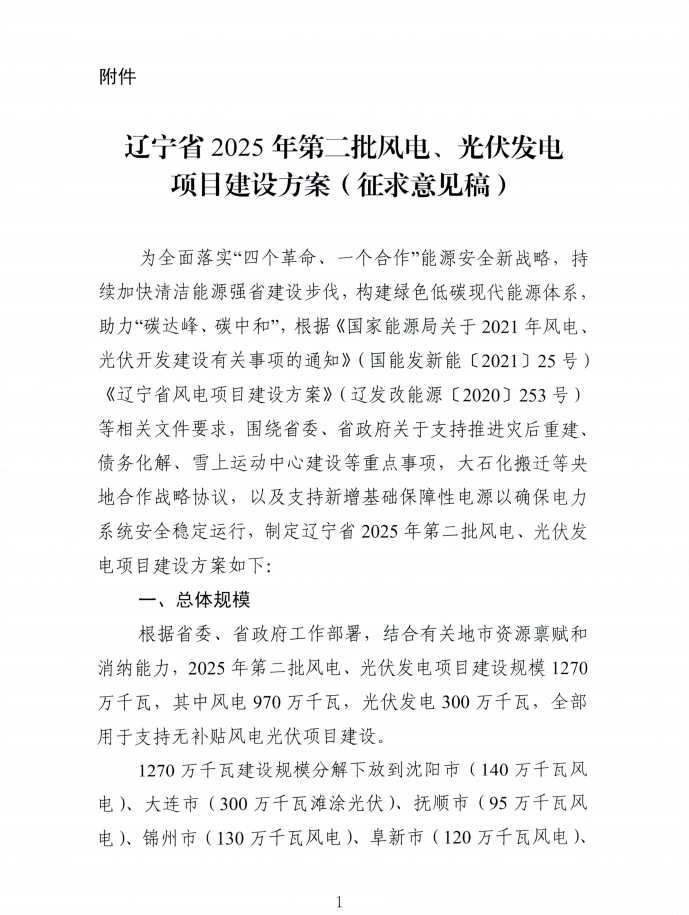 近日,遼寧發改委發布2025年第一批風光發電項目建設方案及第二批風電、光伏發電項目建設方案(征求意見稿),兩批總規模合計19.7GW。 具體來看,第一批風電、光伏發電項目建設規模700萬千瓦,其中風電200萬千瓦,光伏發電500萬千瓦,全部用于支持無補貼風電光伏項目建設。700萬千瓦規模分解下放到沈陽市(100萬千瓦風電),朝陽市(100萬千瓦風電)和朝陽市(500萬千瓦光伏治沙)。 第二批風電、光伏發電項目建設規模1270萬千瓦,其中風電970萬千瓦,光伏發電300萬千瓦,全部用于支持無補貼風電光伏項目建設。1270萬千瓦建設規模分解下放到沈陽市(140萬千瓦風電)、大連市(300萬千瓦灘涂光伏)、撫順市(95 萬千瓦風電 )、錦州市(130萬千瓦風電)、阜新市(120 萬千瓦風電)遼陽市(140 萬千瓦風電)、鐵嶺市(120萬千瓦風電)、朝陽市(70萬千瓦風電)、盤錦市(100萬千瓦風電)和葫蘆島市(55 萬千瓦風電)。 詳情見下:
