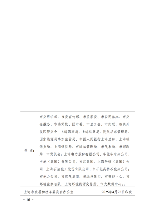 4月23日,上海發改委關于印發《上海市2025年碳達峰碳中和及節能減排重點工作安排》的通知。提出推動風光等可再生能源多元發展,全市光伏裝機規模突破500萬千瓦,金山一期海上風電力爭建成并網。可再生能源電力占比持續提升,綠電交易規模力爭超過70億千瓦時。推進綠色燃料產能建設,前瞻謀劃綠色燃料重大工程。 原文見下: 關于印發《上海市2025年碳達峰碳中和及節能減排重點工作安排》的通知 經市政府同意,現將《上海市2025年碳達峰碳中和及節能減排重點工作安排》印發給你們,請結合實際認真落實。 上海市發展和改革委員會 2025年4月22日 上海市2025年碳達峰碳中和及節能減排重點工作安排 2025年是“十四五”規劃收官之年,本市要堅持以習近平新時代中國特色社會主義思想為指導,全面貫徹黨的二十大和二十屆三中全會精神,深入貫徹習近平經濟思想和習近平生態文明思想,抓實抓細各項工作,為“十四五”收好尾、“十五五”開好頭。結合本市實際,現將2025年碳達峰碳中和及節能減排重點工作安排如下: 一、全面完成“十四五”規劃目標 完成全市“十四五”能耗雙控目標,各區、各行業、各重點區域夯實目標分解和推進機制,單位GDP能耗下降率按照完成“十四五”規劃總目標設置年度目標。努力推進全市碳排放強度下降。主要污染物氮氧化物、揮發性有機物、化學需氧量和氨氮工程減排量完成國家下達目標。持續控制煤炭消費總量。 二、不斷完善碳達峰碳中和綜合管理體系 持續開展節能目標管理,科學確定和分解市、區兩級節能目標。研究制定“十五五”碳排放雙控考核辦法。開展“十五五”上海市節能降碳和循環經濟發展規劃研究。推動15個綠色低碳轉型重點應用場景布局落地。推動綠色低碳供應鏈建設,建立完善產品碳足跡背景數據庫,開展重點產品碳標識認證試點。落實綠證與能耗雙控政策銜接,結合綠色低碳供應鏈建設、重點用能單位管理、節能審查等工作,推動重點單位購買綠證。 三、加快推進能源綠色低碳轉型 加快引入市外綠電資源,力爭蒙電入滬核準并開工,啟動首批深遠海風電示范項目建設。推動風光等可再生能源多元發展,全市光伏裝機規模突破500萬千瓦,金山一期海上風電力爭建成并網。可再生能源電力占比持續提升,綠電交易規模力爭超過70億千瓦時。推進綠色燃料產能建設,前瞻謀劃綠色燃料重大工程。 四、持續推動節能降碳增效 進一步完善兩高項目聯合評審機制,做好源頭管控,當所屬區或所屬領域未完成能耗雙控目標進度時,單位產值能耗超過全市工業平均水平的新建兩高項目,實施緩批限批,暫停節能審查批復。加緊制定出臺重點單位節能降碳管理辦法,持續推進能效診斷工作。 五、深入推進工業通信業領域碳達峰 加快吳涇等重點區域整體轉型,推動漕涇綜合能源二期等重大項目建設,推動化工產業集聚。實施落后產能調整項目450項。加快布局和培育綠色低碳新賽道產業發展,推動新型儲能、綠色燃料等產業高質量發展。加快數字賦能,推進年綜合能耗2000噸標準煤以上用能企業能源管理中心建設。落實“百一”行動計劃,推進100家重點用能單位完成能源審計。 六、系統推進城鄉建設領域碳達峰 推進城鄉建設領域碳達峰2025年階段性任務落地。推動全部民用建筑落實75%的節能設計要求,推進重點區域新建民用建筑全部執行超低能耗建筑及以上標準。持續推進既有建筑節能改造,完成600萬平方米以上。持續推進節約型機關、綠色商場、綠色餐廳、“無廢城市細胞”等建設。 七、加速推動交通領域綠色低碳轉型 加快完善低碳綜合運輸結構,至2025年底海鐵聯運量超過100萬TEU,完善軌道交通、市域鐵路站點公交配套服務,持續開展慢行交通出行品質項目。加速推進城市公共領域、非道路移動機械清潔能源或新能源轉型。推動航空、航運領域綠色燃料應用。完善充(換)電設施網絡,加大港口岸電建設和使用推廣,加大交通樞紐站場可再生能源利用。 八、大力發展循環經濟 持續加力擴圍推進“兩新”工作,擴大消費以舊換新補貼品類范圍。深入推進塑料污染治理、糧食節約和反食品浪費、快遞包裝綠色轉型等工作。加快推進濕垃圾集中資源化處置設施建設、生活垃圾分類設施設備改造提升。推進建筑廢棄混凝土資源化利用,拓展建筑垃圾資源化利用建材產品應用場景。持續推廣資源回收企業向自然人報廢產品出售者“反向開票”做法。 九、充分發揮科技創新核心支撐作用 深化本市未來能源和前沿顛覆性降碳技術戰略研究,制定綠色燃料、可控核聚變等重點領域前沿技術創新與未來產業培育的工作方案。實施綠色低碳科技創新攻關行動,落實一批未來能源前沿顛覆性技術攻關項目。培育一批節能低碳和新能源研究機構。定期征集和篩選綠色低碳先進技術和綠色低碳先進技術示范工程。 十、不斷提升碳匯能力 完成“千園工程”建設,全年新增城鄉公園120座,新建改建口袋公園60座,新建綠地1000公頃。持續推進造林工作,新建60個開放休閑林地。完成全市互花米草治理,鞏固互花米草治理成效。 十一、積極倡導綠色低碳全民參與 組織好全國生態日、全國節能宣傳周、全國低碳日、“六五”環境日主題宣傳活動。持續開展能效領跑者、綠色低碳出行月活動。舉辦2025年上海國際碳中和技術、產品