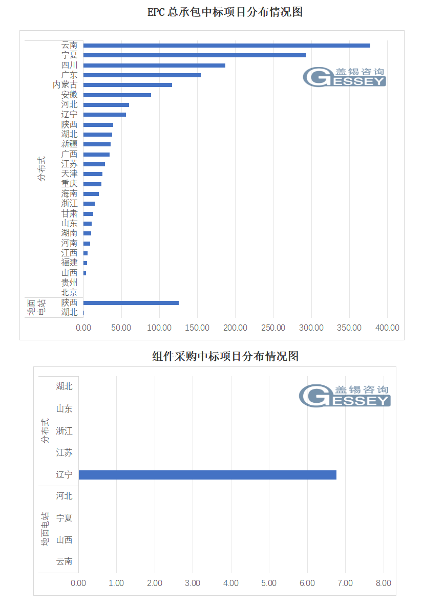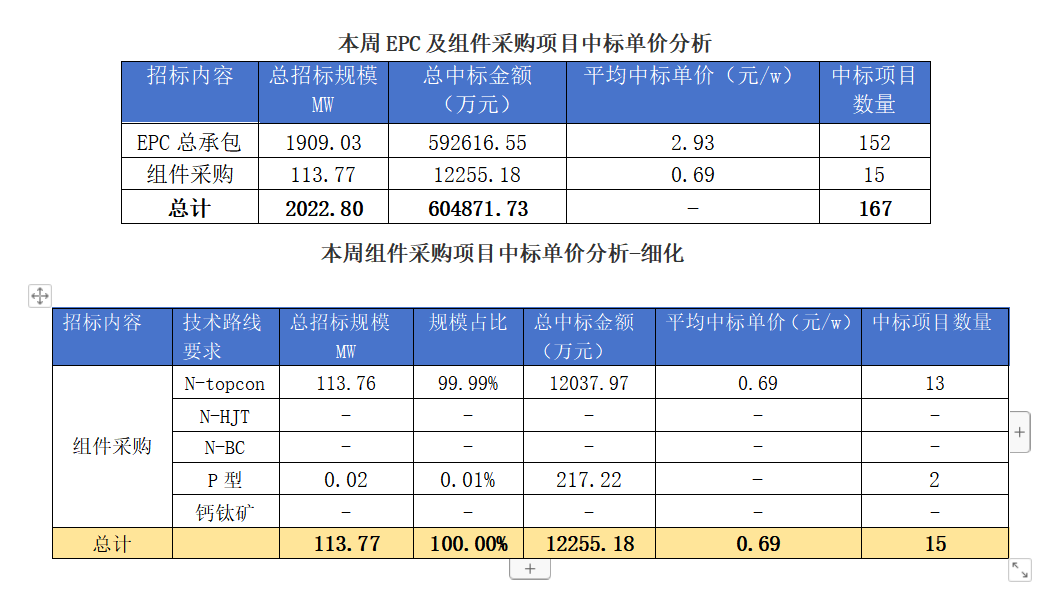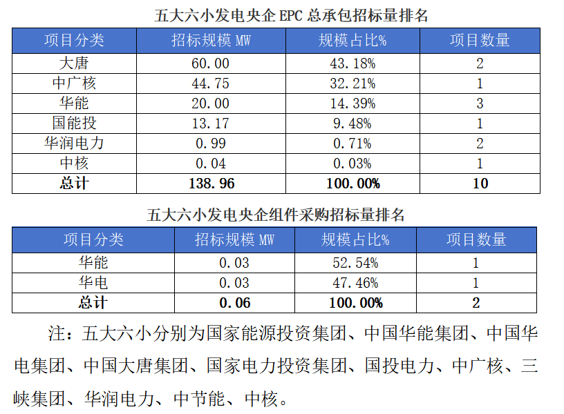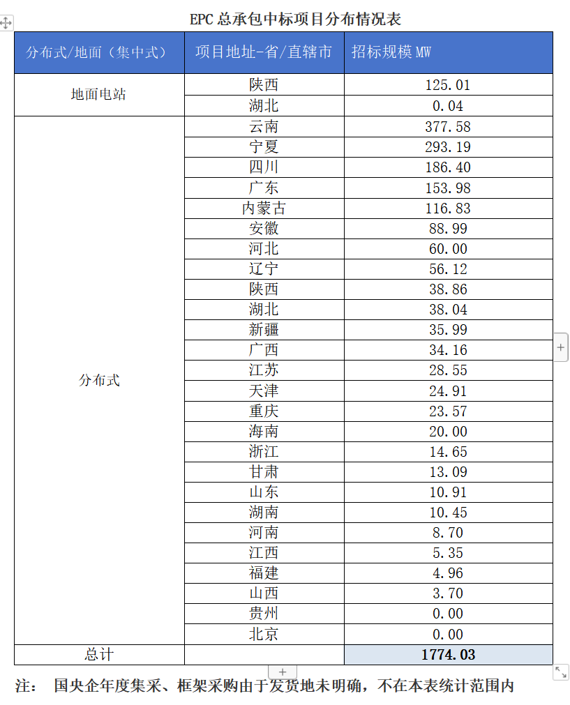 一、光伏項目招標情況匯總: 根據Gessey蓋錫(xi)咨詢統計(ji),4月19日-4月25日累計(ji)光伏招(zhao)標(biao)(biao)(biao)(biao)項(xiang)目(mu)(mu)為173個(ge),項(xiang)目(mu)(mu)規模(mo)合計(ji)為1968.17MW。光伏組(zu)件采購(gou)招(zhao)標(biao)(biao)(biao)(biao)項(xiang)目(mu)(mu)為16個(ge),招(zhao)標(biao)(biao)(biao)(biao)規模(mo)為26.30MW,EPC總承包招(zhao)標(biao)(biao)(biao)(biao)項(xiang)目(mu)(mu)為157個(ge),招(zhao)標(biao)(biao)(biao)(biao)規模(mo)為1941.87MW。 我們統(tong)計包(bao)含大(da)(da)型央企國企、地方(fang)能源集團、地方(fang)政府(fu)機關、兩大(da)(da)電(dian)網、央企總(zong)包(bao)企業、知名光伏企業等,其中五大(da)(da)六(liu)小發電(dian)央企占總(zong)招(zhao)標(biao)規模較(jiao)高,具體各企業排名如下表: 二、中標項目分布類型匯總情況 本周中(zhong)標(biao)項目需求按(an)照招標(biao)場景地分布(bu)(bu),分布(bu)(bu)式(shi)光伏主要(yao)(yao)集中(zhong)在(zai)云南、寧夏(xia)等(deng)地區,即(ji)主要(yao)(yao)集中(zhong)在(zai)西(xi)南部(bu)地區;集中(zhong)式(shi)光伏主要(yao)(yao)集中(zhong)在(zai)陜西(xi)、湖北等(deng)地區,即(ji)主要(yao)(yao)集中(zhong)在(zai)東部(bu)地區。 三、EPC總承包及組件采購情況匯總 本周光伏EPC總承包(bao)中(zhong)(zhong)標規模達(da)1909.03MW,總中(zhong)(zhong)標金額592616.55萬元(yuan),平均中(zhong)(zhong)標單價為3.17元(yuan)/W,中(zhong)(zhong)標數量(liang)152個。 本周光伏(fu)組件采購中(zhong)標規模(mo)達(da)113.77MW,總(zong)中(zhong)標金額12255.18萬(wan)元(yuan),平均(jun)中(zhong)標單價為0.69元(yuan)/W,中(zhong)標數量15個。