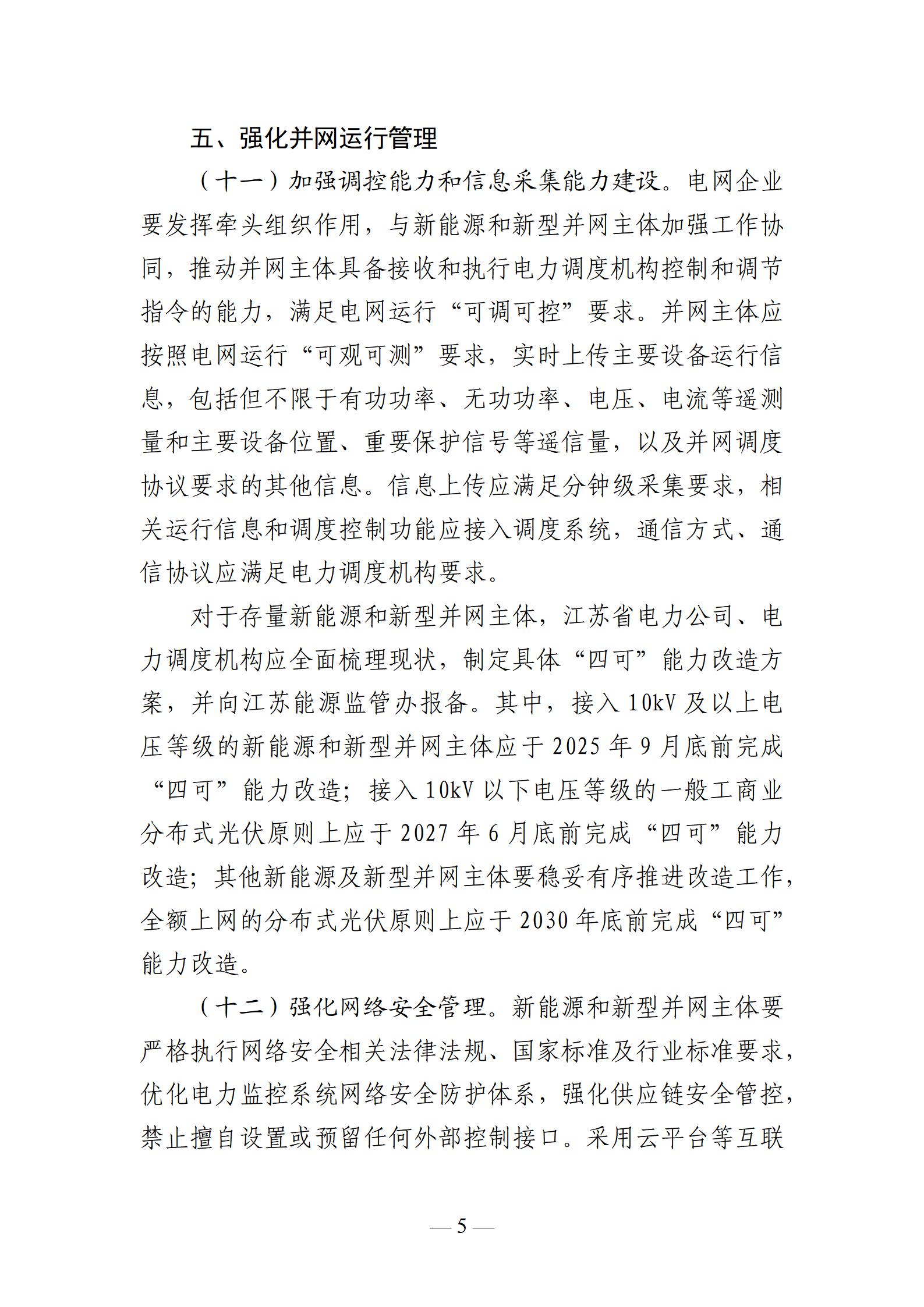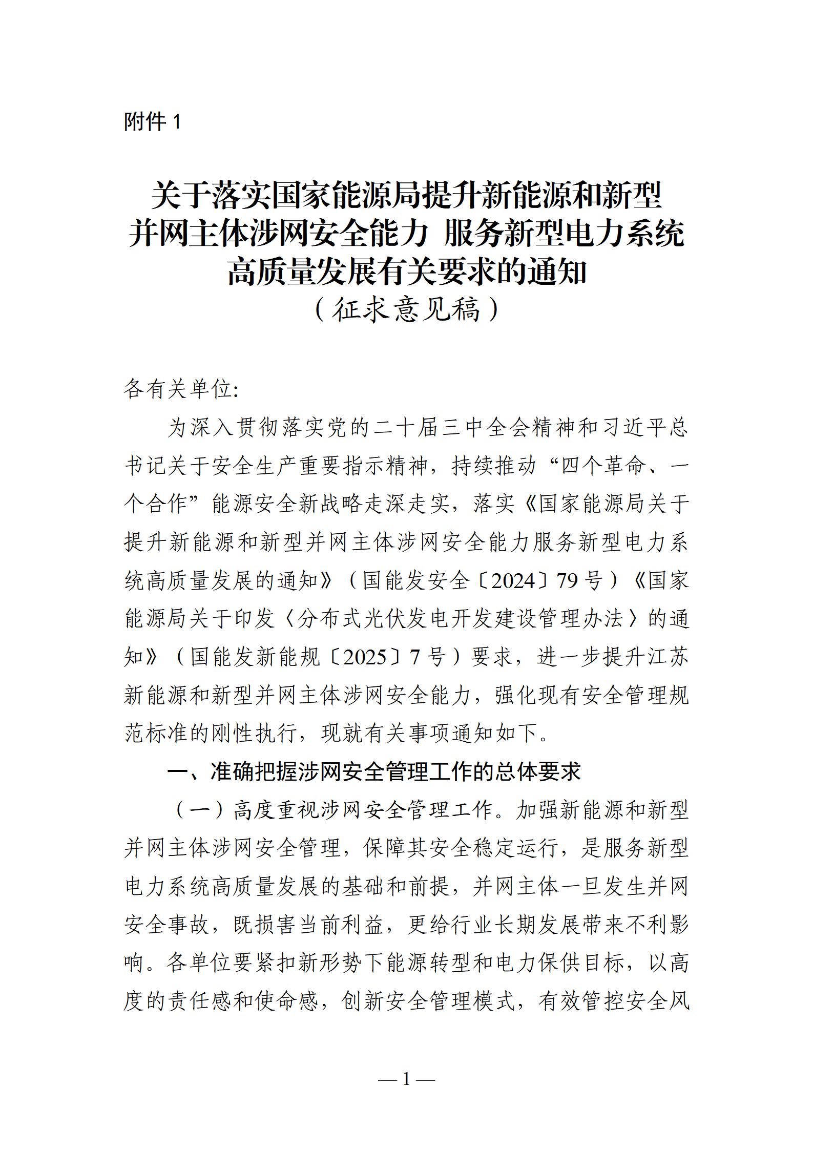 4月30日,江蘇能源監管辦關于公開征求《關于落實國家能源局提升新能源和新型并網主體涉網安全能力 服務新型電力系統高質量發展有關要求的通知(征求意見稿)》意見的公告,公告指出,對于存量新能源和新型并網主體,江蘇省電力公司、電力調度機構應全面梳理現狀,制定具體“四可”能力改造方案,并向江蘇能源監管辦報備。其中,接入10kV及以上電壓等級的新能源和新型并網主體應于2025年9月底前完成“四可”能力改造;接入10kV以下電壓等級的一般工商業分布式光伏原則上應于2027年6月底前完成“四可”能力改造;其他新能源及新型并網主體要穩妥有序推進改造工作,全額上網的分布式光伏原則上應于2030年底前完成“四可”能力改造。 原文如下: 江蘇能源監管辦關于公開征求《關于落實國家能源局提升新能源和新型并網主體涉網安全能力 服務新型電力系統高質量發展有關要求的通知(征求意見稿)》意見的公告 為貫徹落實《國家能源局關于提升新能源和新型并網主體涉網安全能力 服務新型電力系統高質量發展的通知》(國能發安全〔2024〕79號)和相關宣貫會議要求,我辦起草了《關于落實國家能源局提升新能源和新型并網主體涉網安全能力 服務新型電力系統高質量發展有關要求的通知(征求意見稿)》,現向社會公開征求意見。 此次征求意見時間為2025年4月30日至2025年5月10日。意見建議請通過電子郵件發至js_anquan@163.com。 感謝您的參與和支持! 國家能源局江蘇監管辦公室 2025年4月30日 上一篇: 國家電投啟動重大資產重組!