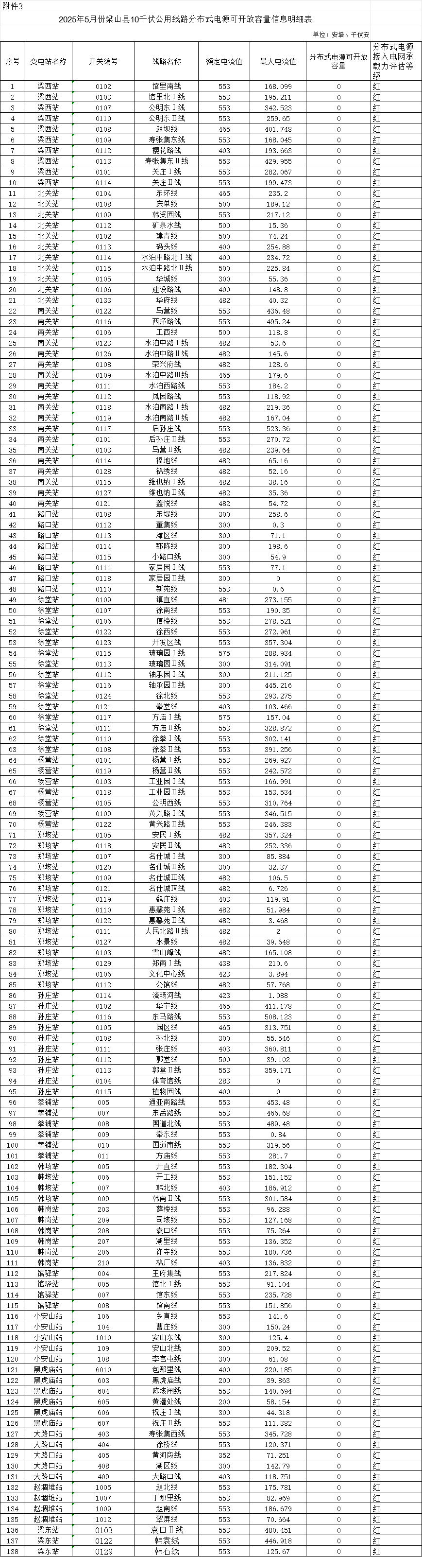 日(ri)前(qian),山東梁山縣公布(bu)2025年5月份(fen)分(fen)布(bu)式(shi)光伏可開放(fang)容(rong)量信(xin)息,2025年5月份(fen)變電(dian)(dian)站、公用線路、配(pei)電(dian)(dian)臺區分(fen)布(bu)式(shi)光伏可開放(fang)容(rong)量全部為紅色(se)。 原(yuan)文如下: 關于梁山縣2025年5月份分布式光伏可開放容量信息公開發布的公告 為積(ji)極響應(ying)國(guo)家“碳(tan)達峰、碳(tan)中和(he)”戰略部署,推動(dong)新能(neng)(neng)源(yuan)(yuan)科學有序(xu)安全(quan)發展(zhan),促進分(fen)布(bu)式(shi)(shi)光(guang)伏就近消納和(he)電(dian)力(li)平(ping)衡(heng),確保電(dian)力(li)系(xi)統安全(quan)穩(wen)定運行(xing)(xing)和(he)可(ke)(ke)(ke)(ke)靠供(gong)應(ying),根據國(guo)家能(neng)(neng)源(yuan)(yuan)局《電(dian)網(wang)公(gong)(gong)平(ping)開放監(jian)(jian)管辦(ban)法》(國(guo)能(neng)(neng)發監(jian)(jian)管規【2021】49號(hao))和(he)國(guo)家能(neng)(neng)源(yuan)(yuan)局山東(dong)監(jian)(jian)管辦(ban)公(gong)(gong)室《關(guan)于切實做好分(fen)布(bu)式(shi)(shi)光(guang)伏并(bing)網(wang)運行(xing)(xing)工(gong)作的(de)通知(zhi)》(魯監(jian)(jian)能(neng)(neng)安全(quan)規【2021】94號(hao))、 《分(fen)布(bu)式(shi)(shi)光(guang)伏發電(dian)開發建(jian)設(she)管理辦(ban)法》(國(guo)能(neng)(neng)發新能(neng)(neng)規〔2025〕7號(hao))有關(guan)要求,我局會同縣供(gong)電(dian)公(gong)(gong)司(si)對全(quan)縣光(guang)伏電(dian)站(zhan)并(bing)網(wang)可(ke)(ke)(ke)(ke)開放容(rong)量(liang)進行(xing)(xing)分(fen)析(xi),并(bing)建(jian)立(li)月度定期(qi)對外公(gong)(gong)示(shi)制度,現將(jiang)梁山縣2025年(nian)5月份變電(dian)站(zhan)、公(gong)(gong)用(yong)線路、配(pei)電(dian)臺(tai)區分(fen)布(bu)式(shi)(shi)光(guang)伏可(ke)(ke)(ke)(ke)開放容(rong)量(liang)、變電(dian)站(zhan)可(ke)(ke)(ke)(ke)利(li)用(yong)間(jian)隔信息予以(yi)公(gong)(gong)布(bu)。以(yi)上數據截止到2025年(nian)4月30日,實時(shi)可(ke)(ke)(ke)(ke)開放容(rong)量(liang)以(yi)供(gong)電(dian)公(gong)(gong)司(si)查詢(xun)為準。 特此公告。 附件(jian): 附件1:2025年5月份梁山縣(xian)公用變電站可(ke)開放容(rong)量信息明細表.xls 附件(jian)2:2025年(nian)5月份梁(liang)山縣公用變電站可(ke)利用間隔信息明(ming)細(xi)表.xls 附件3:2025年5月(yue)份梁山縣10千伏公用線路分布式電源可開(kai)放容量信息明細表.xls 附件4:2025年5月份(fen)梁山縣公用(yong)臺區(qu)可(ke)開(kai)放容量信息明細表(biao).xls 梁山(shan)(shan)縣發展和改革局國(guo)網山(shan)(shan)東省電力公(gong)司 梁山縣(xian)供電公司(si) 2025年5月(yue)7日