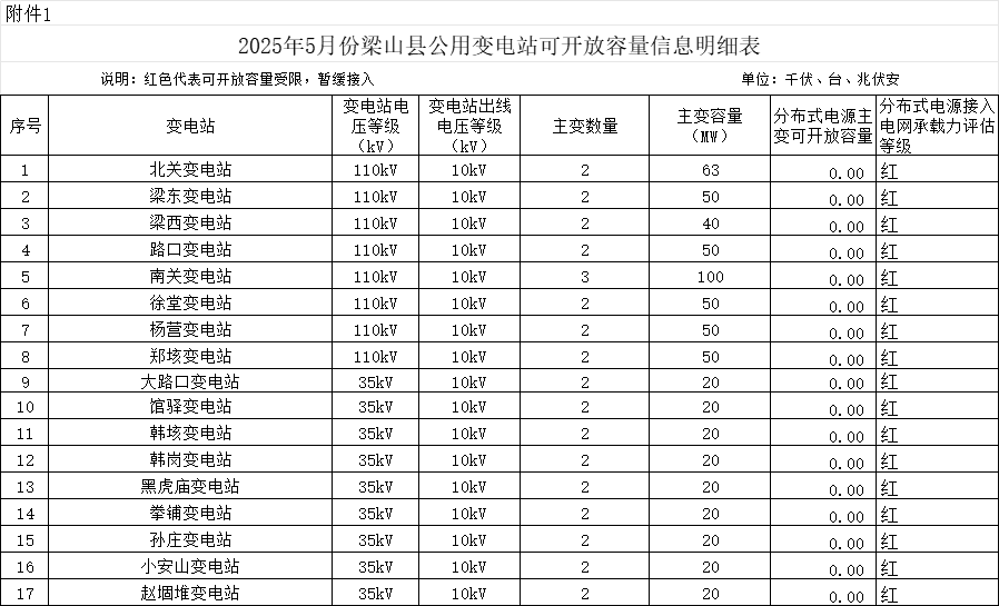 全部為紅色!山東梁山縣公布2025年5月份分布式光伏可開放容量2025-05-08 12:35來源:gessey瀏覽數:220次