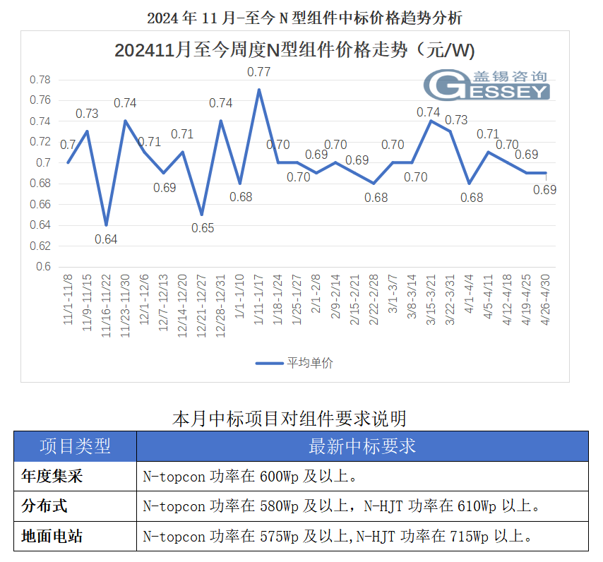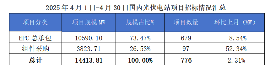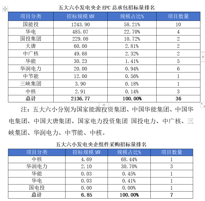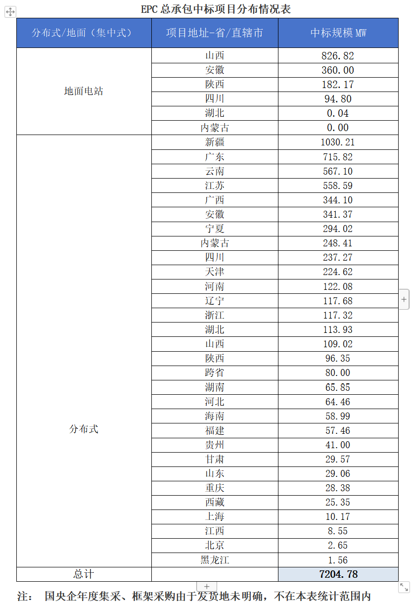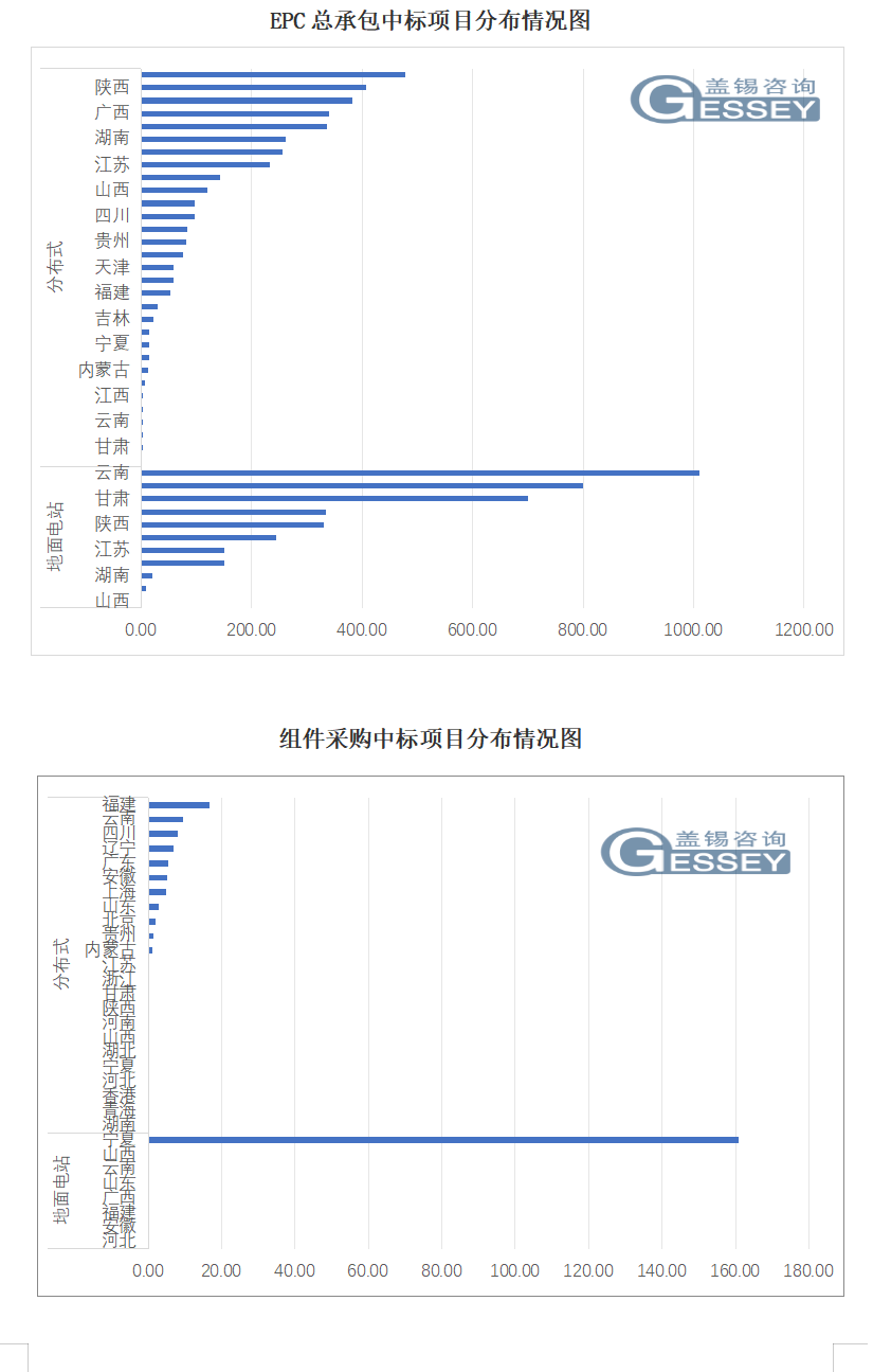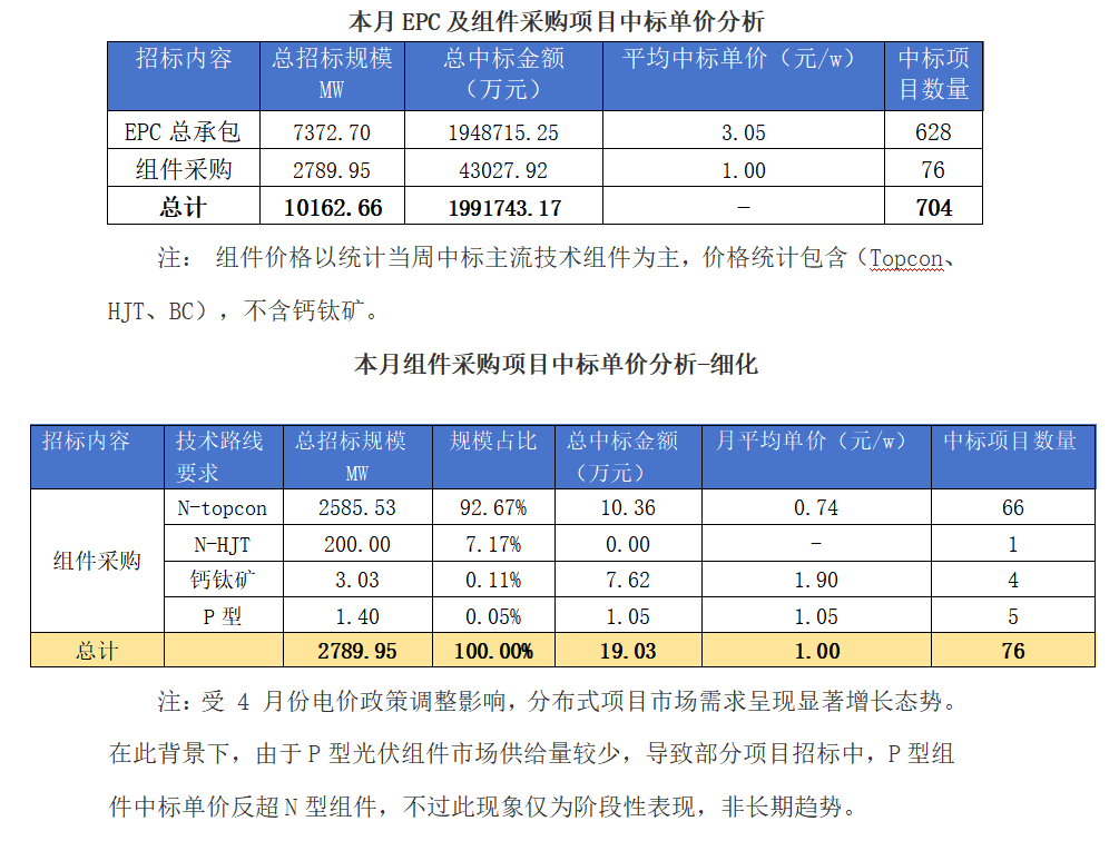 一、光伏項目招標情況匯總: 根據Gessey蓋(gai)錫(xi)咨詢統計,2025年4月(yue)1日-4月(yue)30日累計光(guang)伏招(zhao)(zhao)標(biao)(biao)(biao)(biao)項目(mu)(mu)(mu)為(wei)(wei)776個(ge),項目(mu)(mu)(mu)規(gui)模(mo)合計為(wei)(wei)14413.81MW。光(guang)伏組件采購招(zhao)(zhao)標(biao)(biao)(biao)(biao)項目(mu)(mu)(mu)為(wei)(wei)97個(ge),招(zhao)(zhao)標(biao)(biao)(biao)(biao)規(gui)模(mo)為(wei)(wei)3823.71MW,EPC總承包招(zhao)(zhao)標(biao)(biao)(biao)(biao)項目(mu)(mu)(mu)為(wei)(wei)679個(ge),招(zhao)(zhao)標(biao)(biao)(biao)(biao)規(gui)模(mo)為(wei)(wei)10590.10MW。 我們(men)統計包含大型央(yang)(yang)企(qi)(qi)國企(qi)(qi)、地(di)(di)方能源集團、地(di)(di)方政府(fu)機關、兩大電網(wang)、央(yang)(yang)企(qi)(qi)總(zong)包企(qi)(qi)業、知名光伏企(qi)(qi)業等(deng),其(qi)中五大六小(xiao)發電央(yang)(yang)企(qi)(qi)占總(zong)招標規模(mo)較(jiao)高,具體各(ge)企(qi)(qi)業排名如(ru)下表: 二、中標項目分布類型匯總情況 本月(yue)中(zhong)(zhong)(zhong)標(biao)項目需求按(an)照(zhao)招(zhao)標(biao)場景(jing)地(di)分布(bu),分布(bu)式(shi)光伏(fu)主(zhu)要(yao)集(ji)(ji)(ji)中(zhong)(zhong)(zhong)在云南(nan)、江蘇、四川、江西等(deng)地(di)區(qu),即主(zhu)要(yao)集(ji)(ji)(ji)中(zhong)(zhong)(zhong)在東南(nan)部地(di)區(qu);集(ji)(ji)(ji)中(zhong)(zhong)(zhong)式(shi)光伏(fu)主(zhu)要(yao)集(ji)(ji)(ji)中(zhong)(zhong)(zhong)在新疆、云南(nan)、寧夏、內蒙(meng)古等(deng)地(di)區(qu),即主(zhu)要(yao)集(ji)(ji)(ji)中(zhong)(zhong)(zhong)在西南(nan)部地(di)區(qu)。 三、EPC總承包及組件采購情況匯總 本月光伏EPC總(zong)承包中標規模達7372.70 MW,總(zong)中標金額1948715.25萬元,平(ping)均中標單價為3.05元/W,中標數量628個。 本(ben)月光伏組(zu)件(jian)采購中標(biao)規模達2789.95 MW,總(zong)中標(biao)金額43027.92萬元(yuan),平均中標(biao)單(dan)價為1.00元(yuan)/W,中標(biao)數(shu)量76個。
