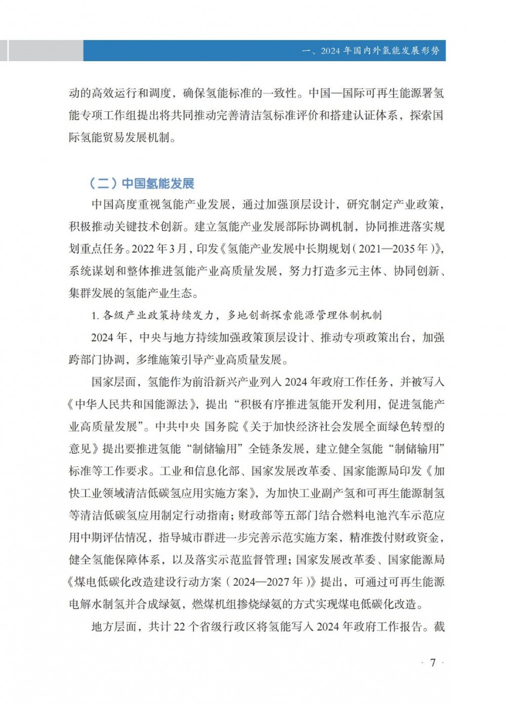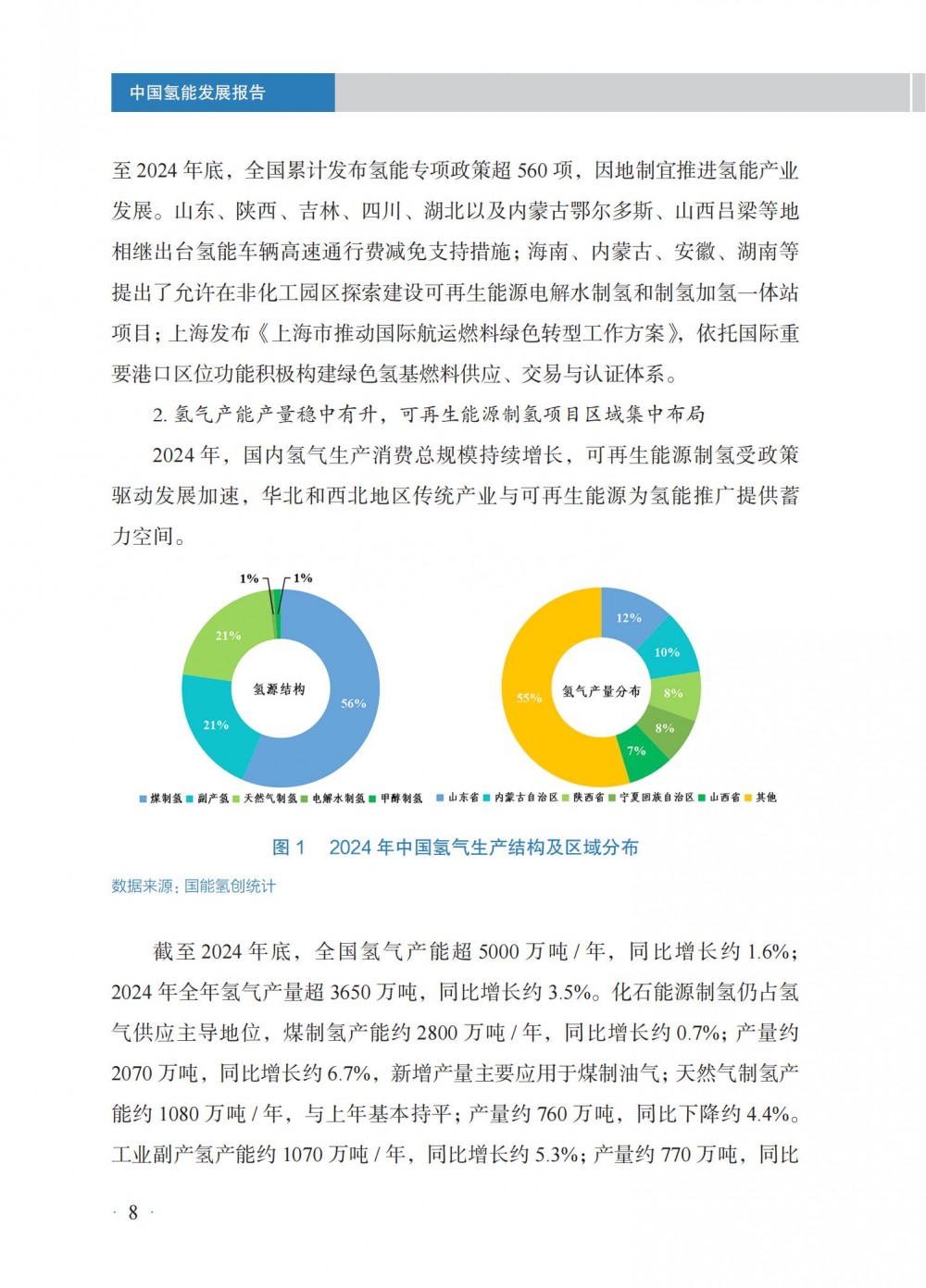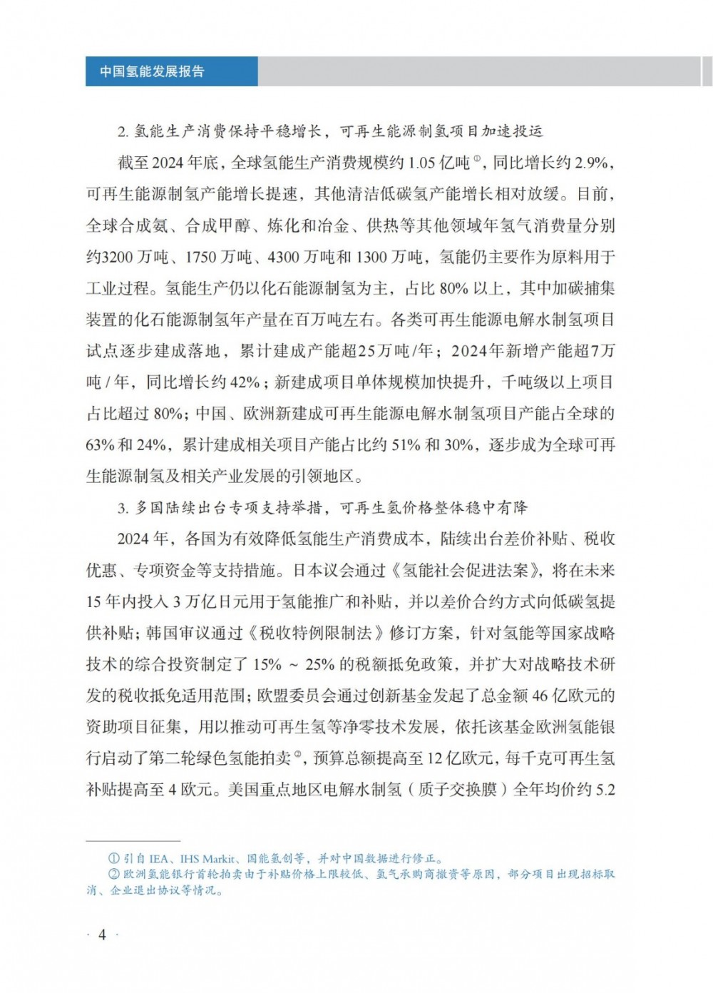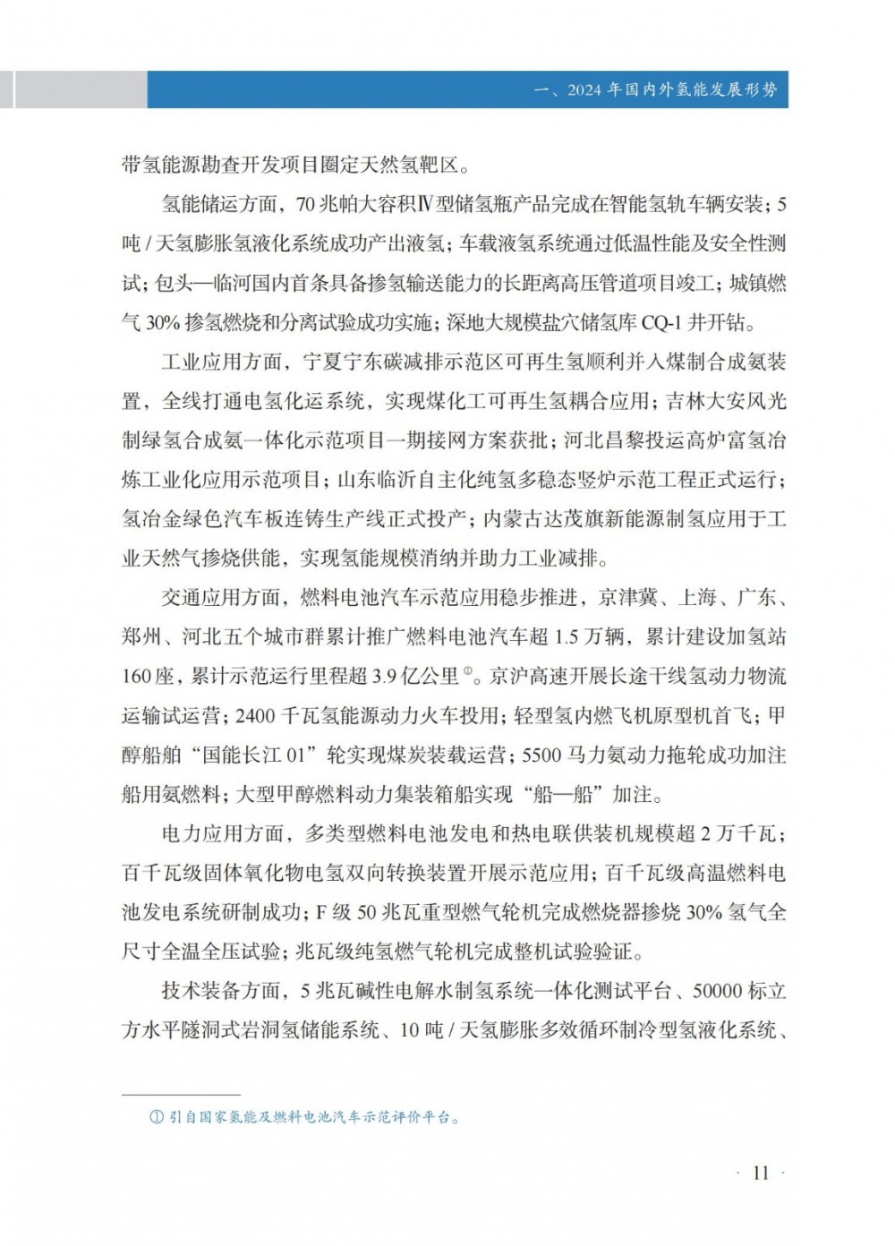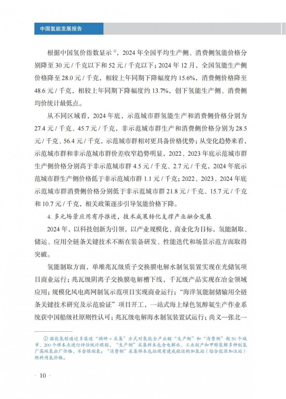 4月30日,國家能(neng)源局發(fa)布(bu)《中(zhong)國氫能(neng)發(fa)展報告(2025)》。 中國氫能發展 國(guo)家層面,氫能作(zuo)為前(qian)沿新興產業列入2024年政(zheng)府工作(zuo)任務,并被(bei)寫(xie)入《中(zhong)華人民共(gong)和國(guo)能源法》,提出“積極有序推進氫能開發利用,促進氫能產業高質(zhi)量發展”。 地方層(ceng)面,共計22個省級行政(zheng)區將氫(qing)能寫入2024年政(zheng)府工作報告。截至(zhi)2024年底,全國累(lei)計發(fa)布氫(qing)能專項政(zheng)策超(chao)560項,因地制宜推(tui)進氫(qing)能產業發(fa)展(zhan)。 截至2024年(nian)(nian)(nian)(nian)底,全國氫(qing)(qing)氣產(chan)能超(chao)5000萬(wan)噸/年(nian)(nian)(nian)(nian),同(tong)(tong)(tong)比(bi)(bi)增(zeng)(zeng)(zeng)長(chang)(chang)約(yue)(yue)(yue)(yue)(yue)1.6%;2024年(nian)(nian)(nian)(nian)全年(nian)(nian)(nian)(nian)氫(qing)(qing)氣產(chan)量超(chao)3650萬(wan)噸,同(tong)(tong)(tong)比(bi)(bi)增(zeng)(zeng)(zeng)長(chang)(chang)約(yue)(yue)(yue)(yue)(yue)3.5%。化(hua)石(shi)能源制氫(qing)(qing)仍占氫(qing)(qing)氣供應主導地位,煤制氫(qing)(qing)產(chan)能約(yue)(yue)(yue)(yue)(yue)2800萬(wan)噸/年(nian)(nian)(nian)(nian),同(tong)(tong)(tong)比(bi)(bi)增(zeng)(zeng)(zeng)長(chang)(chang)約(yue)(yue)(yue)(yue)(yue)0.7%;產(chan)量約(yue)(yue)(yue)(yue)(yue)2070萬(wan)噸,同(tong)(tong)(tong)比(bi)(bi)增(zeng)(zeng)(zeng)長(chang)(chang)約(yue)(yue)(yue)(yue)(yue)6.7%,新增(zeng)(zeng)(zeng)產(chan)量主要(yao)應用于煤制油氣;天(tian)然氣制氫(qing)(qing)產(chan)能約(yue)(yue)(yue)(yue)(yue)1080萬(wan)噸/年(nian)(nian)(nian)(nian),與上年(nian)(nian)(nian)(nian)基本持平;產(chan)量約(yue)(yue)(yue)(yue)(yue)760萬(wan)噸,同(tong)(tong)(tong)比(bi)(bi)下降約(yue)(yue)(yue)(yue)(yue)4.4%。工業副(fu)產(chan)氫(qing)(qing)產(chan)能約(yue)(yue)(yue)(yue)(yue)1070萬(wan)噸/年(nian)(nian)(nian)(nian),同(tong)(tong)(tong)比(bi)(bi)增(zeng)(zeng)(zeng)長(chang)(chang)約(yue)(yue)(yue)(yue)(yue)5.3%;產(chan)量約(yue)(yue)(yue)(yue)(yue)770萬(wan)噸,同(tong)(tong)(tong)比(bi)(bi)增(zeng)(zeng)(zeng)長(chang)(chang)約(yue)(yue)(yue)(yue)(yue)4.0%。電解水制氫(qing)(qing)產(chan)能約(yue)(yue)(yue)(yue)(yue)50萬(wan)噸/年(nian)(nian)(nian)(nian),同(tong)(tong)(tong)比(bi)(bi)增(zeng)(zeng)(zeng)長(chang)(chang)約(yue)(yue)(yue)(yue)(yue)9.7%;產(chan)量約(yue)(yue)(yue)(yue)(yue)32 萬(wan)噸,同(tong)(tong)(tong)比(bi)(bi)增(zeng)(zeng)(zeng)長(chang)(chang)約(yue)(yue)(yue)(yue)(yue)3.6%。 氫(qing)(qing)氣的(de)生產和(he)(he)消費(fei)主要分布在山東、內蒙古、陜西、寧夏、山西等傳(chuan)統重工業所在地(di)區(qu),合成甲醇、合成氨氫(qing)(qing)氣消費(fei)量(liang)占細分氫(qing)(qing)氣消費(fei)領域前兩位,分別約995萬(wan)噸和(he)(he)950萬(wan)噸,占比(bi)27%和(he)(he)26%;煉(lian)化和(he)(he)煤化工氫(qing)(qing)氣消費(fei)量(liang)分別約600萬(wan)噸、405萬(wan)噸,占全國氫(qing)(qing)氣消費(fei)量(liang)16%和(he)(he)11%。其(qi)他氫(qing)(qing)氣消費(fei)分布在交通、供熱、冶金等多個不同(tong)領域。 截(jie)至2024年(nian)底,全國(guo)各(ge)地(di)累計規劃建(jian)設可(ke)再(zai)生(sheng)能源電解水(shui)制氫項目(mu)超600個,其中,已建(jian)成(cheng)項目(mu)超90個,在(zai)建(jian)項目(mu)超80個;已建(jian)成(cheng)產(chan)能約(yue)12.5萬噸/年(nian),主要分(fen)布(bu)在(zai)華北和(he)西(xi)北地(di)區,分(fen)別約(yue)占全國(guo)已建(jian)成(cheng)可(ke)再(zai)生(sheng)能源電解水(shui)制氫產(chan)能45%和(he)44%。2024年(nian)新(xin)建(jian)成(cheng)項目(mu)35個,新(xin)增(zeng)產(chan)能約(yue)4.8萬噸/年(nian),同比增(zeng)長約(yue)62%。從下游消納場景看,主要應用(yong)于交通、煉化、合(he)成(cheng)氨、合(he)成(cheng)甲醇以及冶(ye)金、供熱、發電、儲能、科研等領(ling)域。 根據中國(guo)氫價指數顯示,2024年(nian)全國(guo)平均(jun)生(sheng)產側(ce)、消費側(ce)氫能價格(ge)分(fen)別(bie)降至(zhi)30元(yuan)/千(qian)(qian)克(ke)以(yi)下和52元(yuan)/千(qian)(qian)克(ke)以(yi)下;2024年(nian)12月,全國(guo)氫能生(sheng)產側(ce)價格(ge)降至(zhi)28.0元(yuan)/千(qian)(qian)克(ke),相較(jiao)上年(nian)同期下降幅度約15.6%,消費側(ce)價格(ge)降至(zhi)48.6元(yuan)/千(qian)(qian)克(ke),相較(jiao)上年(nian)同期下降幅度約13.7%,創下氫能生(sheng)產側(ce)、消費側(ce)均(jun)價統計(ji)最低(di)點(dian)。 從不同區域看(kan),2024年(nian)底(di),示范(fan)(fan)(fan)城(cheng)(cheng)(cheng)市(shi)群氫(qing)能生(sheng)(sheng)產(chan)和(he)消(xiao)(xiao)費(fei)(fei)側價(jia)格(ge)(ge)(ge)分(fen)別(bie)(bie)為27.4元(yuan)(yuan)/千克(ke)、45.7元(yuan)(yuan)/千克(ke),非示范(fan)(fan)(fan)城(cheng)(cheng)(cheng)市(shi)群生(sheng)(sheng)產(chan)和(he)消(xiao)(xiao)費(fei)(fei)側價(jia)格(ge)(ge)(ge)分(fen)別(bie)(bie)為28.5元(yuan)(yuan)/千克(ke)、56.4元(yuan)(yuan)/千克(ke),示范(fan)(fan)(fan)城(cheng)(cheng)(cheng)市(shi)群相(xiang)對更(geng)具備價(jia)格(ge)(ge)(ge)優(you)勢(shi)(shi);從變化(hua)趨勢(shi)(shi)來(lai)看(kan),示范(fan)(fan)(fan)城(cheng)(cheng)(cheng)市(shi)群和(he)非示范(fan)(fan)(fan)城(cheng)(cheng)(cheng)市(shi)群價(jia)差收窄趨勢(shi)(shi)明顯,2022、2023年(nian)底(di)示范(fan)(fan)(fan)城(cheng)(cheng)(cheng)市(shi)群生(sheng)(sheng)產(chan)側價(jia)格(ge)(ge)(ge)分(fen)別(bie)(bie)高(gao)于非示范(fan)(fan)(fan)城(cheng)(cheng)(cheng)市(shi)群4.5元(yuan)(yuan)/千克(ke)、2.7元(yuan)(yuan)/千克(ke),2024年(nian)底(di)示范(fan)(fan)(fan)城(cheng)(cheng)(cheng)市(shi)群生(sheng)(sheng)產(