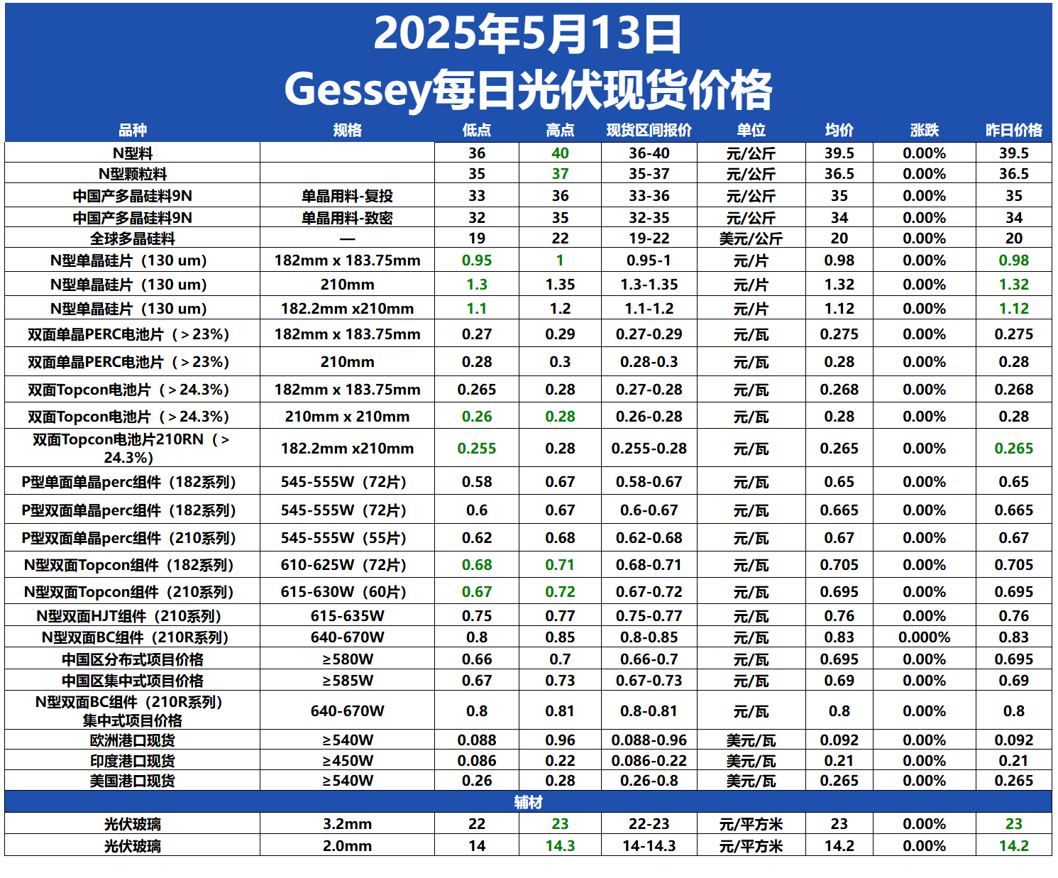 Gessey:5月13日每日光伏市場行情2025-05-13 18:25來源:gessey瀏覽數:291次