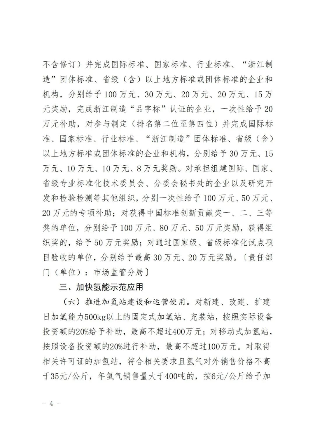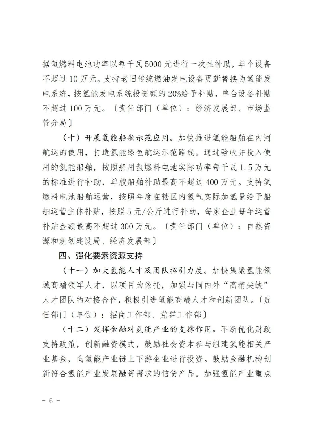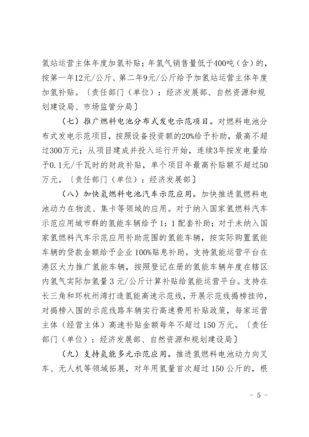 近日,浙江乍浦(pu)經濟開發(fa)區(嘉興港區)管(guan)理(li)委員會辦公室發(fa)布《關于(yu)進一步推動氫能產業(ye)高(gao)質量發(fa)展的若干政策意見》。 文(wen)件(jian)指出,聚焦制(zhi)氫(qing)裝(zhuang)(zhuang)備、儲存(cun)裝(zhuang)(zhuang)備、運輸裝(zhuang)(zhuang)備、加注裝(zhuang)(zhuang)備、燃料電池核心零部件(jian)裝(zhuang)(zhuang)備、關(guan)鍵材(cai)料和(he)氫(qing)能服務業(ye)等(deng)領域(yu),強化項(xiang)(xiang)目(mu)(mu)(mu)有(you)效投(tou)資。對制(zhi)造(zao)業(ye)項(xiang)(xiang)目(mu)(mu)(mu)設(she)備投(tou)資2000萬(wan)元(含)以上的,按設(she)備投(tou)資額(e)的10%給予補(bu)助,單個(ge)項(xiang)(xiang)目(mu)(mu)(mu)最高(gao)(gao)不(bu)超(chao)過(guo)2000萬(wan)元。對檢驗(yan)檢測、車輛運營(ying)、安全維(wei)護(hu)等(deng)氫(qing)能生產性(xing)服務業(ye)項(xiang)(xiang)目(mu)(mu)(mu),新(xin)建項(xiang)(xiang)目(mu)(mu)(mu)投(tou)資額(e)達到1000萬(wan)元(含)以上且已竣工(gong)驗(yan)收、交付使(shi)用,并通過(guo)審(shen)計的,按照項(xiang)(xiang)目(mu)(mu)(mu)實(shi)際投(tou)資額(e)(不(bu)含土(tu)地款)的5%一次性(xing)給予補(bu)助,新(xin)建項(xiang)(xiang)目(mu)(mu)(mu)最高(gao)(gao)不(bu)超(chao)過(guo)300萬(wan)元。 面(mian)向(xiang)氫(qing)(qing)能全產(chan)業(ye)鏈,培育一批專精特新企(qi)業(ye)、“隱形冠軍”企(qi)業(ye)和(he)“單項(xiang)冠軍”企(qi)業(ye);面(mian)向(xiang)氫(qing)(qing)能裝備檢測、車(che)輛維(wei)護(hu)、安全培訓等(deng),培育一批服務類企(qi)業(ye)。對新認定的氫(qing)(qing)能領域“單項(xiang)冠軍”企(qi)業(ye)、專精特新“小巨(ju)人”企(qi)業(ye)和(he)“隱形冠軍”企(qi)業(ye)分別(bie)給予300萬元、150萬元和(he)100萬元獎勵。 推進(jin)加氫(qing)(qing)(qing)站(zhan)(zhan)(zhan)建(jian)(jian)設(she)和運(yun)營使用(yong)。對新建(jian)(jian)、改建(jian)(jian)、擴(kuo)建(jian)(jian)日加氫(qing)(qing)(qing)能(neng)力500kg以(yi)上(shang)的(de)固定式(shi)加氫(qing)(qing)(qing)站(zhan)(zhan)(zhan)、充裝站(zhan)(zhan)(zhan),按照實際設(she)備(bei)投資(zi)額(e)的(de)20%給予補(bu)助,最(zui)高(gao)不超過(guo)400萬元(yuan)(yuan);對移動式(shi)加氫(qing)(qing)(qing)站(zhan)(zhan)(zhan),按照設(she)備(bei)投資(zi)額(e)的(de)20%進(jin)行補(bu)助,最(zui)高(gao)不超過(guo)100萬元(yuan)(yuan)。對取得相關許可證的(de)加氫(qing)(qing)(qing)站(zhan)(zhan)(zhan),符合相關要求且氫(qing)(qing)(qing)氣(qi)對外銷(xiao)(xiao)售價格不高(gao)于35元(yuan)(yuan)/公斤,年氫(qing)(qing)(qing)氣(qi)銷(xiao)(xiao)售量大于400噸(dun)的(de),按6元(yuan)(yuan)/公斤給予加氫(qing)(qing)(qing)站(zhan)(zhan)(zhan)運(yun)營主體(ti)年度(du)加氫(qing)(qing)(qing)補(bu)貼(tie);年氫(qing)(qing)(qing)氣(qi)銷(xiao)(xiao)售量低于400噸(dun)(含)的(de),按第(di)一(yi)年12元(yuan)(yuan)/公斤、第(di)二年9元(yuan)(yuan)/公斤給予加氫(qing)(qing)(qing)站(zhan)(zhan)(zhan)運(yun)營主體(ti)年度(du)加氫(qing)(qing)(qing)補(bu)貼(tie)。 推廣燃料電池(chi)分布(bu)式發(fa)電示范(fan)項(xiang)(xiang)目。對燃料電池(chi)分布(bu)式發(fa)電示范(fan)項(xiang)(xiang)目,按(an)照設備投(tou)資額(e)的20%給予補助,最高不(bu)超過(guo)300萬(wan)元(yuan);從項(xiang)(xiang)目建成并投(tou)入運(yun)行開始,連續(xu)3年(nian)按(an)發(fa)電量給予0.1元(yuan)/千瓦(wa)時的財政補貼(tie)(tie),單個項(xiang)(xiang)目年(nian)最高補貼(tie)(tie)額(e)不(bu)超過(guo)50萬(wan)元(yuan)。 支(zhi)(zhi)持(chi)氫(qing)能多元示范應(ying)用(yong)。推進氫(qing)燃(ran)料(liao)電(dian)池(chi)動力向叉(cha)車、無人機等(deng)領域(yu)拓展,對年用(yong)氫(qing)量首(shou)次超過(guo)150公斤的,根據(ju)氫(qing)燃(ran)料(liao)電(dian)池(chi)功率以每千瓦5000元進行(xing)一次性(xing)補(bu)助,單個設(she)備(bei)(bei)不(bu)超過(guo)10萬元。支(zhi)(zhi)持(chi)老舊(jiu)傳(chuan)統(tong)燃(ran)油發(fa)電(dian)設(she)備(bei)(bei)更新(xin)替(ti)換(huan)為氫(qing)能發(fa)電(dian)系統(tong),按氫(qing)能發(fa)電(dian)系統(tong)投(tou)資額的20%給予補(bu)貼,單臺設(she)備(bei)(bei)補(bu)貼不(bu)超過(guo)100萬元。 開展氫(qing)(qing)能(neng)船(chuan)(chuan)(chuan)舶(bo)示范(fan)應用。加快推進氫(qing)(qing)能(neng)船(chuan)(chuan)(chuan)舶(bo)在內(nei)河航(hang)運的使用,打造氫(qing)(qing)能(neng)綠色航(hang)運示范(fan)路(lu)線。通過(guo)(guo)驗收并(bing)投入使用的氫(qing)(qing)能(neng)船(chuan)(chuan)(chuan)舶(bo),按照船(chuan)(chuan)(chuan)用氫(qing)(qing)燃料電池實(shi)際功率(lv)每千(qian)瓦(wa)1.5萬元(yuan)(yuan)的標(biao)準進行補(bu)(bu)助(zhu),單(dan)艘(sou)船(chuan)(chuan)(chuan)舶(bo)補(bu)(bu)助(zhu)最高不超過(guo)(guo)400萬元(yuan)(yuan)。支持氫(qing)(qing)燃料電池船(chuan)(chuan)(chuan)舶(bo)運營,按照年度在轄區內(nei)氫(qing)(qing)氣(qi)實(shi)際加氫(qing)(qing)量給(gei)予船(chuan)(chuan)(chuan)舶(bo)運營主體(ti)補(bu)(bu)貼(tie),按照5元(yuan)(yuan)/公(gong)斤進行補(bu)(bu)助(zhu),每家企業每年運營補(bu)(bu)貼(tie)金額最高不超過(guo)(guo)300萬元(yuan)(yuan)。 支持氫(qing)(qing)能(neng)企業(ye)擴大出口,對年度(du)實(shi)際交(jiao)付出口的氫(qing)(qing)能(neng)裝備(bei)和產(chan)品,給予氫(qing)(qing)能(neng)企業(ye)出口信用保險(xian)100%的財政補(bu)貼,單家企業(ye)最高(gao)不(bu)超過(guo)10萬元。 本政策(ce)意見(jian)自2025年(nian)1月(yue)1日起(qi)開(kai)始實施,有效期至2026年(nian)12月(yue)31日。 政策如下: