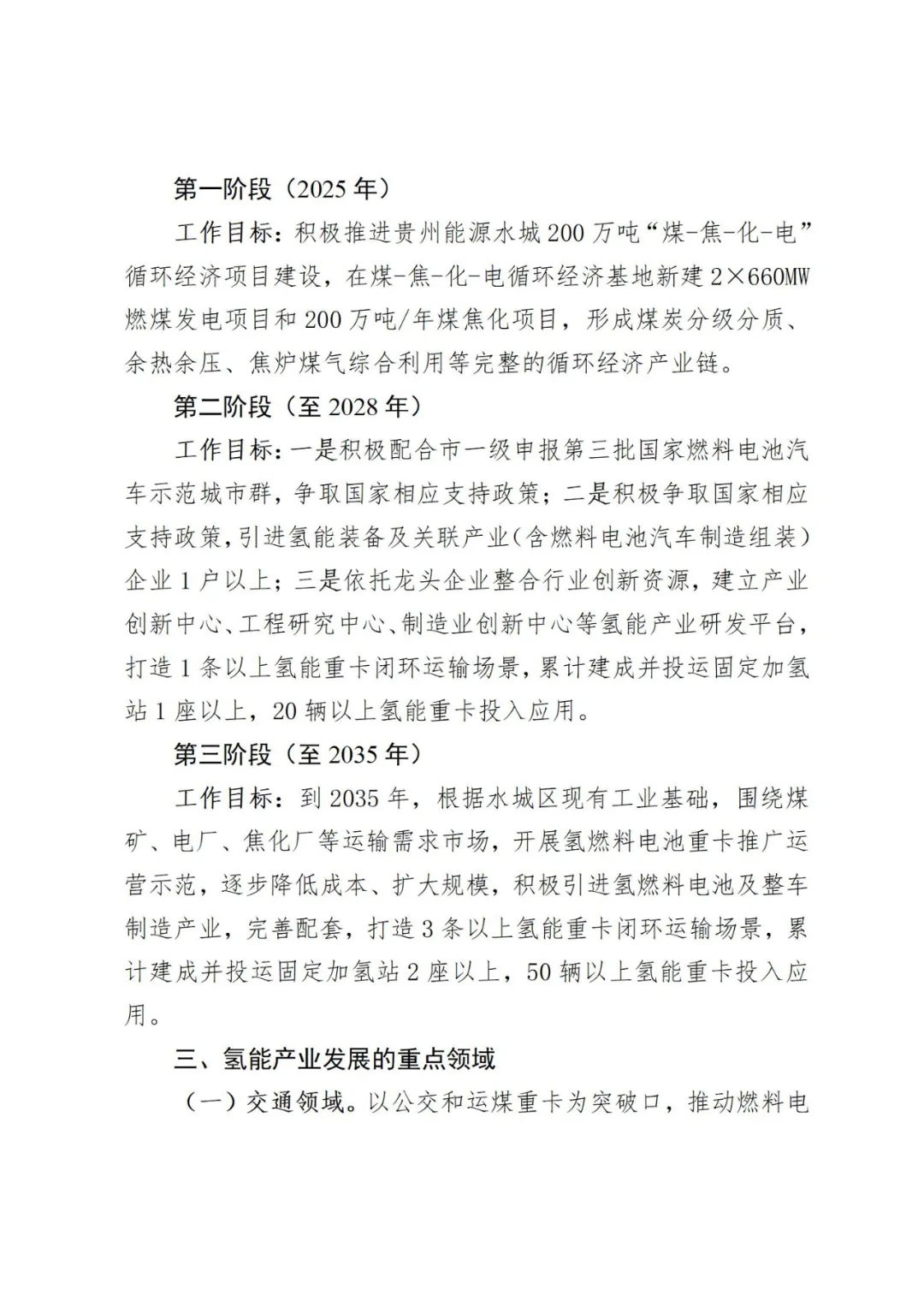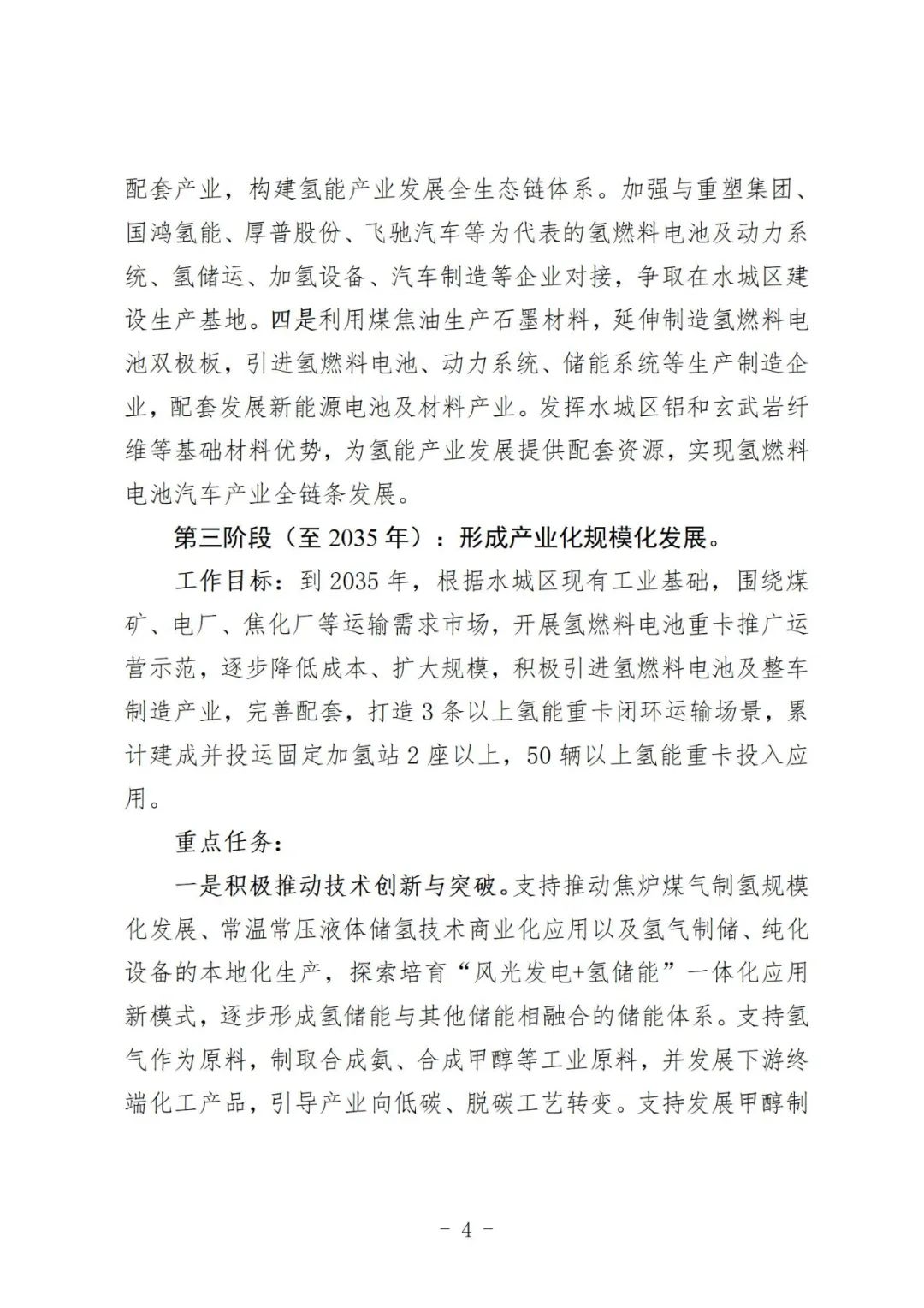 近日(ri),六盤(pan)水市水城區人民政(zheng)府發(fa)布《六盤(pan)水市水城區氫能產業發(fa)展行動方案 (2025—2035年)(征求意(yi)見稿)意(yi)見的公(gong)告》。 《行動(dong)方案(an)》指出(chu),依托貴州能源(yuan)200萬噸/年煤(mei)(mei)焦(jiao)(jiao)化項目(mu),以(yi)焦(jiao)(jiao)爐(lu)煤(mei)(mei)氣(qi)(qi)制(zhi)氫(qing)為起(qi)點,以(yi)公交和運(yun)煤(mei)(mei)重卡為突破口推(tui)(tui)動(dong)示范(fan)應(ying)(ying)用(yong),圍繞焦(jiao)(jiao)爐(lu)煤(mei)(mei)氣(qi)(qi)制(zhi)氫(qing)工藝,開(kai)展制(zhi)氫(qing)、儲(chu)運(yun)、加(jia)氫(qing)站等(deng)(deng)基礎設(she)(she)施(shi)建設(she)(she),在(zai)交通領域打造(zao)50輛(liang)以(yi)上(shang)氫(qing)能重卡應(ying)(ying)用(yong)示范(fan)場(chang)景。氫(qing)氣(qi)(qi)制(zhi)取方面,建成(cheng)(cheng)1座(zuo)制(zhi)氫(qing)廠(chang);基礎設(she)(she)施(shi)方面,建成(cheng)(cheng)加(jia)氫(qing)站2座(zuo)以(yi)上(shang);推(tui)(tui)廣(guang)應(ying)(ying)用(yong)方面,圍繞特定(ding)煤(mei)(mei)礦、洗煤(mei)(mei)廠(chang)、焦(jiao)(jiao)化廠(chang)、 火電(dian)(dian)(dian)廠(chang)、貨場(chang)等(deng)(deng)煤(mei)(mei)炭物流運(yun)輸場(chang)景,推(tui)(tui)廣(guang)燃(ran)料(liao)電(dian)(dian)(dian)池重型牽引車、自卸車等(deng)(deng)新能源(yuan)裝(zhuang)(zhuang)備(bei);招商引資方面,積(ji)極引進一批氫(qing)能裝(zhuang)(zhuang)備(bei)企業(ye)、燃(ran)料(liao)電(dian)(dian)(dian)池汽車運(yun)營與配套服務等(deng)(deng)企業(ye)。 第一階段(2025年):打基礎建示范 工作(zuo)目(mu)標:積極推進貴州(zhou)能源水(shui)城200萬噸(dun)“煤(mei)-焦(jiao)-化(hua)-電(dian)”循(xun)環(huan)經(jing)(jing)濟(ji)項目(mu)建設,在(zai)煤(mei)-焦(jiao)-化(hua)-電(dian)循(xun)環(huan)經(jing)(jing)濟(ji)基地新建2×660MW燃煤(mei)發(fa)電(dian)項目(mu)和(he)200萬噸(dun)/年煤(mei)焦(jiao)化(hua)項目(mu),形成煤(mei)炭分級分質(zhi)、余(yu)熱余(yu)壓(ya)、焦(jiao)爐煤(mei)氣綜(zong)合利用等(deng)完整的循(xun)環(huan)經(jing)(jing)濟(ji)產業鏈。 重點任務: 一是積極推(tui)動焦化項目(mu)建設(she)。貴州(zhou)能(neng)源水城200萬噸(dun)“煤-焦-化-電”循環經(jing)濟項目(mu)作為貴州(zhou)省重大工(gong)程(cheng)和(he)重點項目(mu),投產后可(ke)年產氫氣30億立方米以(yi)上。 二是科學規(gui)劃(hua)(hua)建設加(jia)(jia)氫走廊(lang)。基于水城區焦化廠(chang)廢氫的排(pai)放量,謀劃(hua)(hua)建設氫工(gong)廠(chang),解決當前氫氣制、貯、運(yun)(yun)及研(yan)發應(ying)用(yong)的難題(ti),探(tan)索綜合(he)運(yun)(yun)用(yong)氣態儲(chu)運(yun)(yun)、液(ye)態儲(chu)運(yun)(yun)和(he)固態儲(chu)運(yun)(yun)等技術(shu),結合(he)燃料電(dian)池公交、運(yun)(yun)煤用(yong)車、渣土車運(yun)(yun)營線路(lu)和(he)區域,科學有序規(gui)劃(hua)(hua)布(bu)局加(jia)(jia)氫站(zhan),預(yu)留加(jia)(jia)氫站(zhan)建設用(yong)地空間,鼓勵企業在現(xian)有加(jia)(jia)油站(zhan)、加(jia)(jia)氣站(zhan)、充電(dian)站(zhan)內改擴建加(jia)(jia)氫設施。通過科學規(gui)劃(hua)(hua)建設,在六盤水市區形(xing)成閉合(he)成環、輻射成線和(he)交匯成點的沿水城經濟開發區-雙水-鐘山區加(jia)(jia)氫走廊(lang)。 第二階段(至2028年):強鏈條擴規模 工(gong)作目標:一是積(ji)極配合市(shi)一級申報第三(san)批國家燃(ran)料(liao)電池汽車示范城市(shi)群,爭取(qu)國家相應支持政策(ce);二(er)是積(ji)極爭取(qu)國家相應支持政策(ce),引進氫(qing)能(neng)裝(zhuang)(zhuang)備(bei)及關(guan)聯產業(ye)(含燃(ran)料(liao)電池汽車制(zhi)造組裝(zhuang)(zhuang))企業(ye)1戶以上(shang)(shang)(shang);三(san)是依托龍頭(tou)企業(ye)整合行業(ye)創(chuang)新(xin)資(zi)源,建立產業(ye)創(chuang)新(xin)中(zhong)心、工(gong)程研究(jiu)中(zhong)心、制(zhi)造業(ye)創(chuang)新(xin)中(zhong)心等(deng)氫(qing)能(neng)產業(ye)研發平臺,打造1條以上(shang)(shang)(shang)氫(qing)能(neng)重卡閉(bi)環運輸場景,累(lei)計建成并投(tou)運固定加氫(qing)站1座以上(shang)(shang)(shang),20輛以上(shang)(shang)(shang)氫(qing)能(neng)重卡投(tou)入應用(yong)。 重點任務: 一是(shi)促進燃料電(dian)(dian)池(chi)汽(qi)車(che)示(shi)范(fan)應(ying)用。在水城區內新增及更(geng)新公交(jiao)、運(yun)煤、環衛垃圾(ji)收集、渣土運(yun)輸車(che)輛等領域,率先(xian)示(shi)范(fan)推廣采購燃料電(dian)(dian)池(chi)汽(qi)車(che),擴大燃料電(dian)(dian)池(chi)公交(jiao)線路占比,實現燃料電(dian)(dian)池(chi)各領域的示(shi)范(fan)應(ying)用。 二是策劃(hua)引進和(he)培育重(zhong)點(dian)項(xiang)(xiang)目(mu)。深化剖析氫能(neng)產(chan)業鏈(lian),立足“補鏈(lian)、強鏈(lian)、建鏈(lian)”,謀劃(hua)一(yi)批氫能(neng)領域重(zhong)點(dian)產(chan)業項(xiang)(xiang)目(mu),建立動態的氫能(neng)產(chan)業招(zhao)商(shang)項(xiang)(xiang)目(mu)庫。完善(shan)招(zhao)商(shang)項(xiang)(xiang)目(mu)跟(gen)蹤(zong)引進的考(kao)核機制,將氫能(neng)產(chan)業招(zhao)商(shang)目(mu)標分(fen)解到各職能(neng)部門,按照(zhao)跟(gen)蹤(zong)、洽(qia)談、簽(qian)約、落地(di)予以分(fen)級(ji)考(kao)核。 三(san)是依托(tuo)現有產(chan)業基礎,通(tong)過應用端(duan)反哺制造端(duan),強(qiang)化招商引資,發(fa)(fa)展(zhan)氫(qing)能(neng)配套產(chan)業,構建(jian)氫(qing)能(neng)產(chan)業發(fa)(fa)展(zhan)全生態鏈體(ti)系。加(jia)強(qiang)與重塑集團、國鴻(hong)氫(qing)能(neng)、厚(hou)普股份、飛馳汽