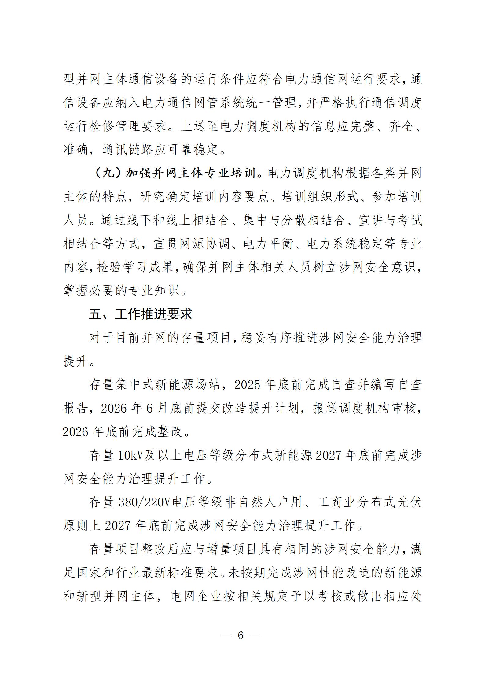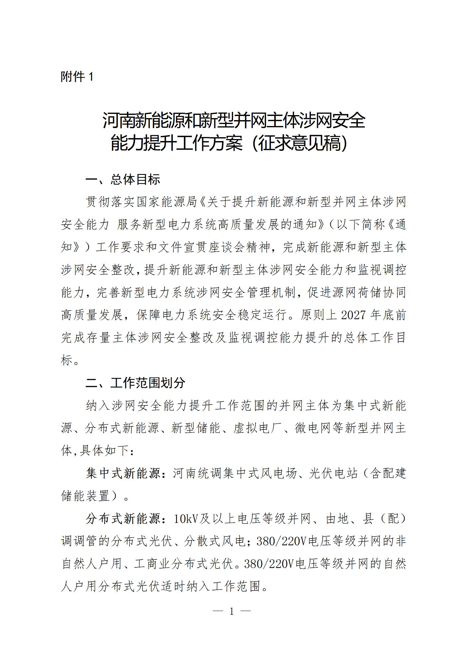 5月19日,國家能源局河南監管辦公室 河南省發展和改革委員會關于公開征求《河南新能源和新型并網主體涉網安全能力提升工作方案(征求意見稿)》意見的通知,通知指出,對于目前并網的存量項目,穩妥有序推進涉網安全能力治理提升。 存量集中式新能源場站,2025年底前完成自查并編寫自查報告,2026年6月底前提交改造提升計劃,報送調度機構審核,2026年底前完成整改。 存量10kV及以上電壓等級分布式新能源2027年底前完成涉網安全能力治理提升工作。 存量380/220V電壓等級非自然人戶用、工商業分布式光伏原則上2027年底前完成涉網安全能力治理提升工作。 存量項目整改后應與增量項目具有相同的涉網安全能力,滿足國家和行業最新標準要求。未按期完成涉網性能改造的新能源和新型并網主體,電網企業按相關規定予以考核或做出相應處理。各地電力安全監管部門要嚴格落實屬地電力安全監管責任,督促指導轄區內電力調度機構和新型并網主體做好新能源涉網安全管理和能力提升工作。各級電力調度機構應密切跟蹤新能源和新型并網主體涉網性能改造情況,按季度分別向屬地電力安全監管部門、河南能源監管辦和河南省發展改革委匯報進展情況。 原文如下: 國家能源局河南監管辦公室 河南省發展和改革委員會關于公開征求《河南新能源和新型并網主體涉網安全能力提升工作方案(征求意見稿)》意見的通知 為深入落實《國家能源局關于提升新能源和新型并網主體涉網安全能力服務新型電力系統高質量發展的通知》等文件要求,國家能源局河南監管辦公室、河南省發展和改革委員會組織起草了《河南新能源和新型并網主體涉網安全能力提升工作方案(征求意見稿)》,現向社會公開征求意見。 歡迎有關單位和社會各界人士提出寶貴意見建議,此次征求意見截止時間為2025年6月20日。相關意見建議請傳真至0371-65836661,或通過電子郵件發至hndjbaqc@163.com。 感謝您的參與和支持! 附件1:河南新能源和新型并網主體涉網安全能力提升工作方案(征求意見稿).doc 附件2:研提意見匯總表.docx 國家能源局河南監管辦公室 河南省發展和改革委員會 2025年5月19日 下一篇: 中廣核申請新疆一光伏企業破產!