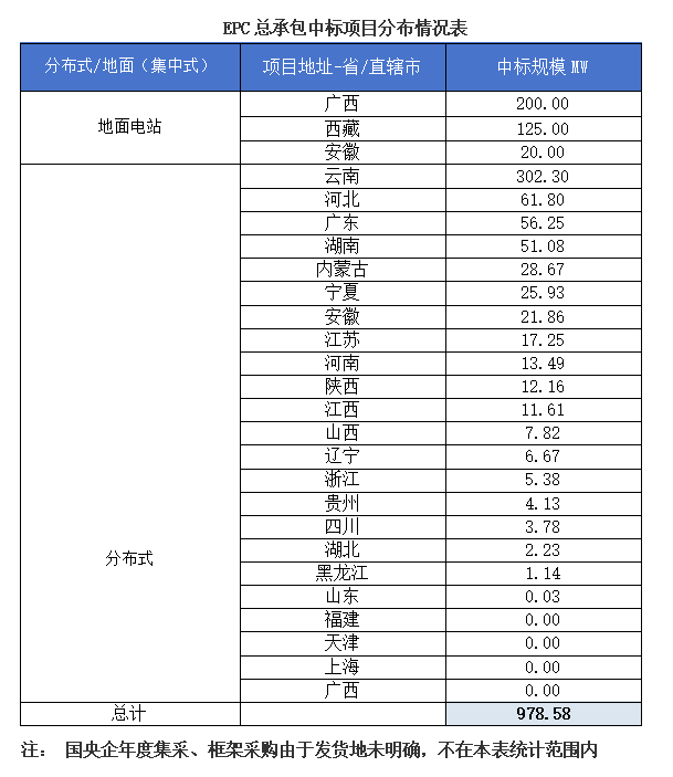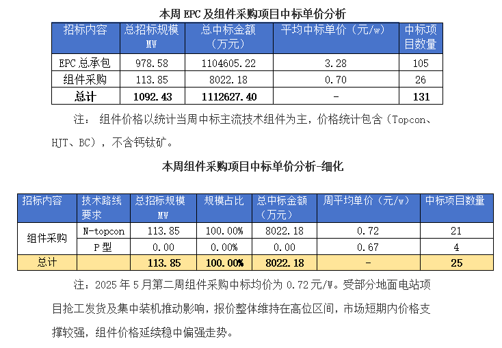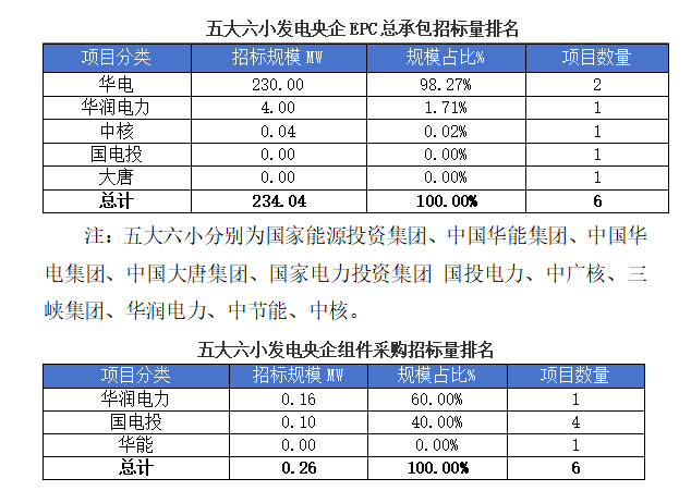 一、光伏項目招標情況匯總: 根據Gessey蓋(gai)錫咨(zi)詢統計,2025年5月(yue)10日(ri)-5月(yue)16日(ri)累計光伏招(zhao)標(biao)項(xiang)目為(wei)158個(ge),項(xiang)目規(gui)模(mo)合計為(wei)5047.11MW。光伏組(zu)件(jian)采購招(zhao)標(biao)項(xiang)目為(wei)24個(ge),招(zhao)標(biao)規(gui)模(mo)為(wei)25.82MW,EPC總承包招(zhao)標(biao)項(xiang)目為(wei)134個(ge),招(zhao)標(biao)規(gui)模(mo)為(wei)5021.29MW。 我們統(tong)計包含大型央企(qi)國企(qi)、地方能源集團、地方政(zheng)府機關(guan)、兩大電網(wang)、央企(qi)總包企(qi)業(ye)、知(zhi)名光伏企(qi)業(ye)等(deng),其中五大六小發電央企(qi)占(zhan)總招(zhao)標規模較高,具(ju)體各企(qi)業(ye)排名如下表: 二、中標項目分布類型匯總情況 本周中(zhong)(zhong)標項目需求按照招標場(chang)景地(di)分布,分布式光伏(fu)主(zhu)要(yao)集(ji)中(zhong)(zhong)在(zai)云南(nan)、江蘇(su)、四(si)川、江西等(deng)地(di)區,即主(zhu)要(yao)集(ji)中(zhong)(zhong)在(zai)東南(nan)部地(di)區;集(ji)中(zhong)(zhong)式光伏(fu)主(zhu)要(yao)集(ji)中(zhong)(zhong)在(zai)新疆、云南(nan)、寧夏、內(nei)蒙古等(deng)地(di)區,即主(zhu)要(yao)集(ji)中(zhong)(zhong)在(zai)西南(nan)部地(di)區。 三、EPC總承包及組件采購情況匯總 本周光伏EPC總(zong)承包中標規模(mo)達978.58 MW,總(zong)中標金(jin)額1104605.22萬(wan)元(yuan)(yuan),平均中標單價為3.28元(yuan)(yuan)/W,中標數量105個。 本周光伏組件采購中(zhong)(zhong)標(biao)規模達113.85 MW,總中(zhong)(zhong)標(biao)金額8022.18萬元(yuan),平均中(zhong)(zhong)標(biao)單價為0.70元(yuan)/W,中(zhong)(zhong)標(biao)數量(liang)26個(ge)。 上一篇: 蓋錫咨詢:5月22日光伏行業要聞速覽