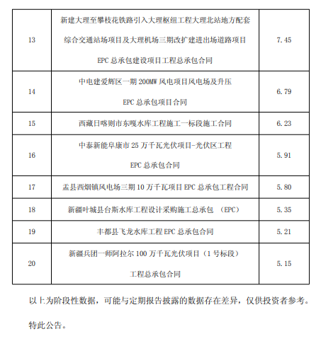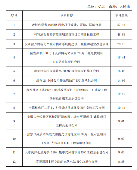 5月23日,中國電建發布2025年1月至4月主要經營情況。 情況顯示,中國電建1-4月新簽風電項目443個,合同金額755.95億元,同比增長68.41%。新簽太陽能發電項目402個,合同金額745.43億元,同比下降34.53%。 2025年4月,公司新簽合同金額在人民幣5億元以上的單個項目詳情見下表: