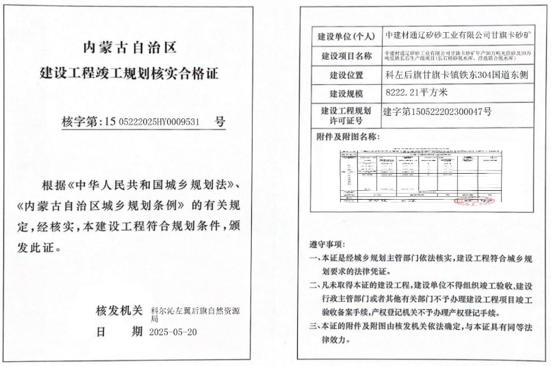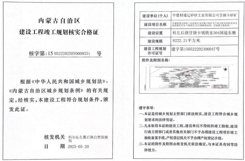 5月23日,內(nei)蒙古科爾沁左翼后旗人民政府發布中(zhong)建(jian)(jian)材通遼矽砂工業有(you)限公(gong)司甘旗卡砂礦年產(chan)30萬(wan)(wan)噸光伏砂及20萬(wan)(wan)噸低(di)(di)鐵(tie)長石(shi)生產(chan)線(xian)項(xiang)目(mu)(mu)(長石(shi)精砂脫(tuo)水庫(ku),浮選聯合脫(tuo)水庫(ku))建(jian)(jian)設(she)工程(cheng)竣(jun)工規劃核實合格證公(gong)示。根據公(gong)示信息,中(zhong)建(jian)(jian)材通遼矽砂工業有(you)限公(gong)司甘旗卡砂礦年產(chan)30萬(wan)(wan)噸光伏砂及20萬(wan)(wan)噸低(di)(di)鐵(tie)長石(shi)生產(chan)線(xian)項(xiang)目(mu)(mu)建(jian)(jian)設(she)單(dan)位為中(zhong)建(jian)(jian)材通遼矽砂工業有(you)限公(gong)司甘旗卡砂礦。項(xiang)目(mu)(mu)建(jian)(jian)設(she)位置位于科左后旗甘旗卡鎮鐵(tie)東304國道東側,建(jian)(jian)設(she)規模8222.21平方米(mi)。