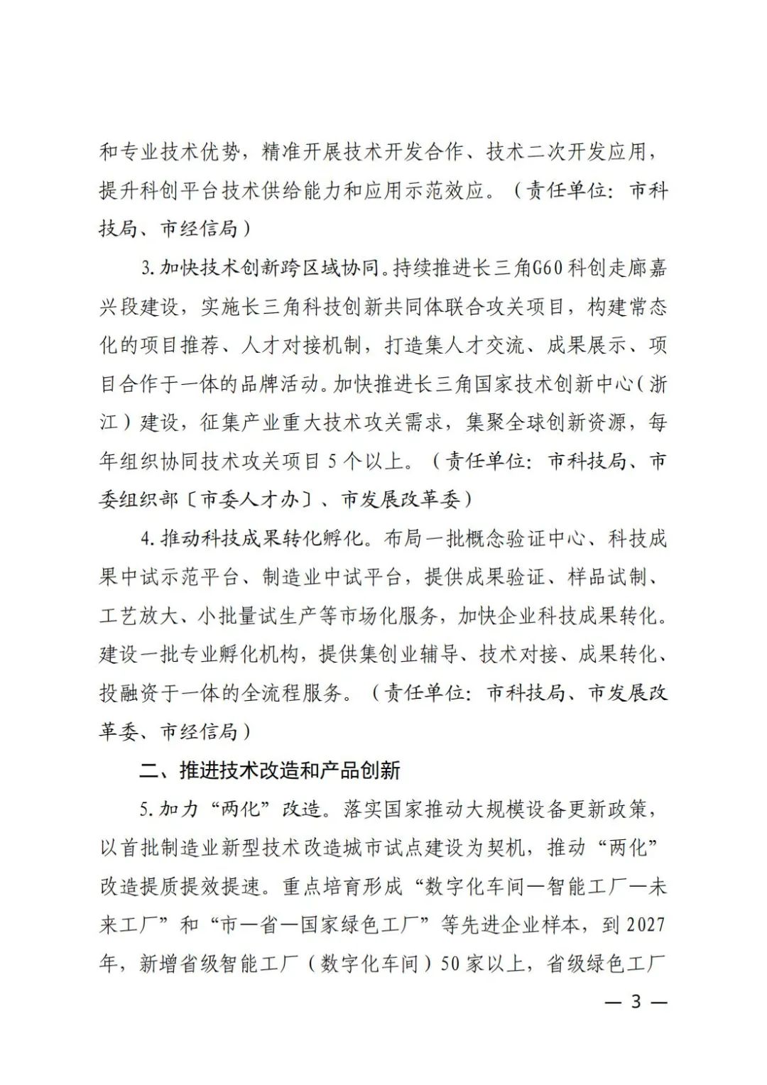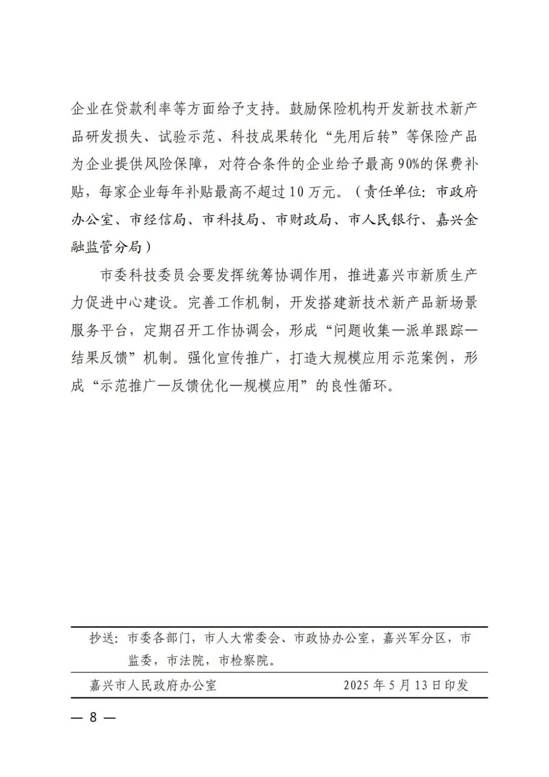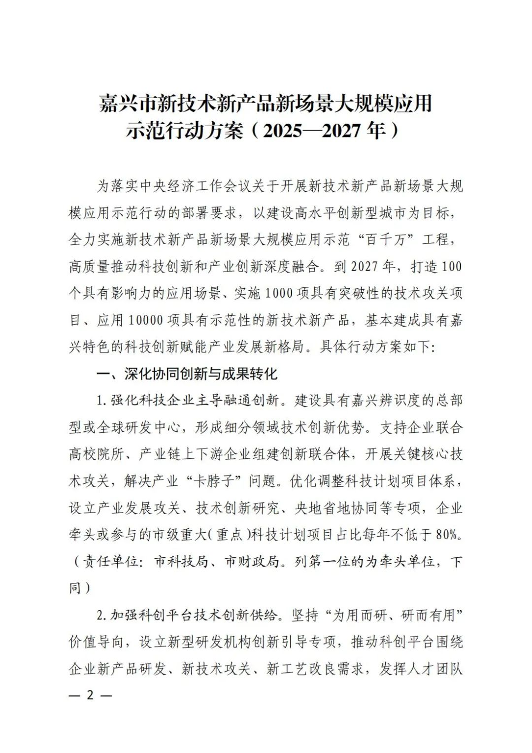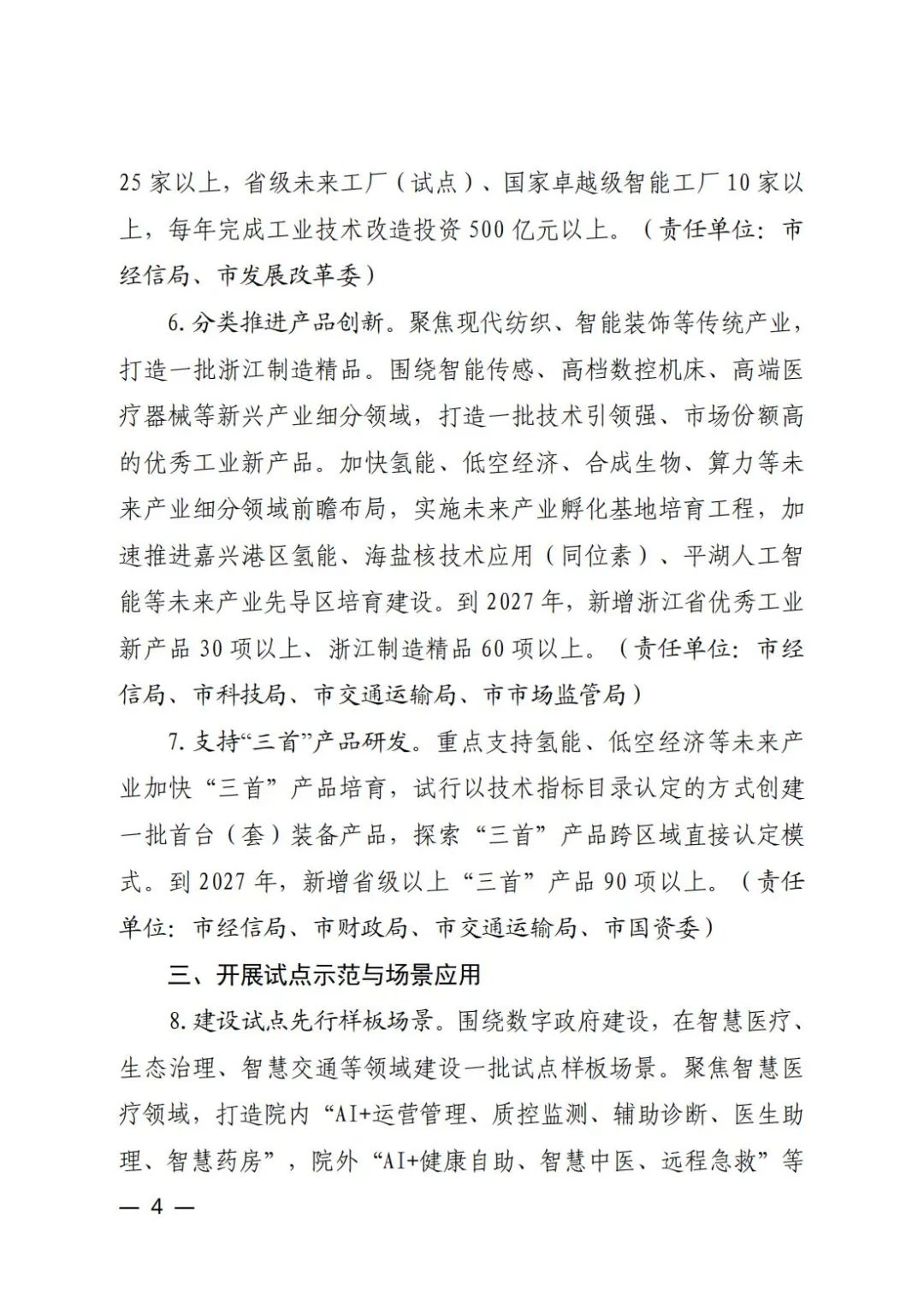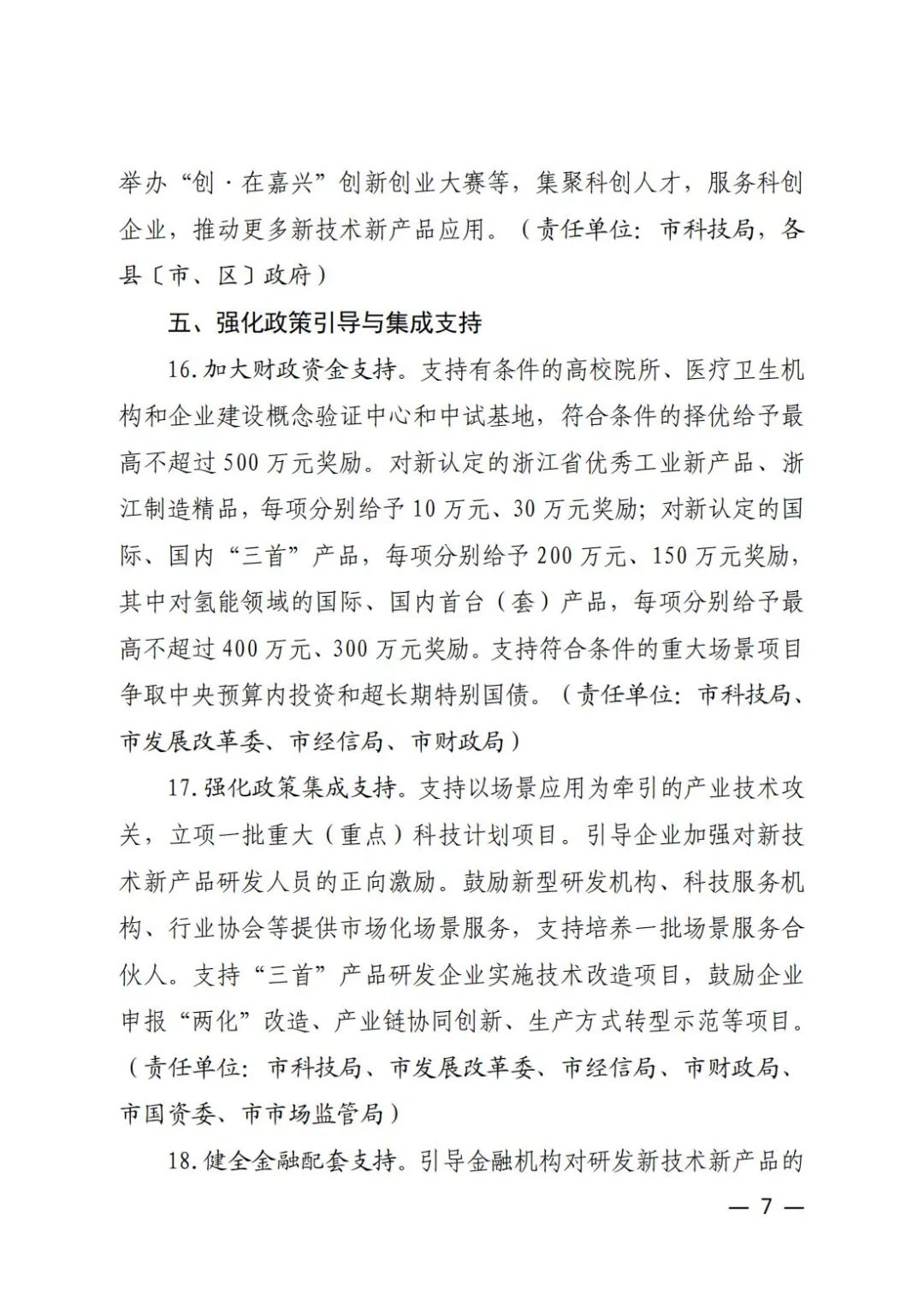 近日,嘉(jia)興(xing)市人民政府辦公(gong)室發布《關于嘉(jia)興(xing)市新(xin)技(ji)術新(xin)產(chan)品(pin)新(xin)場景大規(gui)模應用示范行動方案(2025—2027年)的通知》。 文(wen)件(jian)指出,加(jia)快(kuai)氫能(neng)、低空(kong)經濟、合成生(sheng)物、算(suan)力等(deng)未來(lai)產(chan)業(ye)(ye)(ye)細分領(ling)域前瞻布局,實(shi)施未來(lai)產(chan)業(ye)(ye)(ye)孵化基地培(pei)育(yu)工(gong)程,加(jia)速(su)推進嘉興港區(qu)氫能(neng)、海(hai)鹽(yan)核(he)技術(shu)應用(同位素)、平湖(hu)人工(gong)智(zhi)能(neng)等(deng)未來(lai)產(chan)業(ye)(ye)(ye)先導區(qu)培(pei)育(yu)建設(she)。到(dao)2027年,新增浙江省優秀工(gong)業(ye)(ye)(ye)新產(chan)品(pin)(pin)30項以上(shang)、浙江制造精(jing)品(pin)(pin)60項以上(shang)。 支持(chi)“三(san)首(shou)(shou)”產(chan)(chan)品(pin)(pin)研發。重點支持(chi)氫能(neng)、低(di)空經濟等(deng)未來產(chan)(chan)業加快(kuai)“三(san)首(shou)(shou)”產(chan)(chan)品(pin)(pin)培育,試(shi)行(xing)以技術指(zhi)標目錄(lu)認定(ding)的方式(shi)創(chuang)建一(yi)批首(shou)(shou)臺(套)裝備產(chan)(chan)品(pin)(pin),探索“三(san)首(shou)(shou)”產(chan)(chan)品(pin)(pin)跨區域直接認定(ding)模式(shi)。到2027年,新(xin)增省級以上(shang)“三(san)首(shou)(shou)”產(chan)(chan)品(pin)(pin)90項以上(shang)。 在氫能領域,開(kai)展氫能船舶示范運(yun)(yun)營、氫能重(zhong)卡區港聯動運(yun)(yun)輸等場景(jing)應用。 此外,加大財政資(zi)(zi)金支(zhi)持。支(zhi)持有條(tiao)(tiao)件(jian)的高(gao)校(xiao)院所、醫療衛生機構和企業(ye)建設概念驗(yan)證中(zhong)心和中(zhong)試(shi)基地,符合(he)條(tiao)(tiao)件(jian)的擇優給予(yu)最高(gao)不超過500萬(wan)(wan)元(yuan)獎勵(li)(li)。對新認定的浙(zhe)江省(sheng)優秀工(gong)業(ye)新產品、浙(zhe)江制(zhi)造精(jing)品,每(mei)項分別給予(yu)10萬(wan)(wan)元(yuan)、30萬(wan)(wan)元(yuan)獎勵(li)(li);對新認定的國(guo)際、國(guo)內(nei)“三首”產品,每(mei)項分別給予(yu)200萬(wan)(wan)元(yuan)、150萬(wan)(wan)元(yuan)獎勵(li)(li),其中(zhong)對氫能領域的國(guo)際、國(guo)內(nei)首臺(tai)(套)產品,每(mei)項分別給予(yu)最高(gao)不超過400萬(wan)(wan)元(yuan)、300萬(wan)(wan)元(yuan)獎勵(li)(li)。支(zhi)持符合(he)條(tiao)(tiao)件(jian)的重大場景(jing)項目爭取中(zhong)央預(yu)算內(nei)投資(zi)(zi)和超長期特別國(guo)債。 全文如下: