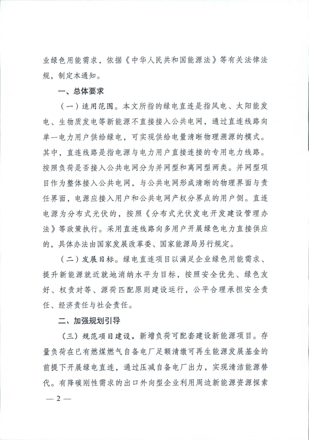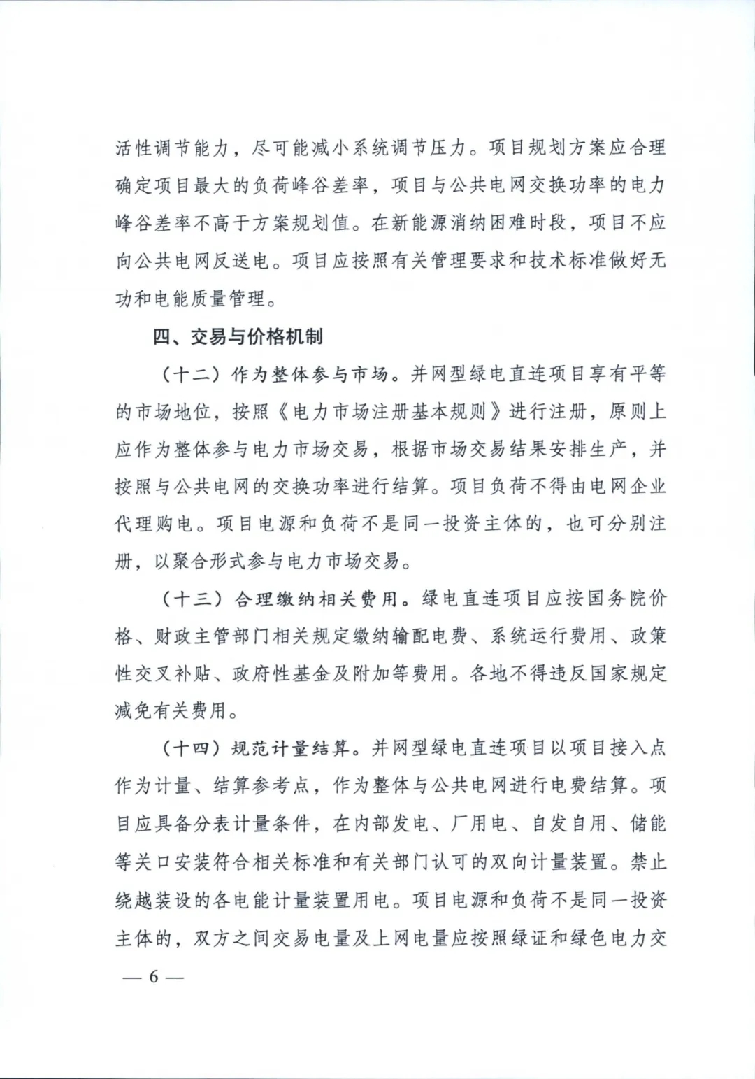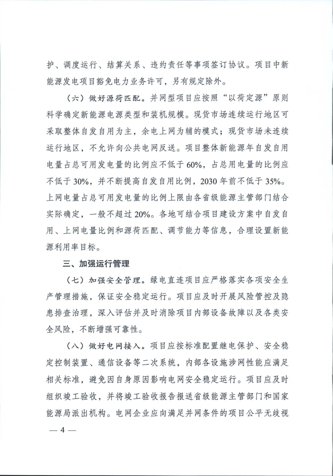 5月21日,國家發改委、國家能源局聯合印發《關于有序推動綠電直連發展有關事項的通知》,探索創新新能源生產和消費融合發展模式,促進新能源就近就地消納。 根據文件,本文所指的綠電直連是指風電、太陽能發電、生物質發電等新能源不直接接入公共電網,通過直連線路向單一電力用戶供給綠電,可實現供給電量清晰物理溯源的模式。 直連線路是指電源與電力用戶直接連接的專用電力線路。按照負荷是否接入公共電網分為并網型和離網型兩類。其中,并網型項目作為整體接入公共電網,與公共電網形成清晰的物理界面與責任界面,電源應接入用戶和公共電網產權分界點的用戶側。 需要指出的是,采用直連線路向多用戶開展綠色電力直接供應的另行規定。分布式光伏電源按照((分布式光伏發電開發建設管理辦法》等政策執行。 項目范圍:新增負荷可配套建設新能源項目;存量負荷在已有燃煤燃氣自備電廠足額清繳可再生能源發展基金的前提下開展綠電直連;有降碳剛性需求的出口外向型企業利可用周邊新能源資源開展存量負荷綠電直連;接網或消納受限無法并網的項目可變更手續后開展綠電直連。 另外,風電和太陽能發電規模計入省級能源主管部門制定的新能源發電開發建設方案。 鼓勵模式:綠電直連項目原則上由負荷作為主責單位,電源可由負荷投資,也由發電企業或雙方成立的合資公司投資;非同一投資主體的應簽訂多年期購電協議或合同能源管理協議,明確產權、結算、責任等各項劃分。 具體比例:項目應按照“以荷定源”原則,項目整體新能源年自發自用電量占總可用發電量的比例應不低于60%,占總用電量的比例應不低于30%,并不斷提高自發自用比例,2030年前不低于35%。 上網電量占總可用發電量的比例上限由各省級能源主管部門結合實際確定,一般不超過20%。 費用方面:綠電直連項目應按國務院價格、財政主管部門相關規定繳納輸配電費、系統運行費用、政策性交叉補貼、政府性基金及附加等費用。各地不得違反國家規定減免有關費用。 電力市場:為整體參與電力市場交易,根據市場交易結果安排生產,并按照與公共電網的交換功率進行結算。項目負荷不得由電網企業代理購電。 責任劃分:并網型綠電直連項目與公共電網按產權分界點形成清晰明確的安全責任界面。項目應統籌考慮內部源荷特性、平衡能力、經濟收益、與公共電網交換功率等因素,自主合理申報并網容量,并與電網企業協商確定并網容量以外的供電責任和費用。 省級主管部門需進一步細化就近就地消納距離、上網電量比例、退出機制等具體要求,引導項目科學合理評估需求,避免出現實際運行與設計方案出現較大偏差、新能源消納不及預期等情況。 具體見下: