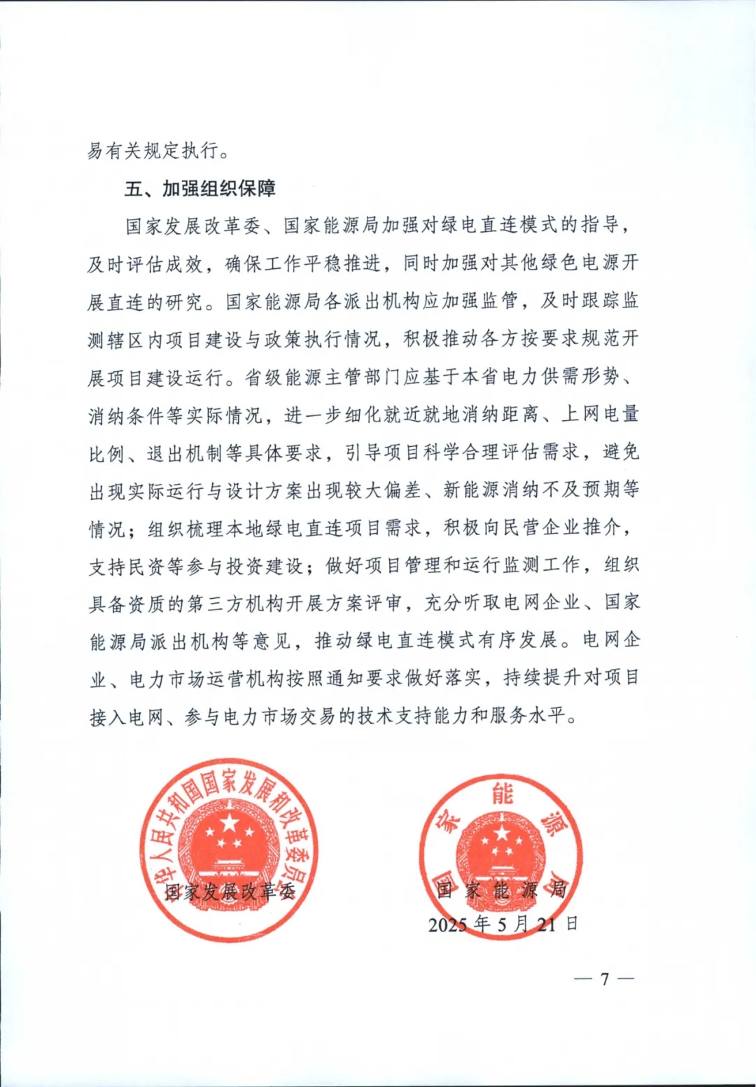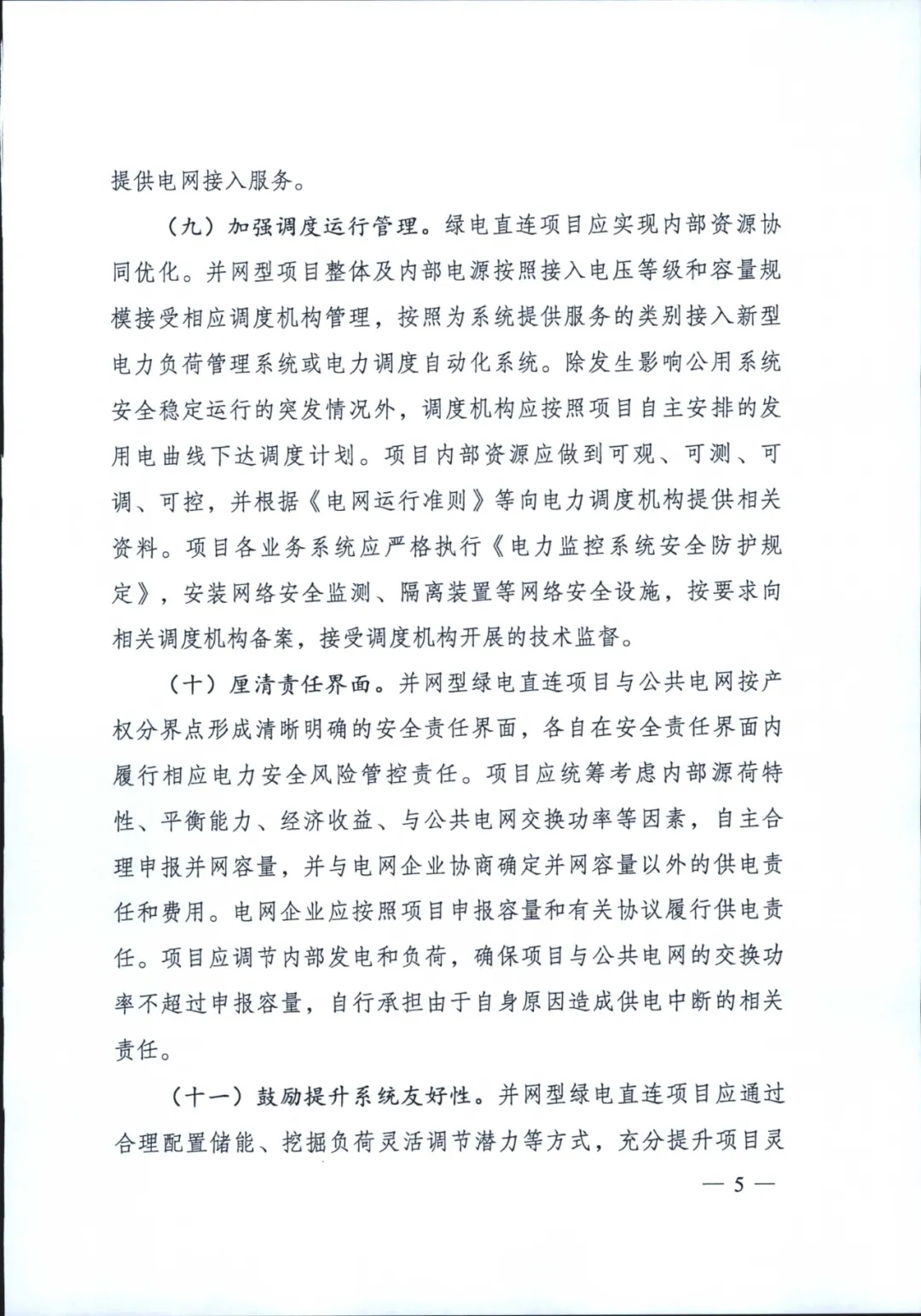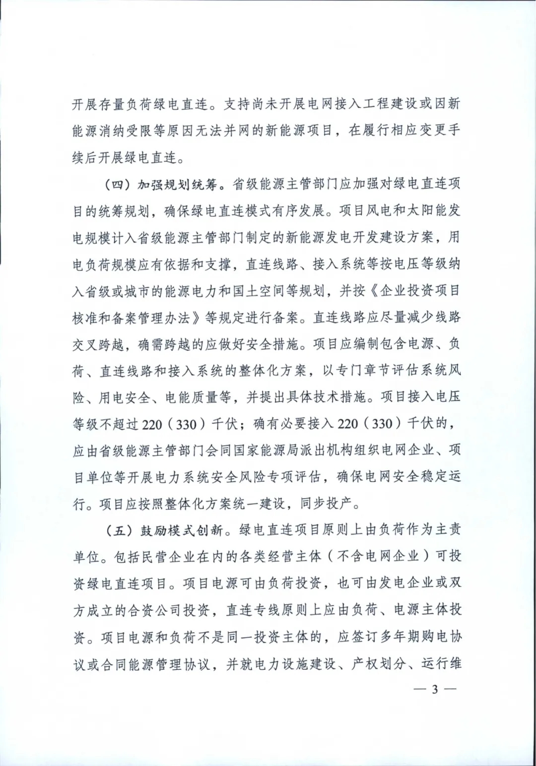 5月21日,國家發改委、國家能源局聯合印發《關于有序推動綠電直連發展有關事項的通知》,探索創新新能源生產和消費融合發展模式,促進新能源就近就地消納。 根據文件,本文所指的綠電直連是指風電、太陽能發電、生物質發電等新能源不直接接入公共電網,通過直連線路向單一電力用戶供給綠電,可實現供給電量清晰物理溯源的模式。 直連線路是指電源與電力用戶直接連接的專用電力線路。按照負荷是否接入公共電網分為并網型和離網型兩類。其中,并網型項目作為整體接入公共電網,與公共電網形成清晰的物理界面與責任界面,電源應接入用戶和公共電網產權分界點的用戶側。 需要指出的是,采用直連線路向多用戶開展綠色電力直接供應的另行規定。分布式光伏電源按照((分布式光伏發電開發建設管理辦法》等政策執行。 項目范圍:新增負荷可配套建設新能源項目;存量負荷在已有燃煤燃氣自備電廠足額清繳可再生能源發展基金的前提下開展綠電直連;有降碳剛性需求的出口外向型企業利可用周邊新能源資源開展存量負荷綠電直連;接網或消納受限無法并網的項目可變更手續后開展綠電直連。 另外,風電和太陽能發電規模計入省級能源主管部門制定的新能源發電開發建設方案。 鼓勵模式:綠電直連項目原則上由負荷作為主責單位,電源可由負荷投資,也由發電企業或雙方成立的合資公司投資;非同一投資主體的應簽訂多年期購電協議或合同能源管理協議,明確產權、結算、責任等各項劃分。 具體比例:項目應按照“以荷定源”原則,項目整體新能源年自發自用電量占總可用發電量的比例應不低于60%,占總用電量的比例應不低于30%,并不斷提高自發自用比例,2030年前不低于35%。 上網電量占總可用發電量的比例上限由各省級能源主管部門結合實際確定,一般不超過20%。 費用方面:綠電直連項目應按國務院價格、財政主管部門相關規定繳納輸配電費、系統運行費用、政策性交叉補貼、政府性基金及附加等費用。各地不得違反國家規定減免有關費用。 電力市場:為整體參與電力市場交易,根據市場交易結果安排生產,并按照與公共電網的交換功率進行結算。項目負荷不得由電網企業代理購電。 責任劃分:并網型綠電直連項目與公共電網按產權分界點形成清晰明確的安全責任界面。項目應統籌考慮內部源荷特性、平衡能力、經濟收益、與公共電網交換功率等因素,自主合理申報并網容量,并與電網企業協商確定并網容量以外的供電責任和費用。 省級主管部門需進一步細化就近就地消納距離、上網電量比例、退出機制等具體要求,引導項目科學合理評估需求,避免出現實際運行與設計方案出現較大偏差、新能源消納不及預期等情況。 具體見下: