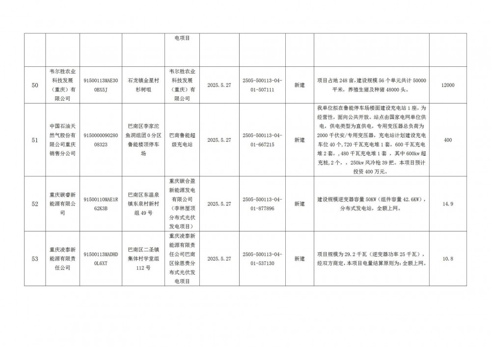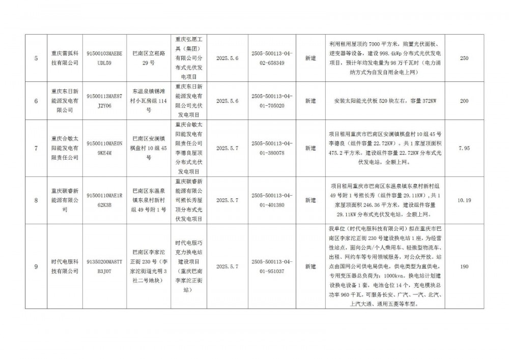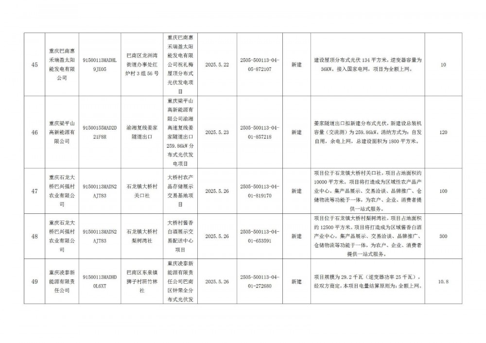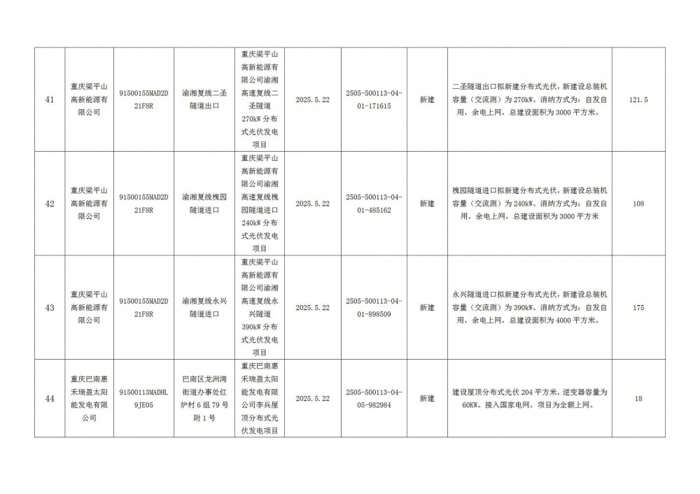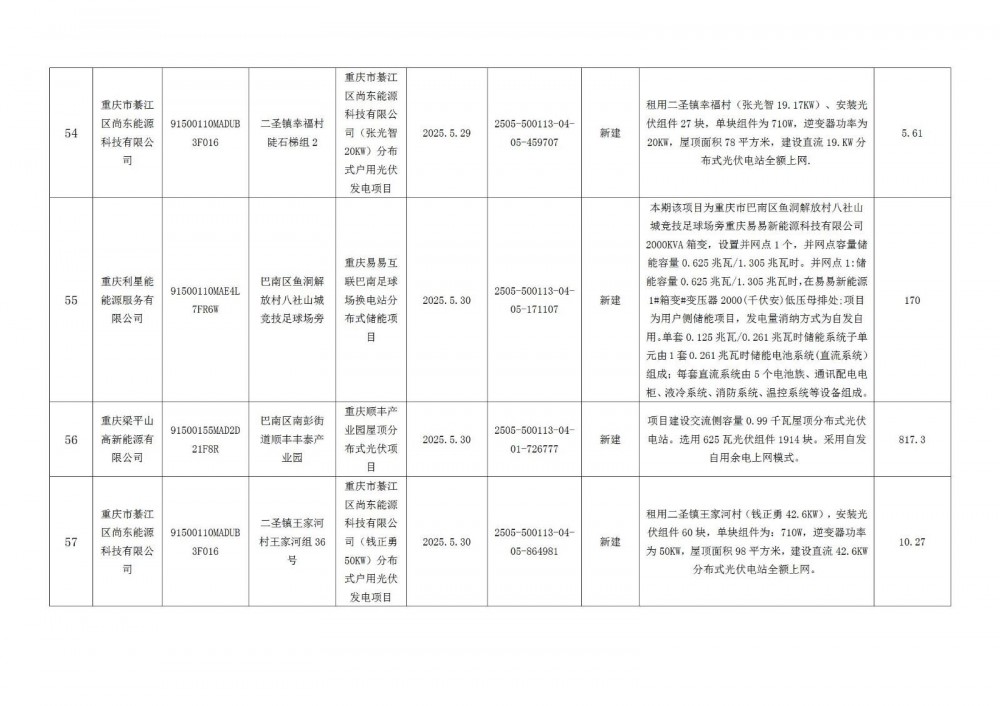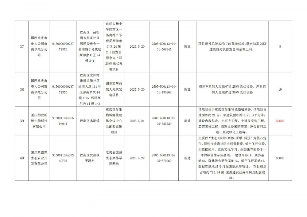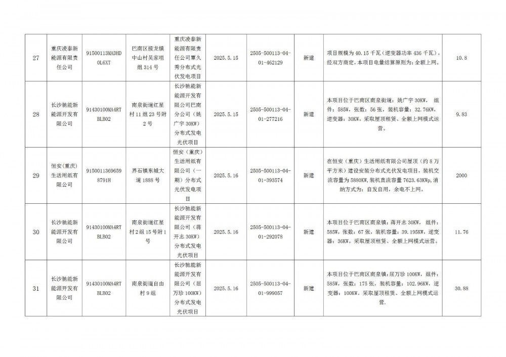 6月(yue)3日,重慶市巴南區發改委2025年企業投資項(xiang)目備案統計表(biao)(5月(yue))發布(bu)。 根據統(tong)計表顯示(shi),其此次(ci)涉及(ji)40個光(guang)伏(fu)項目,總投資合計4618.16萬元,建設性(xing)質(zhi)均(jun)為新建。 詳(xiang)情如(ru)下: