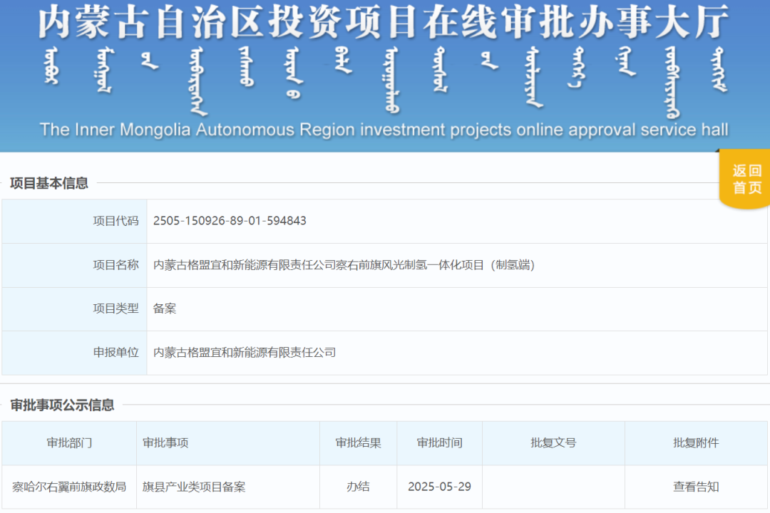 近(jin)日,內蒙(meng)古格盟宜和新能源(yuan)有限(xian)責任公司察右前旗風光(guang)制氫一體化(hua)項目(mu)(制氫端)獲(huo)備案。 該項(xiang)目位(wei)于烏蘭察布市(shi)察哈爾右翼前旗天皮(pi)山工業化工園區(qu),總投資(zi)25940.03萬(wan)元。項(xiang)目單(dan)位(wei)為內蒙古格盟(meng)宜和(he)新能源有限責(ze)任公(gong)司(si)。 建設(she)(she)規模(mo):制氫(qing)(qing)(qing)(qing)能(neng)力(li)10600Nm3/h,制氧能(neng)力(li)5300Nm3/h,年綠(lv)氫(qing)(qing)(qing)(qing)生(sheng)產(chan)能(neng)力(li)2947.05t/a,綠(lv)氧生(sheng)產(chan)能(neng)力(li)23576t/a。建設(she)(she)內容:綠(lv)電(dian)制氫(qing)(qing)(qing)(qing)工(gong)藝:綠(lv)電(dian)→電(dian)解槽→氣(qi)液分離(li)-氫(qing)(qing)(qing)(qing)氣(qi)純(chun)化(hua)→氫(qing)(qing)(qing)(qing)氣(qi)儲(chu)存(cun)、壓(ya)縮、充裝(zhuang)(zhuang)→氫(qing)(qing)(qing)(qing)氣(qi)長管拖(tuo)車。設(she)(she)施設(she)(she)備:電(dian)解水(shui)裝(zhuang)(zhuang)置、分離(li)純(chun)化(hua)裝(zhuang)(zhuang)置、儲(chu)氫(qing)(qing)(qing)(qing)裝(zhuang)(zhuang)置、儲(chu)氧裝(zhuang)(zhuang)置、氫(qing)(qing)(qing)(qing)氣(qi)壓(ya)縮、汽車裝(zhuang)(zhuang)卸設(she)(she)施、公用工(gong)程及輔助(zhu)設(she)(she)施如中(zhong)央控(kong)制室(shi)、化(hua)驗室(shi)、凈水(shui)廠(chang)(chang)、循(xun)環水(shui)廠(chang)(chang)房(fang)(fang)、綜合(he)庫房(fang)(fang)、維修(xiu)廠(chang)(chang)房(fang)(fang)、消(xiao)防水(shui)泵(beng)房(fang)(fang)、換熱站(zhan)及整體項目的其他附屬(shu)設(she)(she)施。 項目計劃建設起止(zhi)年限:2025年7月(yue)至2027年12月(yue) 公告如下: 項目備案告知書 項目(mu)代碼:2505-150926-89-01-594843 項(xiang)目單(dan)位:內(nei)蒙古格盟宜和新能源有限責任公司 您提交的(de) 內蒙古格盟宜和新能源有(you)限責任公司察右前旗風光(guang)制氫(qing)一體(ti)化項目(mu)(制氫(qing)端) 旗縣產(chan)業類項目(mu)備案(an)項目(mu),符合產(chan)業政(zheng)策(ce)和市場準(zhun)入(ru)標準(zhun),準(zhun)予備案(an)。請據此開展有(you)關工(gong)(gong)作。在開工(gong)(gong)建設前,應當(dang)辦理法律(lv)法規要求(qiu)的(de)其(qi)他手續,方可(ke)開工(gong)(gong)。特此告知(zhi)! 建(jian)設(she)地點:烏蘭察(cha)布市--察(cha)哈爾右翼前旗--天皮山工業化工園(yuan)區 總投資:25940.03萬(wan)元(yuan),其中 自有資金(jin):5188.01萬(wan)元(yuan) , 申(shen)請銀行貸(dai)款:20752.02萬(wan)元(yuan) , 其他(ta)0萬(wan)元(yuan) 計劃(hua)建設起止年限(xian):2025/07至2027/12 建設(she)(she)規模及內(nei)容(rong):建設(she)(she)規模:制(zhi)氫能(neng)力(li)(li)10600Nm3/h,制(zhi)氧(yang)能(neng)力(li)(li)5300Nm3/h,年(nian)綠氫生產能(neng)力(li)(li)2947.05t/a,綠氧(yang)生產能(neng)力(li)(li)23576t/a。建設(she)(she)內(nei)容(rong):綠電制(zhi)氫工藝:綠電→電解(jie)槽(cao)→氣(qi)液分離-氫氣(qi)純(chun)化→氫氣(qi)儲(chu)存(cun)、壓(ya)縮、充裝(zhuang)→氫氣(qi)長管拖車。設(she)(she)施(shi)設(she)(she)備:電解(jie)水裝(zhuang)置(zhi)(zhi)、分離純(chun)化裝(zhuang)置(zhi)(zhi)、儲(chu)氫裝(zhuang)置(zhi)(zhi)、儲(chu)氧(yang)裝(zhuang)置(zhi)(zhi)、氫氣(qi)壓(ya)縮、汽車裝(zhuang)卸設(she)(she)施(shi)、公(gong)用工程及輔助設(she)(she)施(shi)如中(zhong)央控(kong)制(zhi)室、化驗室、凈水廠、循環水廠房、綜(zong)合庫(ku)房、維(wei)修(xiu)廠房、消防水泵(beng)房、換(huan)熱站及整體(ti)項目的其他附(fu)屬設(she)(she)施(shi)。 補(bu)充說(shuo)明:1、本備(bei)案告知(zhi)書只具(ju)有(you)告知(zhi)功能,只說(shuo)明項(xiang)(xiang)目(mu)(mu)符合(he)國家產(chan)業政策,其他(ta)部(bu)門審批(pi)事(shi)項(xiang)(xiang)按相關法(fa)(fa)律法(fa)(fa)規(gui)(gui)執行(xing)。2、項(xiang)(xiang)目(mu)(mu)單位要嚴格按照自然資源、生(sheng)態環境、林(lin)草(cao)、住(zhu)建(jian)、應急管理(li)等行(xing)業管理(li)部(bu)門要求規(gui)(gui)范建(jian)設(she)。3、建(jian)設(she)項(xiang)(xiang)目(mu)(mu)符合(he)《企業投(tou)資項(xiang)(xiang)目(mu)(mu)核準和備(bei)案管理(li)辦(ban)法(fa)(fa)》,建(jian)設(she)中(zhong)不得違規(gui)(gui)使用《產(chan)業結構(gou)調整指導目(mu)(mu)錄(2024年本)》限制類和淘汰類中(zhong)的工(gong)藝、技術、裝備(bei)和產(chan)品等。4、在開(kai)工(gong)建(jian)設(she)前,應當(dang)辦(ban)理(li)法(fa)(fa)律法(fa)(fa)規(gui)(gui)要求的其他(ta)手續,方可開(kai)工(gong)。 (注意:項目(mu)(mu)自(zi)備案2年內(nei)未開工建設(she)或者未辦理任何(he)其他手續(xu)(xu)的(de)(de),項目(mu)(mu)單位如果 決定(ding)繼續(xu)(xu)實(shi)施(shi)該項目(mu)(mu),請通(tong)過在線(xian)平(ping)臺(tai)作出說(shuo)(shuo)明(ming)(ming);如果不再繼續(xu)(xu)實(shi)施(shi),請申請撤銷(xiao)已 備案項目(mu)(mu),2年期(qi)滿后仍未作出說(shuo)(shuo)明(ming)(ming)并未撤銷(xiao)的(de)(de),備案機(ji)關將刪(shan)除已備案項目(mu)(mu)并在在線(xian)平(ping)臺(tai)公示。) 察(cha)哈爾右翼前旗行政(zheng)審(shen)批政(zheng)務服務與數據管理局 2025年05月29日(ri)