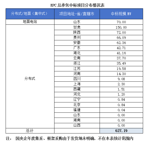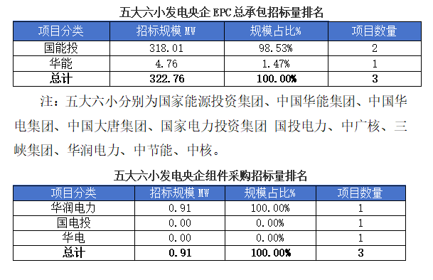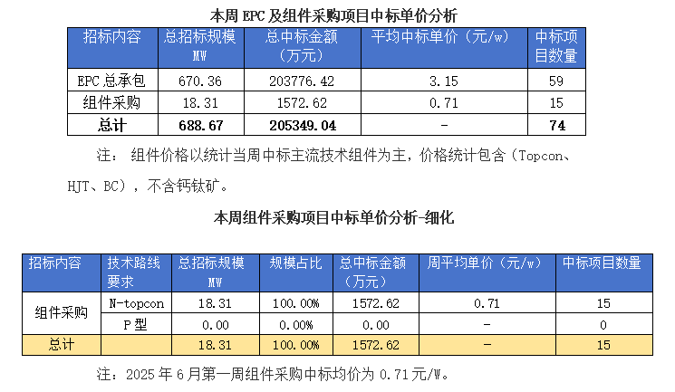 一、光伏項目招標情況匯總: 根(gen)據Gessey蓋錫咨詢(xun)統計(ji),2025年6月(yue)1日(ri)-6月(yue)6日(ri)累計(ji)光(guang)伏招(zhao)(zhao)標(biao)項(xiang)(xiang)(xiang)目(mu)為(wei)(wei)97個,項(xiang)(xiang)(xiang)目(mu)規(gui)模(mo)合計(ji)為(wei)(wei)5708.72MW。光(guang)伏組件采購招(zhao)(zhao)標(biao)項(xiang)(xiang)(xiang)目(mu)為(wei)(wei)20個,招(zhao)(zhao)標(biao)規(gui)模(mo)為(wei)(wei)68.97MW,EPC總(zong)承包招(zhao)(zhao)標(biao)項(xiang)(xiang)(xiang)目(mu)為(wei)(wei)77個,招(zhao)(zhao)標(biao)規(gui)模(mo)為(wei)(wei)5639.74MW。 我們統計包含大型(xing)央(yang)(yang)企(qi)(qi)(qi)國(guo)企(qi)(qi)(qi)、地(di)方(fang)能源(yuan)集團、地(di)方(fang)政府機關、兩(liang)大電(dian)網、央(yang)(yang)企(qi)(qi)(qi)總(zong)包企(qi)(qi)(qi)業、知名光伏企(qi)(qi)(qi)業等,其中五大六小(xiao)發電(dian)央(yang)(yang)企(qi)(qi)(qi)占總(zong)招標規(gui)模較高,具體(ti)各企(qi)(qi)(qi)業排名如(ru)下表(biao): 二、中標項目分布類型匯總情況 本(ben)周中(zhong)(zhong)標項目(mu)需求按照招標場(chang)景地(di)分布,分布式光伏(fu)主(zhu)(zhu)要(yao)集中(zhong)(zhong)在甘肅、山(shan)西、貴州(zhou)、安徽等地(di)區(qu),即主(zhu)(zhu)要(yao)集中(zhong)(zhong)在東北部地(di)區(qu);集中(zhong)(zhong)式光伏(fu)主(zhu)(zhu)要(yao)集中(zhong)(zhong)在山(shan)東等地(di)區(qu),即主(zhu)(zhu)要(yao)集中(zhong)(zhong)在華東地(di)區(qu)。 三、EPC總承包及組件采購情況匯總 本(ben)周光伏EPC總承(cheng)包中(zhong)(zhong)標(biao)規模達670.36 MW,總中(zhong)(zhong)標(biao)金額203776.42萬(wan)元,平均中(zhong)(zhong)標(biao)單價為3.15元/W,中(zhong)(zhong)標(biao)數量59個。 本周(zhou)光(guang)伏組件采(cai)購中(zhong)標(biao)(biao)(biao)規模達18.31 MW,總中(zhong)標(biao)(biao)(biao)金額1572.62萬元(yuan),平(ping)均中(zhong)標(biao)(biao)(biao)單價為0.71元(yuan)/W,中(zhong)標(biao)(biao)(biao)數量15個。 上一篇: 蓋錫咨詢:6月9日光伏行業要聞速覽