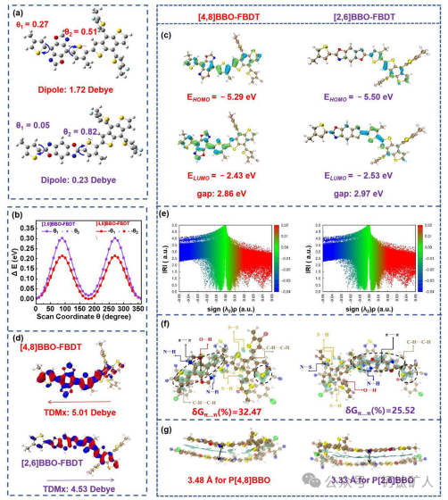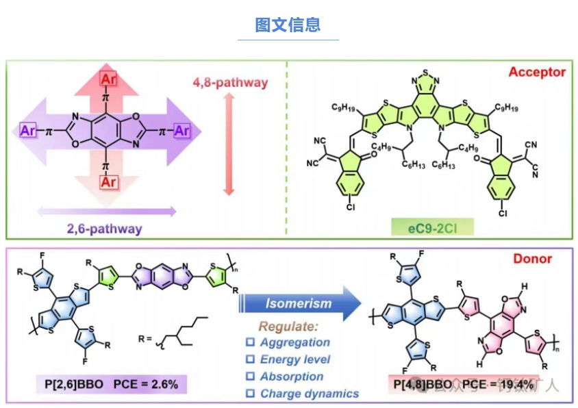 基(ji)于(yu)此,華(hua)南師范大學劉生建等人通過(guo)分別調(diao)節苯并雙噁唑(BBO)的(de)(de)(de)共軛(e)路(lu)(lu)(lu)徑(jing)(jing)(4,8-和(he)2,6-連(lian)接方式),設計(ji)了兩種高(gao)效的(de)(de)(de)聚(ju)合(he)(he)(he)物給體(ti)P[4,8]BBO和(he)P[2,6]BBO。與P[2,6]BBO相(xiang)比(bi),共軛(e)路(lu)(lu)(lu)徑(jing)(jing)的(de)(de)(de)異構化已被證明使P[4,8]BBO具有(you)更淺的(de)(de)(de)最(zui)高(gao)占據(ju)分子軌道(HOMO)能(neng)級(ji)(-5.20 eV),顯(xian)著(zhu)增(zeng)強的(de)(de)(de)發光效率(lv)以(yi)及(ji)降低(di)的(de)(de)(de)聚(ju)集傾向。這(zhe)些改進使得器(qi)件(jian)效率(lv)從P[2,6]BBO:eC9-2Cl的(de)(de)(de)2.6%顯(xian)著(zhu)提升(sheng)至P[4,8]BBO:eC9-2Cl的(de)(de)(de)19.0%。綜合(he)(he)(he)表(biao)征表(biao)明,在基(ji)于(yu)P[4,8]BBO:eC9-2Cl的(de)(de)(de)OSC中可以(yi)實現更優的(de)(de)(de)綜合(he)(he)(he)電荷(he)管理,與基(ji)于(yu)P[2,6]BBO:eC9-2Cl的(de)(de)(de)器(qi)件(jian)相(xiang)比(bi),其短路(lu)(lu)(lu)電流密(mi)度(JSC)和(he)填充因子(FF)參數顯(xian)著(zhu)更高(gao)。此外,P[4,8]BBO表(biao)現出良好的(de)(de)(de)適用(yong)性(xing),在全聚(ju)合(he)(he)(he)物太陽能(neng)電池中實現了19.4%的(de)(de)(de)令人印象深刻的(de)(de)(de)效率(lv),并獲得了第三方認證的(de)(de)(de)19.1%的(de)(de)(de)效率(lv)。這(zhe)項(xiang)工(gong)作突出了共軛(e)路(lu)(lu)(lu)徑(jing)(jing)異構化在調(diao)節聚(ju)合(he)(he)(he)物性(xing)能(neng)以(yi)及(ji)推動高(gao)性(xing)能(neng)多功能(neng)光伏(fu)材(cai)料發展中的(de)(de)(de)關鍵作用(yong)。該論文(wen)近期(qi)以(yi)“Conjugation Pathway of Benzobisoxazoles in Polymer Donors Mediates the Charge Management and Enables Organic Solar Cells with Record Certified Efficiency”為(wei)題(ti)發表(biao)在頂級(ji)期(qi)刊Advanced Materials上。 圖1. 苯并雙噁唑(zuo)(BBO)的兩種共軛路徑以及eC9-2Cl和聚合物(wu)異(yi)構(gou)體P[2,6]BBO與P[4,8]BBO的化(hua)學結構(gou)。 圖2. a) 最(zui)優幾何構(gou)象及(ji)預測的(de)偶(ou)極矩(μ),b) 扭轉(zhuan)二面角 上一篇: Gessey:6月10日每日光伏市場行情