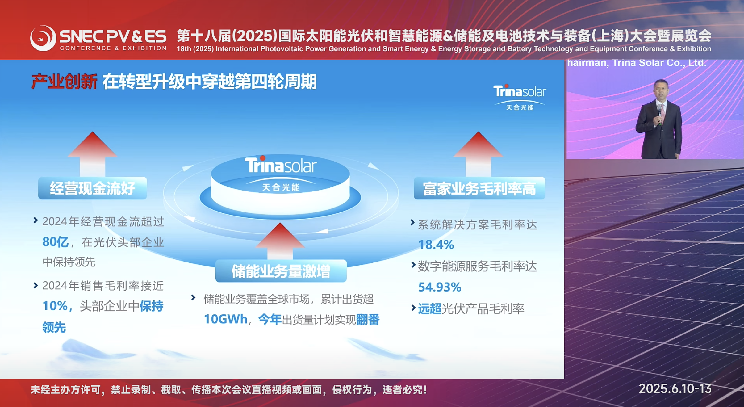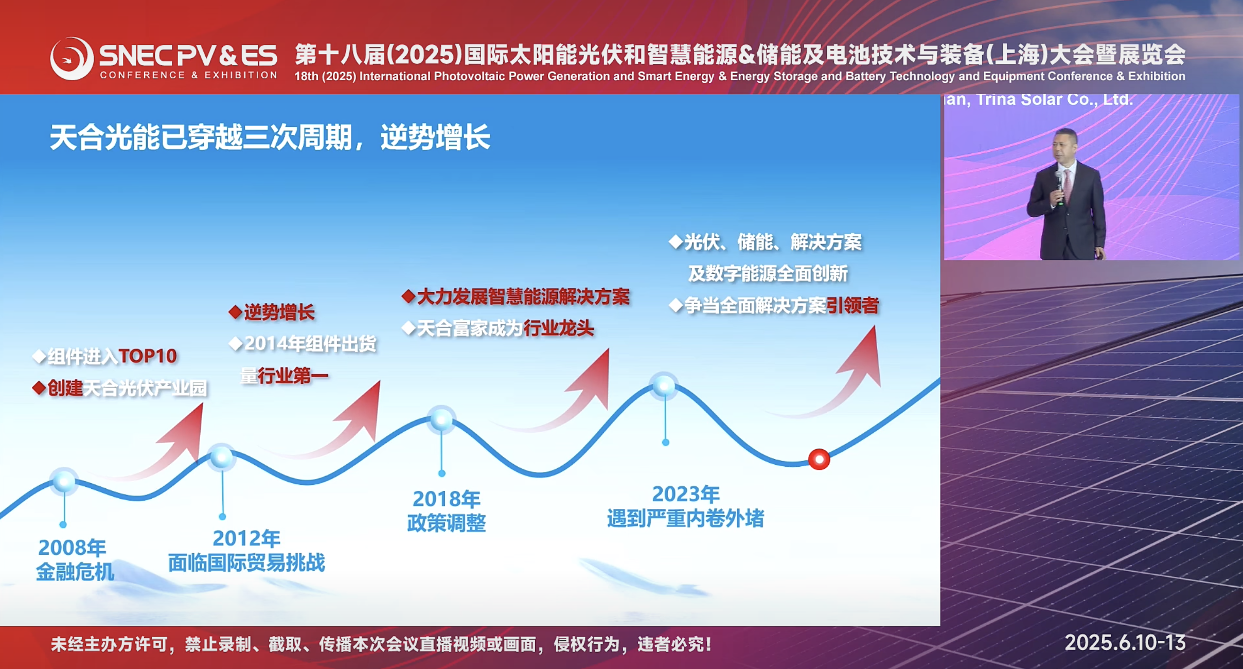 嘉賓:天合光能董事長高紀凡先生 標題:在穿越周期中,天合光能韌性成長 內容: 生(sheng)產(chan)業(ye)鏈的企業(ye)虧損。光(guang)伏產(chan)業(ye)目前(qian)處在一個周(zhou)期的底部。貿易帶來(lai)挑戰。 產業(ye)布局特征有超過1/3的(de)業(ye)務不是(shi)(shi)來自于光伏制造(zao),而(er)是(shi)(shi)來自于解決方案,而(er)這(zhe)個比例在未來的(de)兩三年中間將(jiang)會增加到50%以上。 中國光(guang)伏行業的知(zhi)識產權保護(hu)越來(lai)越受(shou)國家和社會的重視。天合光(guang)能在(zai)晶(jing)(jing)體(ti)硅到(dao)晶(jing)(jing)體(ti)鈣開放集成的突破方面取得了(le)(le)重大新(xin)進展(zhan),開啟了(le)(le)鈣鈦礦(kuang)晶(jing)(jing)體(ti)硅得蹭(ceng)時(shi)代(dai),組件產業化的新(xin)時(shi)代(dai)。今(jin)年要見(jian)鈣鈦礦(kuang)中試生(sheng)產線,效率在(zai)原來(lai)晶(jing)(jing)體(ti)硅組件效率基(ji)礎(chu)上(shang)要提(ti)高4個百分(fen)點。 以市場的需(xu)求(qiu)為方向,把綠色能源的解決(jue)方案滿足(zu)才是未來應該做的事。 六(liu)脈(mo)神劍的(de)戰略成功支撐:1)科技創新和產業(ye)創新融合為客戶(hu)創造價(jia)值;2)從產品(pin)品(pin)牌(pai)(pai)走向解決方(fang)案的(de)品(pin)牌(pai)(pai);3)全球化(hua),實施3.0,就是構(gou)建全球化(hua)的(de)本土化(hua)的(de)整體解決方(fang)案的(de)能力(li)。 生態(tai)(tai)(tai)型過去(qu)式鏈主生態(tai)(tai)(tai),未來是協同生態(tai)(tai)(tai)。構(gou)建一個聯合的投資生態(tai)(tai)(tai)。 破內卷的關鍵: