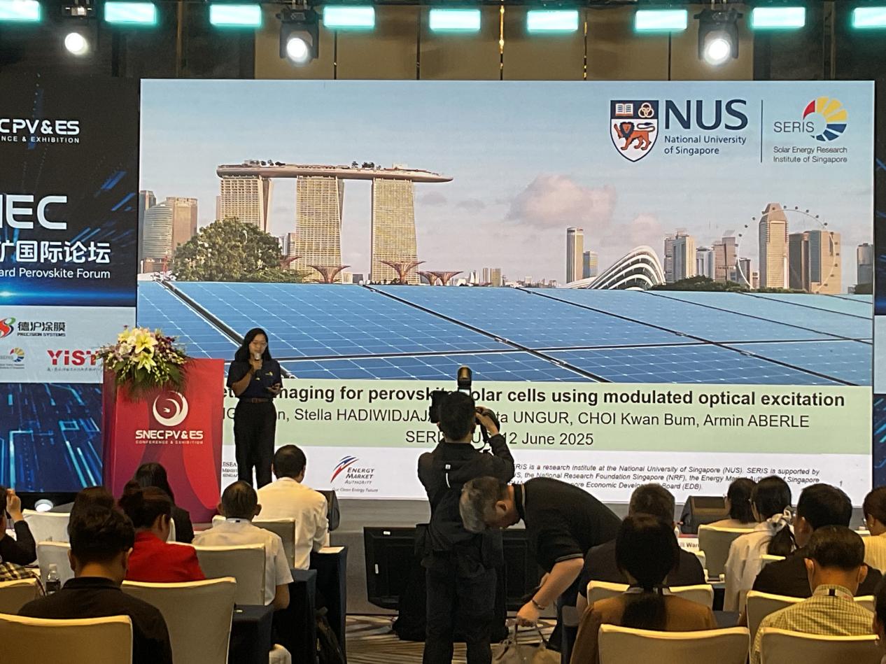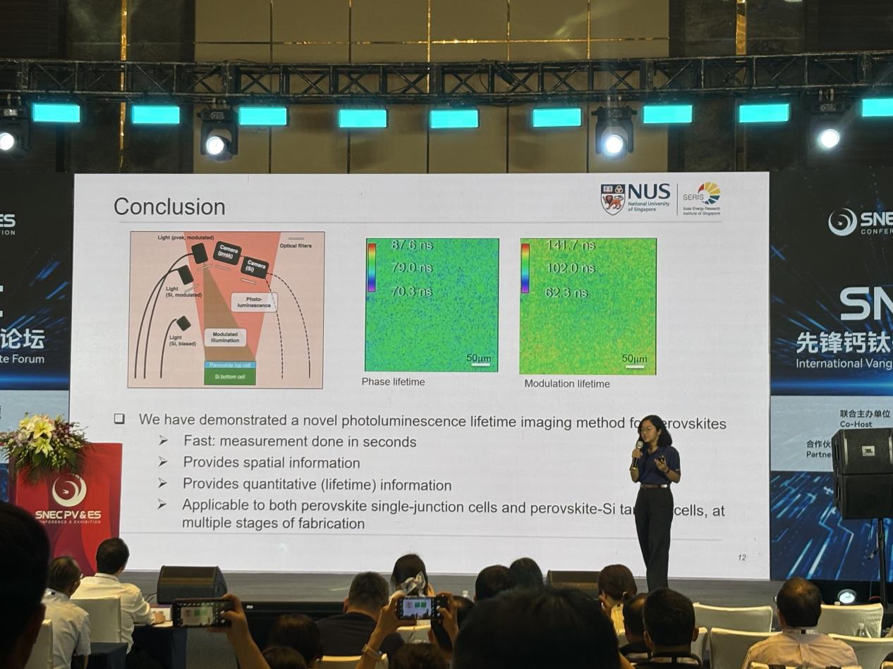 Fast Lifetime Imaging for Perovskite Solar Cells Using Modulated Optical Excitation Puqun Wang 博士 新加坡太陽能(neng)研究所(suo)(SERIS)高級研究員 新(xin)加坡國(guo)立(li)大學太(tai)陽能研究(jiu)所(suo)Puqun Wang博(bo)士在(zai)(zai)SNEC國(guo)際(ji)論壇發(fa)表題為(wei)"利用(yong)(yong)(yong)調(diao)制光(guang)學激勵進行鈣(gai)(gai)鈦(tai)(tai)礦(kuang)太(tai)陽能電(dian)池的(de)(de)(de)快速壽命成像(xiang)"的(de)(de)(de)突(tu)破性研究(jiu)報告。該(gai)研究(jiu)創新(xin)性地(di)采用(yong)(yong)(yong)1 kHz調(diao)制頻率的(de)(de)(de)532 nm激光(guang)激發(fa)源,結合相位敏感檢測(ce)(ce)技術,實現(xian)了(le)(le)測(ce)(ce)量(liang)(liang)(liang)速度(du)(du)達5秒/幀的(de)(de)(de)載流(liu)子(zi)壽命快速成像(xiang),較(jiao)傳統瞬態光(guang)致發(fa)光(guang)(TRPL)技術提升兩個數(shu)(shu)量(liang)(liang)(liang)級。關鍵技術突(tu)破在(zai)(zai)于(yu)同步(bu)獲(huo)取相位壽命(τ_phase)和調(diao)制壽命(τ_mod)雙參(can)數(shu)(shu)成像(xiang),實驗(yan)數(shu)(shu)據(ju)顯示,在(zai)(zai)標準鈣(gai)(gai)鈦(tai)(tai)礦(kuang)薄膜(mo)樣品(pin)(pin)中(zhong),τ_phase為(wei)87.6±3.2 ns,τ_mod為(wei)139.0±5.8 ns,二者42%的(de)(de)(de)差(cha)異首(shou)次定量(liang)(liang)(liang)揭示了(le)(le)載流(liu)子(zi)復合動力學的(de)(de)(de)空間非均勻(yun)性。通過μPCD(微波光(guang)電(dian)導衰(shuai)減(jian))和閃光(guang)法(fa)交叉驗(yan)證,該(gai)技術壽命測(ce)(ce)量(liang)(liang)(liang)誤(wu)差(cha)控制在(zai)(zai)±5%以內,空間分辨率達10 μm。研究(jiu)特別展(zhan)示了(le)(le)在(zai)(zai)鈣(gai)(gai)鈦(tai)(tai)礦(kuang)-硅疊層電(dian)池金屬化(hua)工藝中(zhong)的(de)(de)(de)在(zai)(zai)線(xian)檢測(ce)(ce)應(ying)用(yong)(yong)(yong),成功(gong)捕捉到(dao)前驅體(ti)結晶過程中(zhong)形成的(de)(de)(de)200-300 μm尺度(du)(du)異質(zhi)結晶域,其τ_phase波動幅度(du)(du)達35%,這一(yi)發(fa)現(xian)為(wei)工藝優化(hua)提供(gong)了(le)(le)直接依據(ju)。該(gai)技術實現(xian)了(le)(le)從(cong)實驗(yan)室樣品(pin)(pin)(2×2 cm2)到(dao)產線(xian)尺寸(cun)(15×15 cm2)的(de)(de)(de)全尺度(du)(du)檢測(ce)(ce)能力,PL強度(du)(du)與壽命圖(tu)像(xiang)的(de)(de)(de)相關系數(shu)(shu)分析(xi)(R2=0.73)證實了(le)(le)其在(zai)(zai)量(liang)(liang)(liang)化(hua)缺(que)陷密度(du)(du)方面的(de)(de)(de)可靠性,為(wei)鈣(gai)(gai)鈦(tai)(tai)礦(kuang)光(guang)伏(fu)器件(jian)的(de)(de)(de)產業化(hua)質(zhi)量(liang)(liang)(liang)控制建立(li)了(le)(le)新(xin)的(de)(de)(de)表征(zheng)范式。