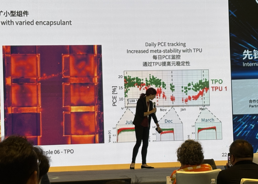 Alison Ciesla博士,澳大利亞(ya)新南威(wei)爾(er)士(shi)大學(UNSW)高級(ji)講師(shi)、研究(jiu)員 Alison Ciesla博士詳細介紹了(le)由(you)新南(nan)威爾(er)士大學(xue)(UNSW)、亥(hai)姆霍茲柏林材(cai)料(liao)與能源中心(HZB)及OPEN INSTRUMENTS聯合開發的(de)高分(fen)辨率(lv)(lv)多波長光致發光(PL)成像系統(tong)。該工具(ju)通過突(tu)破(po)性(xing)的(de)光學(xue)設計實現了(le)6.5 μm的(de)空(kong)間分(fen)辨率(lv)(lv)和低于5%的(de)照(zhao)明不均(jun)勻性(xing),較傳統(tong)PL系統(tong)(典型分(fen)辨率(lv)(lv)20-50 μm,不均(jun)勻性(xing)>15%)提升(sheng)(sheng)了(le)一個(ge)數(shu)量級(ji)(ji),使其(qi)能夠精(jing)準定位(wei)鈣(gai)鈦礦-硅疊層(ceng)電池中的(de)晶界(jie)、微裂紋(wen)及點缺陷等微米級(ji)(ji)結構異(yi)常(chang)。研究團隊通過對比實驗(yan)證明,該系統(tong)在(zai)識別1 μm2級(ji)(ji)別缺陷區(qu)域的(de)靈敏度(du)(du)較常(chang)規設備(bei)提高8倍,為(wei)分(fen)析(xi)效率(lv)(lv)衰減機(ji)制提供(gong)了(le)全(quan)新維(wei)度(du)(du)。Ciesla團隊利用(yong)該工具(ju)對封(feng)裝(zhuang)后的(de)鈣(gai)鈦礦組件進行了(le)系統(tong)性(xing)光譜分(fen)析(xi),發現采用(yong)新型聚合物(wu)封(feng)裝(zhuang)材(cai)料(liao)的(de)樣品在(zai)85℃/85%RH老化測試中,其(qi)PL強度(du)(du)衰減率(lv)(lv)僅為(wei)傳統(tong)玻璃封(feng)裝(zhuang)樣品的(de)23%,對應功率(lv)(lv)轉(zhuan)換(huan)效率(lv)(lv)日均(jun)衰減率(lv)(lv)從(cong)0.82%降至0.19%。這一數(shu)據直接驗(yan)證了(le)材(cai)料(liao)界(jie)面對離子遷移的(de)抑制作用(yong),為(wei)穩定性(xing)提升(sheng)(sheng)策略提供(gong)了(le)依據。 該研究首次實現(xian)了對鈣(gai)鈦礦相(xiang)分離(li)、硅(gui)底(di)電(dian)池載流子輸運(yun)等跨(kua)尺(chi)度(du)問(wen)題的(de)(de)同步觀測(ce)。演(yan)講中展示(shi)的(de)(de)PL-EL共定位數據(ju)表明,在(zai)27.3%效率的(de)(de)疊層電(dian)池中,界面復合損失可通(tong)過(guo)PL淬滅率與EL強(qiang)度(du)的(de)(de)空間相(xiang)關性定量解析,相(xiang)關系數達(da)0.91。這些成果(guo)不(bu)僅為(wei)下一代(dai)太陽能電(dian)池的(de)(de)缺陷工程建立了標準化表征(zheng)范式,其揭(jie)示(shi)的(de)(de)局部(bu)性能-穩定性關聯規律更被Ciesla強(qiang)調為(wei)"推動(dong)鈣(gai)鈦礦商業化必(bi)須攻克的(de)(de)核心科學問(wen)題"。目前該技術已通(tong)過(guo)OPEN INSTRUMENTS實現(xian)設備化,預計將加速TOPCon-perovskite等新型架構的(de)(de)研發(fa)進程。