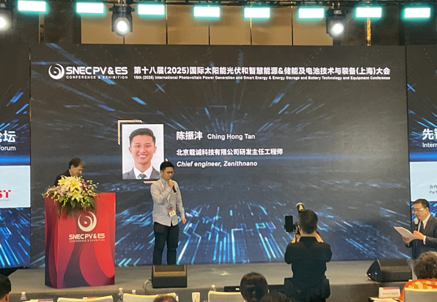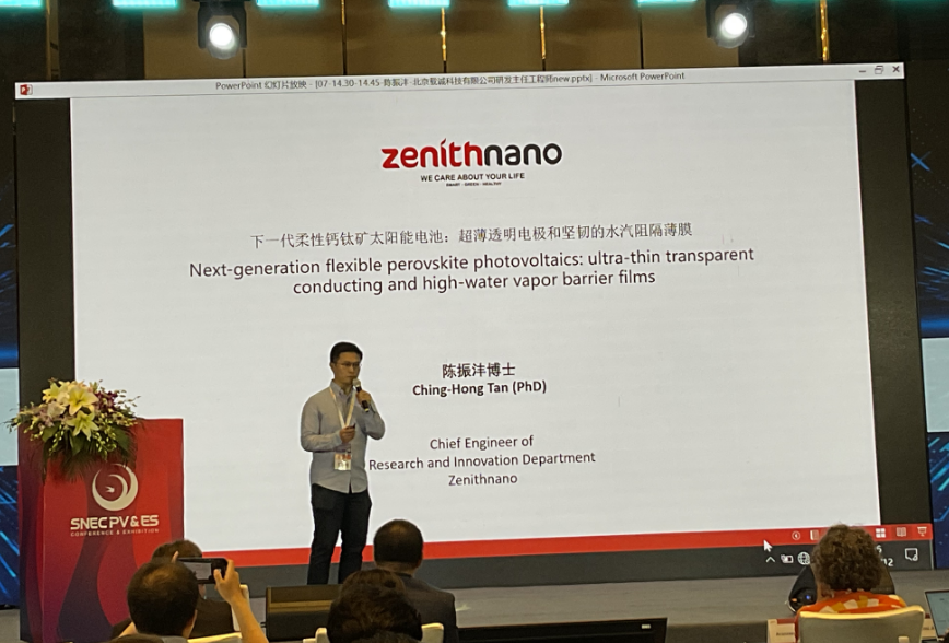 陳振灃(feng) 博(bo)士,廣(guang)東省載(zai)誠新材(cai)料(liao)有(you)限公司研發主任(ren)工程師 陳振灃(feng)博士發表了題為(wei)“下一代柔性鈣鈦礦太(tai)(tai)陽(yang)(yang)能(neng)(neng)電(dian)池(chi)(chi):超(chao)薄透(tou)明電(dian)極(ji)和堅韌的水汽(qi)阻(zu)隔薄膜(mo)”的演講(jiang),深入探討了柔性鈣鈦礦太(tai)(tai)陽(yang)(yang)能(neng)(neng)電(dian)池(chi)(chi)的最(zui)新進展(zhan)。演講(jiang)中指出(chu),Zenithnano透(tou)明導電(dian)薄膜(mo)(ZC)為(wei)光(guang)伏領域帶來了革命性突破(po),其(qi)光(guang)學透(tou)射率(lv)(lv)可(ke)達88%,電(dian)阻(zu)為(wei)10歐姆(mu)/平方,厚(hou)度僅為(wei)6-8納米(mi)。與傳統(tong)的FTO電(dian)極(ji)相比,Zenithnano電(dian)極(ji)在(zai)光(guang)學透(tou)射率(lv)(lv)和電(dian)導率(lv)(lv)方面(mian)均表現出(chu)顯著(zhu)優勢。此外,Zenithnano還開(kai)發了一種新型水汽(qi)阻(zu)隔膜(mo),該(gai)膜(mo)具(ju)有優異的水汽(qi)阻(zu)隔性能(neng)(neng)(WVWTTR <10^-1 g/m^2/day),同時保(bao)持了高透(tou)光(guang)率(lv)(lv)和低(di)電(dian)阻(zu)。通過將Zenithnano電(dian)極(ji)和水汽(qi)阻(zu)隔膜(mo)結合應用于(yu)鈣鈦礦太(tai)(tai)陽(yang)(yang)能(neng)(neng)電(dian)池(chi)(chi),電(dian)池(chi)(chi)的效率(lv)(lv)和穩定(ding)性得到了顯著(zhu)提升。在(zai)1sun 25°C RH85%的條件(jian)下,封裝的Zenithnano電(dian)池(chi)(chi)在(zai)80小時內保(bao)持了90%的初始效率(lv)(lv),顯示(shi)出(chu)卓越的長(chang)期穩定(ding)性。這(zhe)些成果不(bu)僅展(zhan)示(shi)了Zenithnano材料(liao)在(zai)提高鈣鈦礦太(tai)(tai)陽(yang)(yang)能(neng)(neng)電(dian)池(chi)(chi)性能(neng)(neng)方面(mian)的潛力,也為(wei)未來柔性光(guang)伏技(ji)術(shu)的發展(zhan)提供(gong)了新的方向。