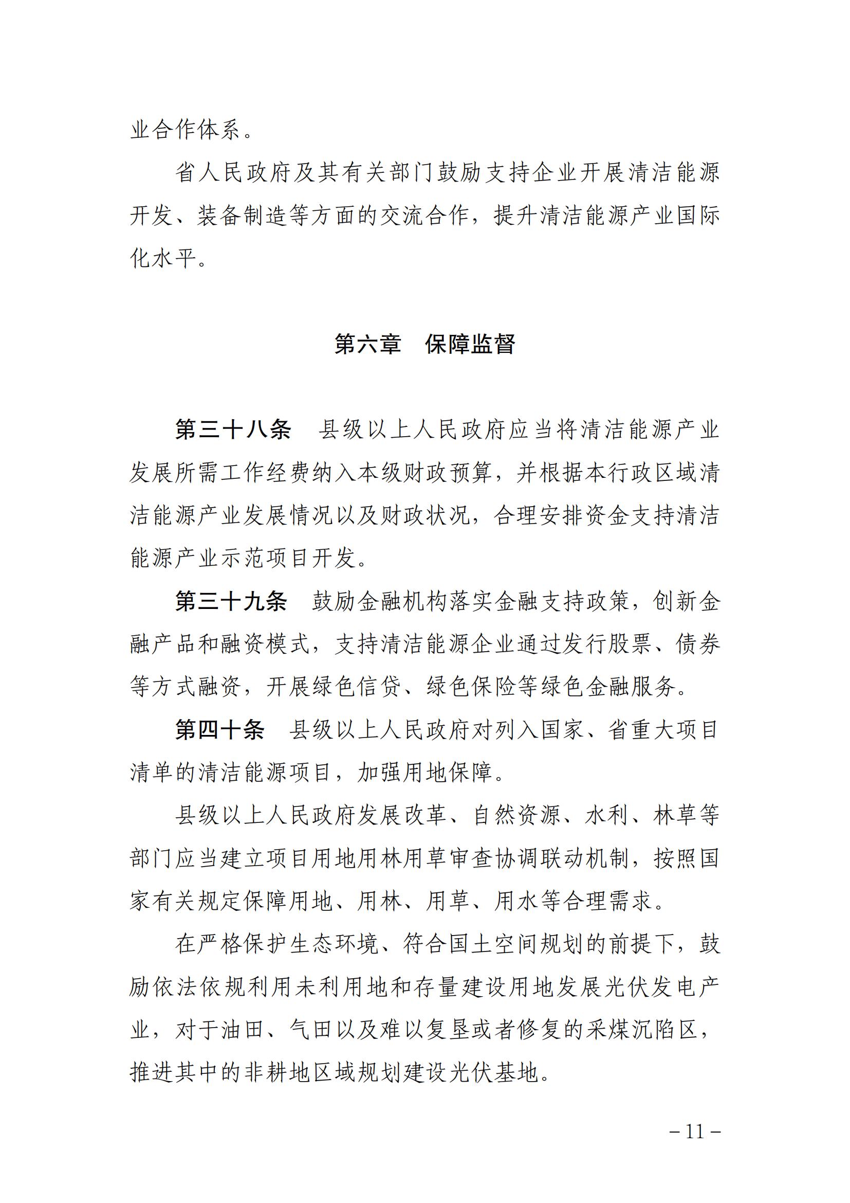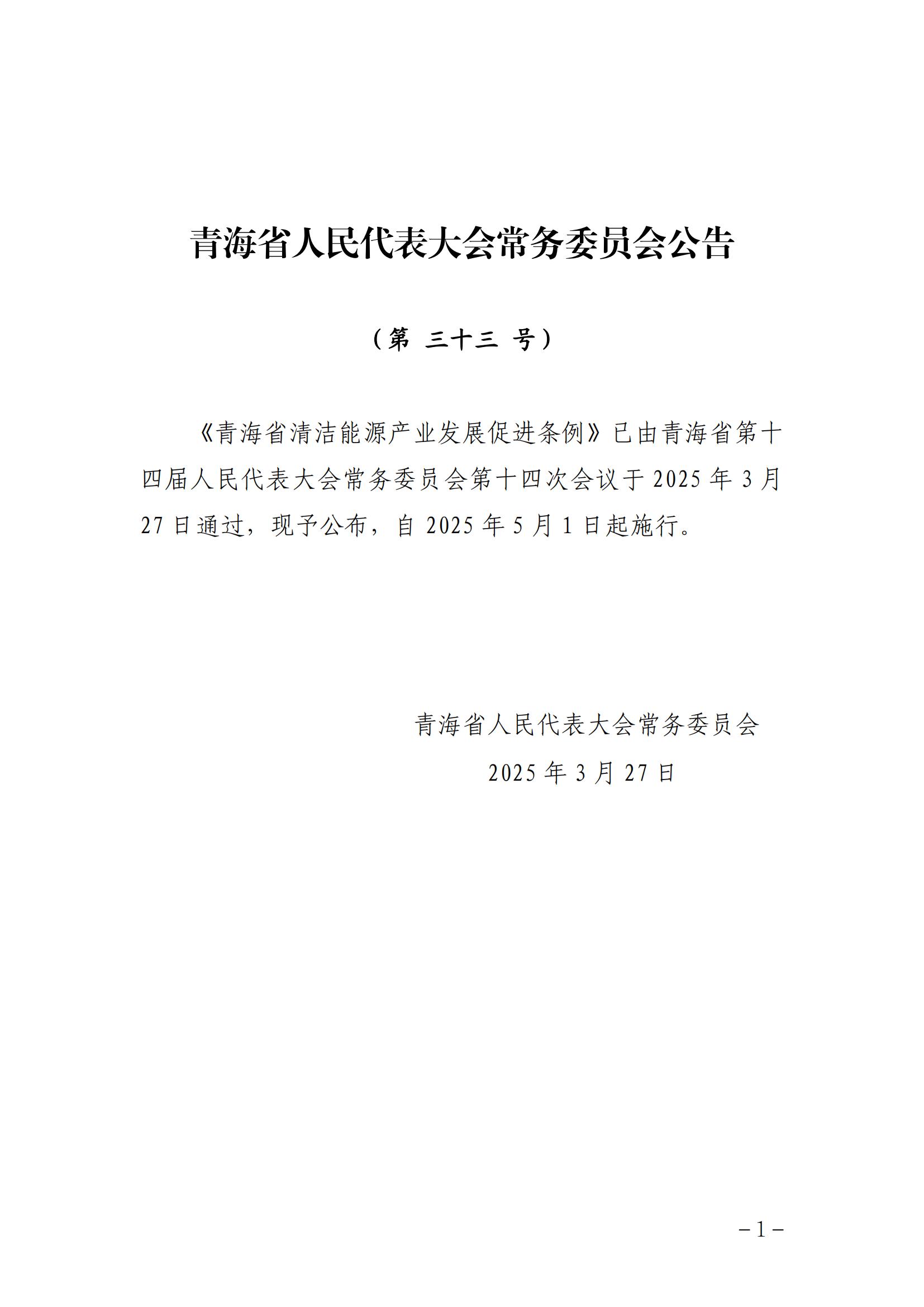 日前,青(qing)海省發改委發布(bu)《青(qing)海省清潔能源(yuan)產(chan)業(ye)發展促進條例》,文件(jian)指出,縣級以上人民(min)政(zheng)府及其有關部門應當支(zhi)持以沙(sha)漠(mo)、戈壁(bi)、荒(huang)漠(mo)為重點的風電(dian)和光(guang)伏(fu)基地建設,支(zhi)持光(guang)伏(fu)治沙(sha)生態修復項目建設,推動荒(huang)漠(mo)化治理(li)。 本(ben)條例自 2025年5月1日起(qi)實(shi)施。 原文如下: 青海省人民代表大會常務委員會公告 (第三十三號) 《青(qing)海(hai)省(sheng)清潔能源產業發展促進條例》已由(you)青(qing)海(hai)省(sheng)第十四屆人民(min)代(dai)表大會(hui)常務委員會(hui)第十四次會(hui)議于(yu)2025年(nian)3月27日通過,現予(yu)公布,自2025年(nian)5月1日起施行(xing)。 青海(hai)省人民代表大(da)會(hui)常務委(wei)員會(hui) 2025年3月27日(ri)