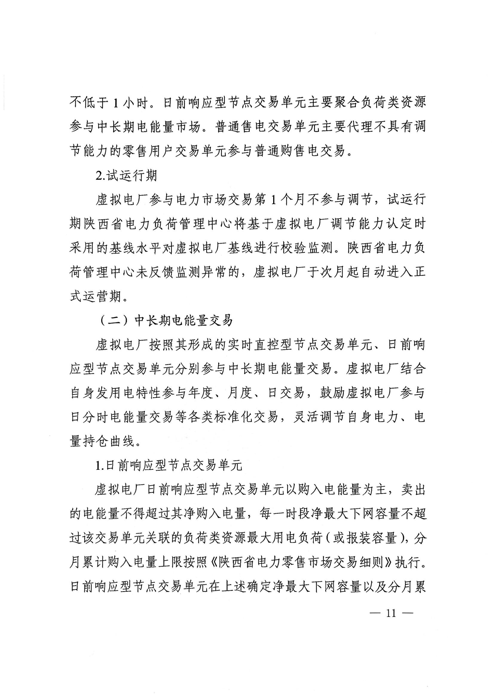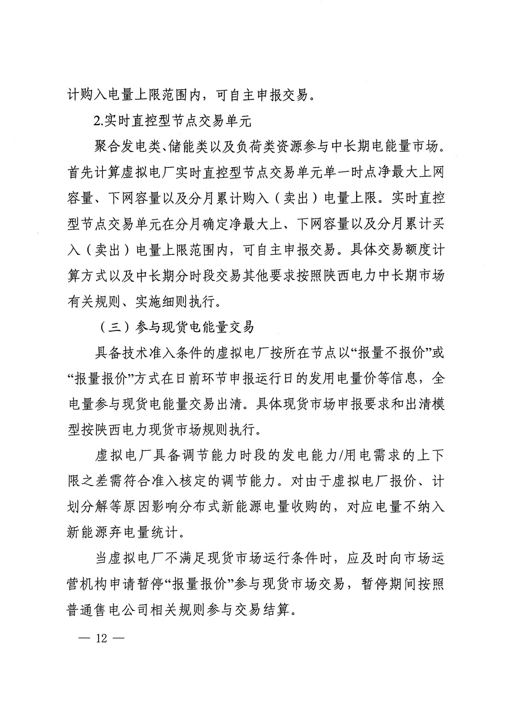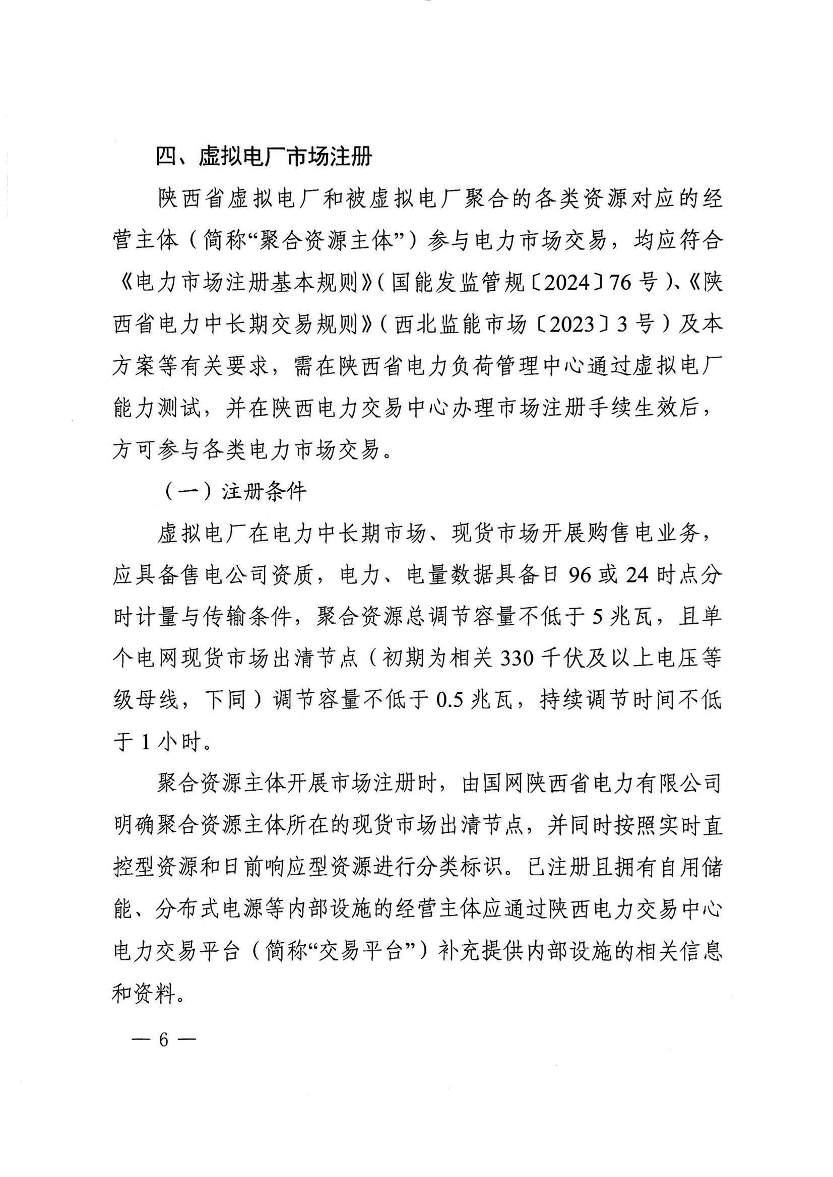 日前,陜(shan)西省(sheng)發展和改革(ge)委員(yuan)會 國(guo)家(jia)能源(yuan)局西北監管(guan)(guan)局印發《創(chuang)新支持虛(xu)擬(ni)電(dian)廠參與電(dian)力市(shi)場(chang)(chang)促進高質量發展實施方(fang)案》的通知,通知指出,虛(xu)擬(ni)電(dian)廠現階段主要聚合分(fen)布式光伏、分(fen)散式風電(dian)、獨立儲能等調度未直(zhi)接調管(guan)(guan)的分(fen)布式資源(yuan)和具備負荷調節能力的市(shi)場(chang)(chang)化(hua)用戶(hu)。聚合資源(yuan)應(ying)為具有電(dian)網(wang)企(qi)業獨立戶(hu)號(hao)、在電(dian)力交易平臺注(zhu)冊的市(shi)場(chang)(chang)主體。由調度機(ji)構直(zhi)接調度管(guan)(guan)理的發電(dian)及儲能資源(yuan)不納(na)入聚合范(fan)圍。 虛擬電(dian)廠在電(dian)力中(zhong)長期市(shi)場、現貨市(shi)場開展購售(shou)電(dian)業(ye)務,應具(ju)備(bei)售(shou)電(dian)公司資質(zhi),電(dian)力、電(dian)量數據具(ju)備(bei)日96或(huo)24時(shi)點分時(shi)計量與傳輸條件,聚合資源總調(diao)節容量不低(di)于5兆(zhao)瓦(wa),且單(dan)個電(dian)網(wang)現貨市(shi)場出(chu)清節點(初(chu)期為(wei)相關330千伏及以上電(dian)壓等級母線,下同)調(diao)節容量不低(di)于0.5兆(zhao)瓦(wa),持續調(diao)節時(shi)間不低(di)于1小時(shi)。 原文如(ru)下: