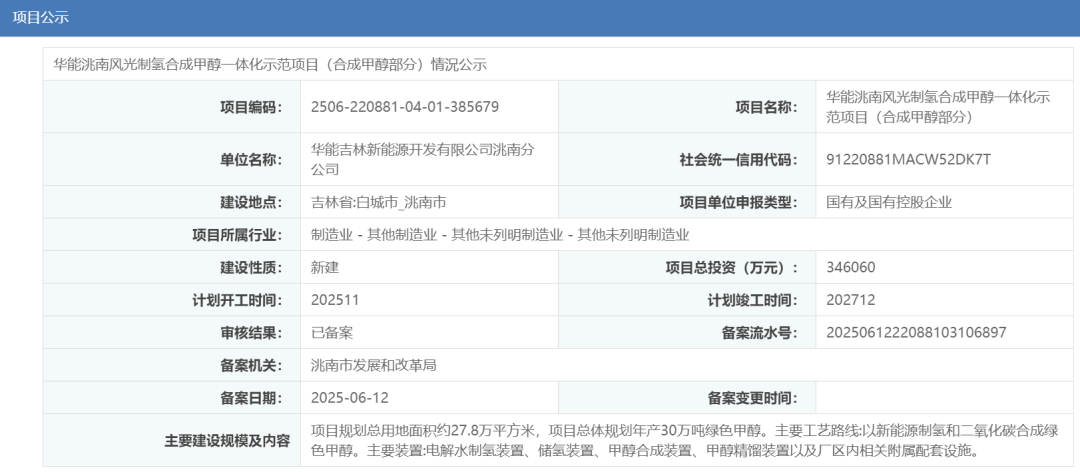 6月12日,華能洮南(nan)風光制(zhi)氫合成(cheng)甲醇一(yi)體化示(shi)范項(xiang)目(mu)(合成(cheng)甲醇部分)情況公示(shi),該項(xiang)目(mu)取得備案。 根據公(gong)示,華能洮南風光(guang)制氫合成(cheng)甲醇一體化示范項目(mu)(合成(cheng)甲醇部分)位于吉林省白城市(shi)洮南市(shi),項目(mu)單位為華能吉林新能源開發(fa)有(you)限公(gong)司(si)洮南分公(gong)司(si),項目(mu)總投(tou)資346060萬元(yuan)。 該(gai)項(xiang)(xiang)目屬(shu)于新建項(xiang)(xiang)目,項(xiang)(xiang)目規劃總(zong)用(yong)地面積約27.8萬平方米(mi),項(xiang)(xiang)目總(zong)體(ti)規劃年產(chan)30萬噸綠色甲(jia)醇(chun)。主(zhu)要工(gong)藝路線(xian):以新能(neng)源制(zhi)氫(qing)和(he)二氧(yang)化碳合(he)成綠色甲(jia)醇(chun)。主(zhu)要裝(zhuang)(zhuang)置(zhi):電解水制(zhi)氫(qing)裝(zhuang)(zhuang)置(zhi)、儲氫(qing)裝(zhuang)(zhuang)置(zhi)、甲(jia)醇(chun)合(he)成裝(zhuang)(zhuang)置(zhi)、甲(jia)醇(chun)精(jing)餾裝(zhuang)(zhuang)置(zhi)以及(ji)廠區內相(xiang)關附屬(shu)配(pei)套設施。計劃2025年11月開工(gong),2027年12月竣工(gong)。