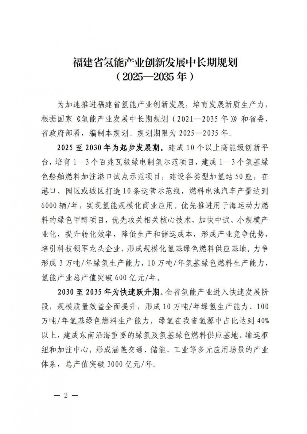 6月(yue)18日,福(fu)(fu)建(jian)省發展和改革委(wei)員會關于印發《福(fu)(fu)建(jian)省氫能產業創(chuang)新發展中長期規劃(2025—2035年)》的通知。 文件指出,規劃期限為2025—2035年。 · 2025至2030年(nian)為起步(bu)發展期(qi)。建成10個(ge)(ge)以上高能(neng)級創新平臺,培育1—3個(ge)(ge)百兆瓦(wa)級綠(lv)(lv)電制氫(qing)(qing)示范項(xiang)目(mu),建成1—3個(ge)(ge)氫(qing)(qing)基綠(lv)(lv)色船舶燃(ran)(ran)料(liao)加注(zhu)港(gang)口試點示范項(xiang)目(mu),建設各類(lei)型加氫(qing)(qing)站50座,在(zai)港(gang)口、園區或城區打造(zao)10條運營(ying)示范線(xian),燃(ran)(ran)料(liao)電池汽車產(chan)(chan)量達到6000輛/年(nian),實現(xian)氫(qing)(qing)能(neng)規(gui)模化商業應(ying)用。優先推進用于(yu)海運動力(li)燃(ran)(ran)料(liao)的綠(lv)(lv)色甲醇項(xiang)目(mu),優先攻(gong)關(guan)相關(guan)核心技術,加快中試、小規(gui)模產(chan)(chan)業化,提升轉化效率,降低生(sheng)產(chan)(chan)和(he)儲運成本,形(xing)成產(chan)(chan)業競爭(zheng)優勢,培引科技領軍龍頭企業,形(xing)成規(gui)模化氫(qing)(qing)基綠(lv)(lv)色燃(ran)(ran)料(liao)供應(ying)基地。力(li)爭(zheng)形(xing)成3萬噸/年(nian)綠(lv)(lv)氫(qing)(qing)生(sheng)產(chan)(chan)能(neng)力(li),10萬噸/年(nian)氫(qing)(qing)基綠(lv)(lv)色燃(ran)(ran)料(liao)生(sheng)產(chan)(chan)能(neng)力(li),氫(qing)(qing)能(neng)產(chan)(chan)業總產(chan)(chan)值突破600億元/年(nian)。 · 2030至2035年(nian)為(wei)快(kuai)速(su)(su)躍升期。全(quan)省氫能產業進入(ru)快(kuai)速(su)(su)發展階段(duan),規模質量效益全(quan)面提升,形成(cheng)10萬噸/年(nian)綠(lv)氫生產能力、100萬噸/年(nian)氫基(ji)綠(lv)色燃(ran)料生產能力,綠(lv)氫在福建(jian)省氫源中占比達到40%以上,建(jian)成(cheng)東南沿海重要的綠(lv)氫及氫基(ji)綠(lv)色燃(ran)料供應基(ji)地、輸運樞紐(niu)和加(jia)注(zhu)中心,形成(cheng)涵蓋交通(tong)、儲能、工業等多元應用場景的產業體系,總產值(zhi)突破(po)3000億元/年(nian)。 發展路徑方面: 充分挖(wa)掘(jue)氫(qing)能多元應用(yong)潛力(li),發揮清潔能源(yuan)資源(yuan)優勢促進氫(qing)能與福建省電力(li)、石化、油(you)氣輸配、冶金(jin)、交通等產(chan)業協同發展,打(da)造若干(gan)氫(qing)能產(chan)業集(ji)聚區和(he)特色產(chan)業集(ji)群。 在制氫端:依托福建省(sheng)石(shi)化產業優勢,近(jin)期以工(gong)(gong)業副產氫(qing)就(jiu)近(jin)供(gong)給為主,大(da)力發展氫(qing)氣提純技術,提高工(gong)(gong)業副產氫(qing)利用率,深化副產氫(qing)在鋼鐵、煤(mei)炭、化工(gong)(gong)等領域產業化應(ying)用,帶動傳統(tong)產業轉型升級,實現千億級重大(da)石(shi)化項目產業鏈拓展延(yan)伸;中遠(yuan)期積極引導利用風、光等多種(zhong)可再(zai)生(sheng)能源制(zhi)氫(qing),逐(zhu)步降低制(zhi)氫(qing)成本,擴大(da)制(zhi)氫(qing)規模(mo)。 在儲運端:重點發展(zhan)高壓(ya)氣(qi)態儲(chu)氫和長管拖車輸(shu)氫,按照低壓(ya)到(dao)高壓(ya)、氣(qi)態到(dao)多相態的(de)路(lu)徑(jing)逐(zhu)步(bu)提升運輸(shu)能力;推進以氨(an)為儲(chu)氫介質的(de)特色技(ji)術路(lu)線,實現(xian)大規模、長距離(li)運輸(shu);支持(chi)有機液(ye)態儲(chu)氫、固態儲(chu)氫及相關材料及器件制造(zao)業。 在加注端:建設(she)以加氫(qing)綜(zong)合能源(yuan)站(zhan)為(wei)主的(de)氫(qing)能基礎設(she)施,支持(chi)利用(yong)(yong)現有加油(you)加氣站(zhan)改擴建加氫(qing)設(she)施,先行先試(shi)新的(de)制氫(qing)技術(shu);重點推進物(wu)流、港(gang)口、園區(qu)、環衛等(deng)專用(yong)(yong)加氫(qing)站(zhan)建設(she)。在福州港(gang)、廈門港(gang)等(deng)國家(jia)港(gang)口建設(she)氫(qing)基綠色燃料加注中心(xin),重點推進綠色甲醇、綠氨在船舶(bo)使(shi)用(yong)(yong),探(tan)索可持(chi)續(xu)航空燃料加注。 在應用端:在(zai)化工領(ling)域(yu)推動氫(qing)制(zhi)合成氨、甲(jia)醇(chun)等氫(qing)基燃(ran)(ran)料(liao)產業(ye)化;在(zai)冶金(jin)領(ling)域(yu)開展“氫(qing)冶金(jin)”替代(dai)碳(tan)還原,推進產業(ye)綠(lv)色轉型;在(zai)運輸領(ling)域(yu)規模(mo)化推廣氫(qing)燃(ran)(ran)料(liao)電(dian)(dian)(dian)(dian)池汽車、船舶(bo)、工程機械等,構建氫(qing)能(neng)(neng)示(shi)(shi)范交通(tong)線,帶動氫(qing)燃(ran)(ran)料(liao)電(dian)(dian)(dian)(dian)池關鍵核(he)心材(cai)料(liao)及零(ling)部件產業(ye)集聚發展;在(zai)儲能(neng)(neng)發電(dian)(dian)(dian)(dian)領(ling)域(yu)推進氫(qing)能(neng)(neng)在(zai)應急備用電(dian)(dian)(dian)(dian)源(yuan)(yuan)﹑電(dian)(dian)(dian)(dian)網調(diao)峰等場景的(de)示(shi)(shi)范應用;積極探(tan)索天然氣(qi)摻氫(qing)“氫(qing)進萬家”科技示(shi)(shi)范工程,引導氫(qing)能(neng)(neng)進入居(ju)民能(neng)(neng)源(yuan)(yuan)消費終端,為打造(zao)“氫(qing)能(neng)(neng)社(she)會(hui)”奠(dian)定基礎。 產業布局方面: 立足福(fu)建省氫能(neng)產業發(fa)展(zhan)基礎和(he)資源特色,充分發(fa)揮龍頭企業、高(gao)校、科研院所引領(ling)帶動作(zuo)用,重(zhong)點打造(zao)“兩(liang)核心(xin)一保障(zhang)一走廊(lang)一網絡”的氫能(neng)產業發(fa)展(zhan)布局,形成影響力(li)輻射粵港澳(ao)、長三角等區域的氫能(neng)技術、裝備(bei)、原料、產品、標準輸出高(gao)地。 兩個核(he)(he)心(xin)一個保(bao)障(zhang):以福(fu)州(zhou)、廈(sha)門為核(he)(he)心(xin),以漳州(zhou)為保(bao)障