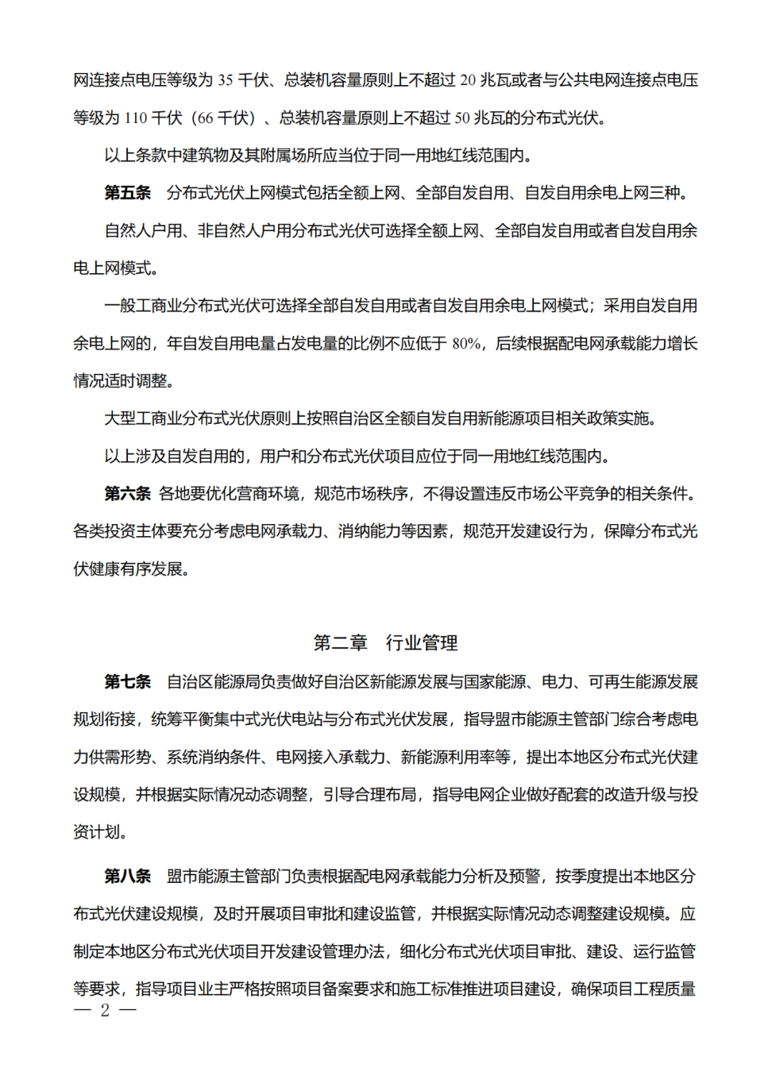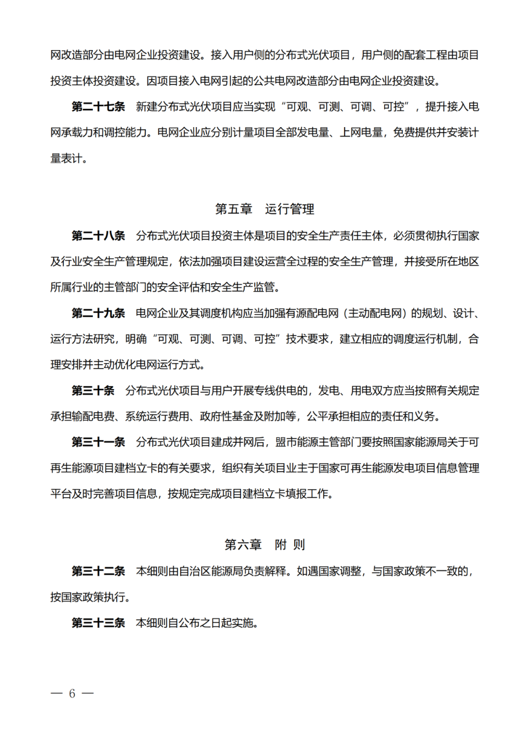6月20日,內蒙古自治區能源局發布關于印發《內蒙古自治區分布式光伏項目開發建設管理實施細則》的通知。文件明確,分布式光伏上網模式包括全額上網、全部自發自用、自發自用余電上網三種。 自然人戶用、非自然人戶用分布式光伏可選擇全額上網、全部自發自用或者自發自用余電上網模式。 一般工商業分布式光伏可選擇全部自發自用或者自發自用余電上網模式;采用自發自用余電上網的,年自發自用電量占發電量的比例不應低于80%,后續根據配電網承載能力增長情況適時調整。 大型工商業分布式光伏原則上按照自治區全額自發自用新能源項目相關政策實施。 以上涉及自發自用的,用戶和分布式光伏項目應位于同一用地紅線范圍內。 詳情如下: 內蒙古自治區能源局關于印發《內蒙古自治區分布式光伏項目開發建設管理實施細則》的通知 內能源發〔2025〕5號 各盟市能源局,有關盟市發展改革委,滿洲里、二連浩特市發展改革委,內蒙古電力公司、國網蒙東電力公司: 為落實好國家分布式光伏開發管理政策及自治區能源領域簡政放權有關要求,進一步規范全區分布式光伏開發和管理,自治區能源局結合全區分布式光伏發展實際,制定了《內蒙古自治區分布式光伏項目開發建設管理實施細則》,現印發你們,請認真執行。 此通知。 附件:內蒙古自治區分布式光伏項目開發建設管理實施細則 內蒙古自治區能源局 2025年6月20日