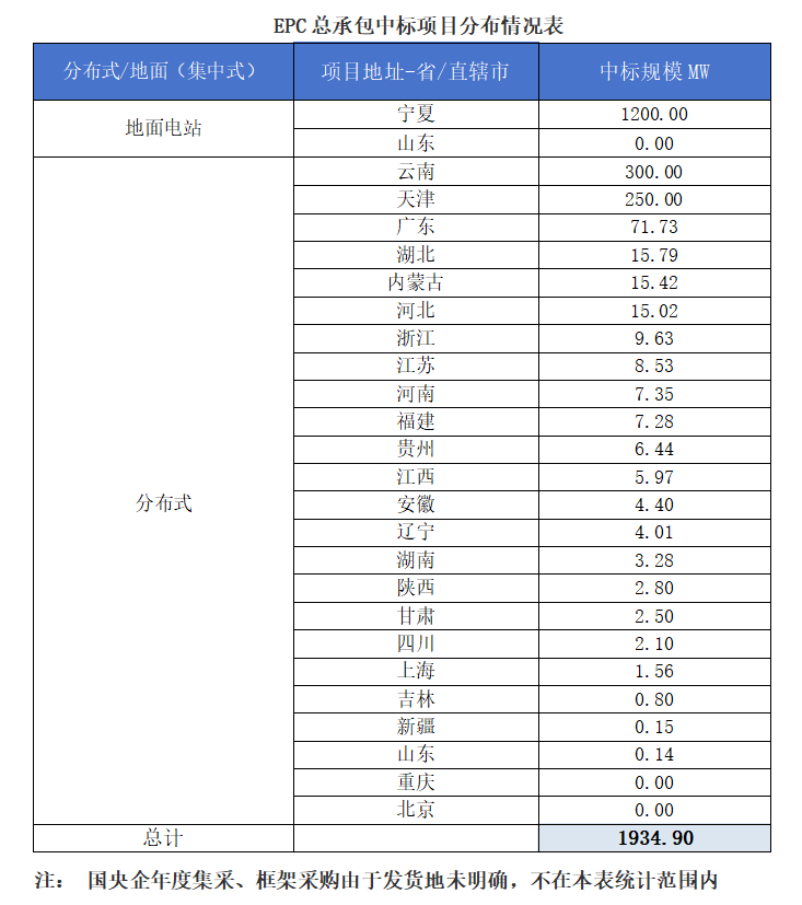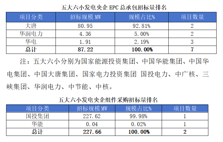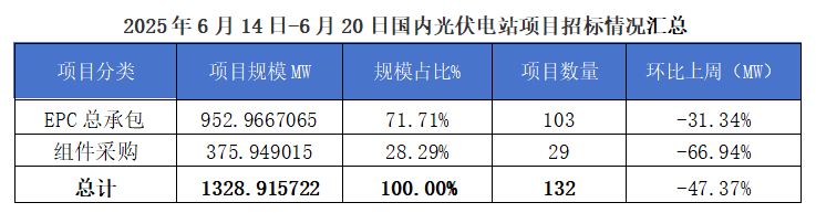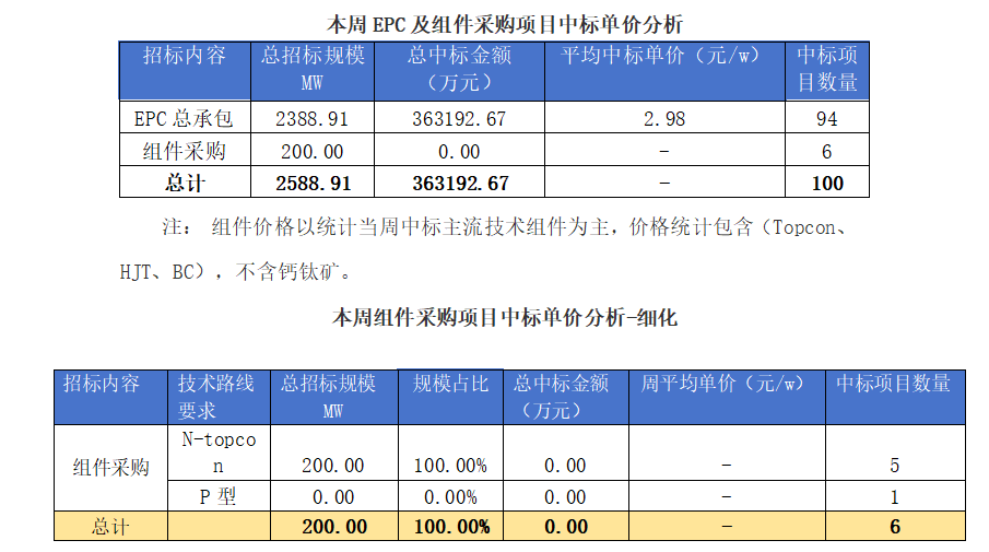 一、光伏項目招標情況匯總: 根(gen)據(ju)Gessey蓋錫(xi)咨詢統計,2025年6月14日-6月20日累計光伏(fu)招(zhao)(zhao)標項(xiang)目為(wei)132個(ge),項(xiang)目規(gui)模合計為(wei)1328.92MW。光伏(fu)組件采購(gou)招(zhao)(zhao)標項(xiang)目為(wei)29個(ge),招(zhao)(zhao)標規(gui)模為(wei)375.95MW,EPC總承包招(zhao)(zhao)標項(xiang)目為(wei)103個(ge),招(zhao)(zhao)標規(gui)模為(wei)952.97MW。 我們(men)統(tong)計(ji)包含(han)大(da)型央企(qi)(qi)國(guo)企(qi)(qi)、地(di)方(fang)(fang)能源集團、地(di)方(fang)(fang)政府機(ji)關、兩大(da)電(dian)網(wang)、央企(qi)(qi)總包企(qi)(qi)業、知名(ming)(ming)光伏企(qi)(qi)業等(deng),其中五大(da)六小發電(dian)央企(qi)(qi)占總招標規模(mo)較高,具體各企(qi)(qi)業排名(ming)(ming)如下表(biao): 二、中標項目分布類型匯總情況 本周中(zhong)標(biao)項目需求按(an)照(zhao)招(zhao)標(biao)場(chang)景地(di)(di)分布,分布式光伏(fu)主(zhu)要集中(zhong)在(zai)甘肅、山西(xi)、貴州、安徽等(deng)地(di)(di)區(qu),即(ji)主(zhu)要集中(zhong)在(zai)東北部地(di)(di)區(qu);集中(zhong)式光伏(fu)主(zhu)要集中(zhong)在(zai)山東等(deng)地(di)(di)區(qu),即(ji)主(zhu)要集中(zhong)在(zai)華東地(di)(di)區(qu)。 三、EPC總承包及組件采購情況匯總 本周光伏EPC總承包(bao)中標規(gui)模達(da)2388.91 MW,總中標金額363192.67萬元,平均中標單價為2.98元/W,中標數(shu)量94個。 本(ben)周光伏組件(jian)采(cai)購中標(biao)規模(mo)達(da)200 MW,總中標(biao)金額0萬元,平均中標(biao)單價為-元/W,中標(biao)數量6個。 上一篇: 蓋錫咨詢:6月25日光伏行業要聞速覽