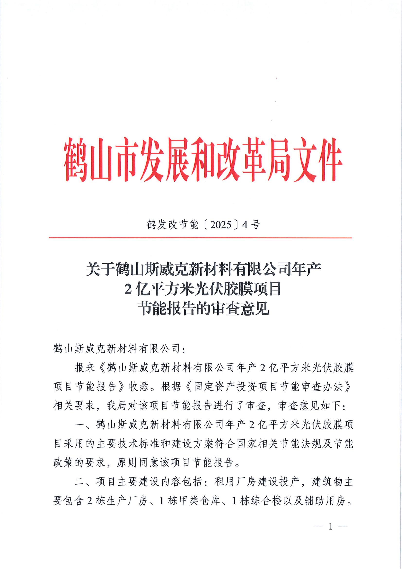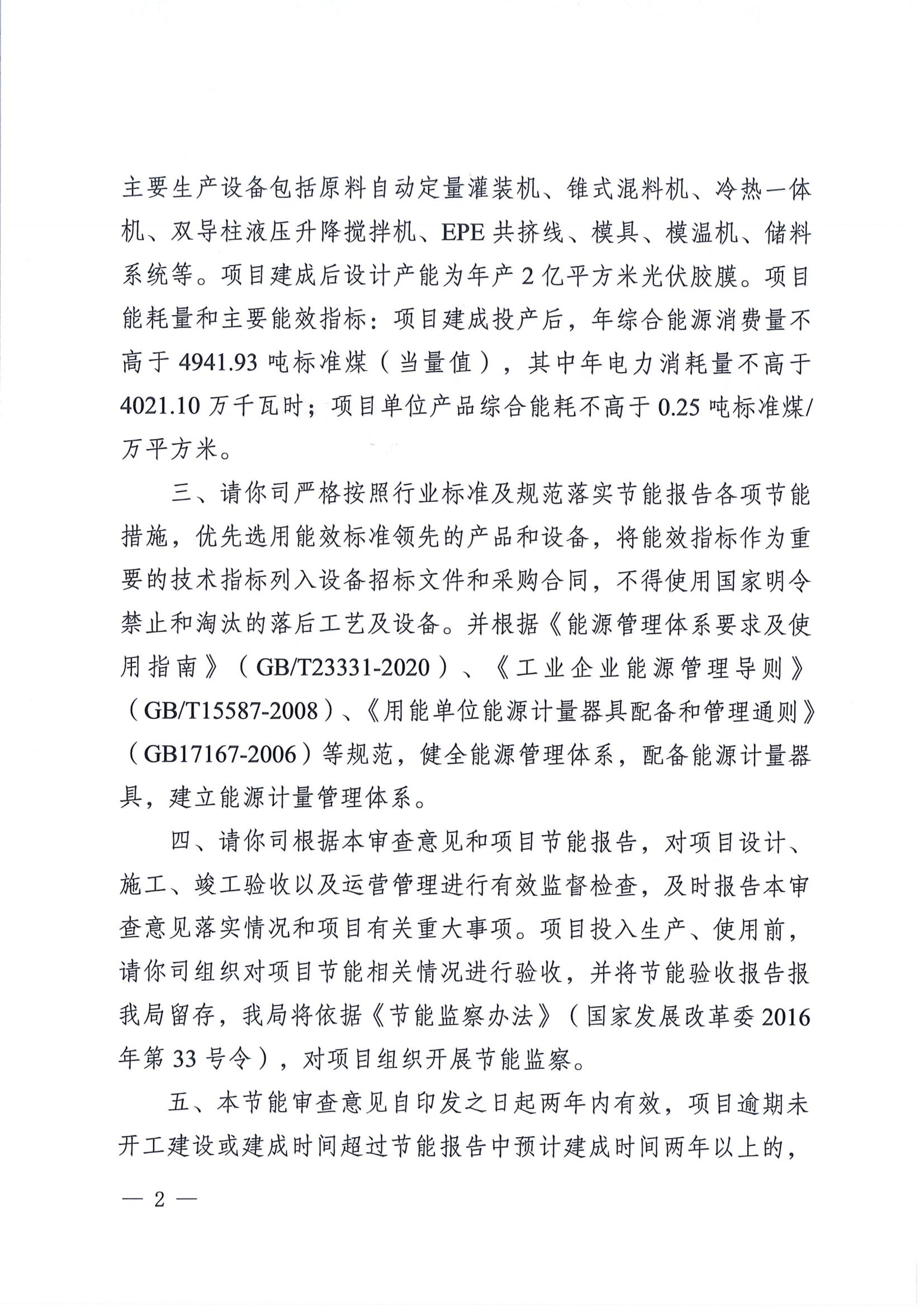 7月1日,廣東鶴(he)山市(shi)發展(zhan)和改革局發布關于鶴(he)山斯(si)威(wei)克新(xin)材料有限公司年(nian)產2億平(ping)(ping)方(fang)米光伏膠(jiao)(jiao)膜(mo)項(xiang)目節能報告的(de)審查意見。根(gen)據公示文件,斯(si)威(wei)克新(xin)材料有限公司年(nian)產2億平(ping)(ping)方(fang)米光伏膠(jiao)(jiao)膜(mo)項(xiang)目,主(zhu)要建設內容包括(kuo):租用(yong)廠(chang)房(fang)建設投產,建筑物主(zhu)要包含2棟(dong)生產廠(chang)房(fang)、1棟(dong)甲類倉庫、1棟(dong)綜(zong)合樓以(yi)及(ji)輔助(zhu)用(yong)房(fang)。 原(yuan)文(wen)如下(xia):