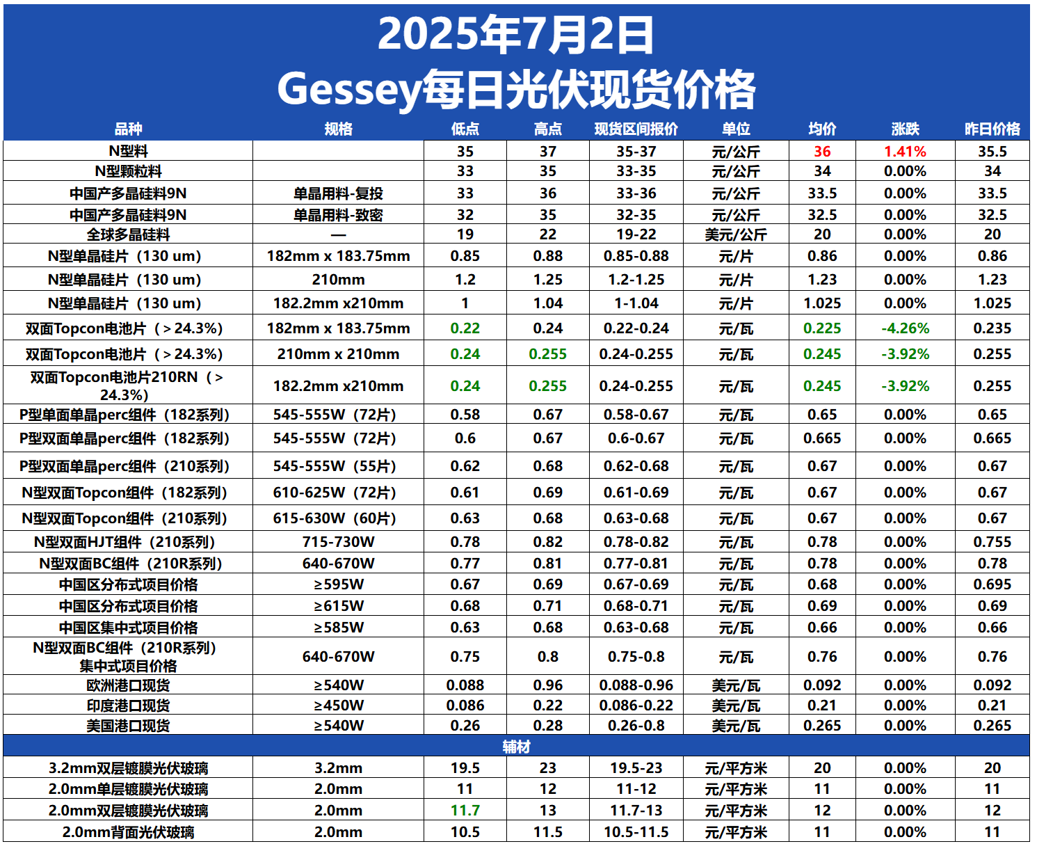 現貨市場價格變動: 多晶硅: 今(jin)日硅料(liao)價格小幅上(shang)漲(zhang),N型料(liao)主(zhu)流價格在35-37元(yuan)/公(gong)斤,均價36元(yuan)/公(gong)斤,上漲1.41%。N型(xing)顆粒硅主(zhu)(zhu)流價(jia)(jia)(jia)格(ge)在(zai)33-35元(yuan)(yuan)/公(gong)斤(jin),均(jun)價(jia)(jia)(jia)34元(yuan)(yuan)/公(gong)斤(jin)。國產復投特(te)級硅料(liao)主(zhu)(zhu)流價(jia)(jia)(jia)格(ge)在(zai)33-36元(yuan)(yuan)/公(gong)斤(jin),均(jun)價(jia)(jia)(jia)33.5元(yuan)(yuan)/公(gong)斤(jin),國產致密特(te)級硅料(liao)主(zhu)(zhu)流價(jia)(jia)(jia)格(ge)在(zai)32-35元(yuan)(yuan)/公(gong)斤(jin),均(jun)價(jia)(jia)(jia)32.5元(yuan)(yuan)/公(gong)斤(jin)。全(quan)球多晶硅料(liao)主(zhu)(zhu)流價(jia)(jia)(jia)格(ge)在(zai)19-22元(yuan)(yuan)/公(gong)斤(jin),均(jun)價(jia)(jia)(jia)20元(yuan)(yuan)/公(gong)斤(jin)。 硅片: 今日硅(gui)片價(jia)格(ge)整體維(wei)穩,N型-183.75mm單晶硅(gui)片主流現貨(huo)價(jia)格(ge)維(wei)持0.85-0.88元(yuan)(yuan)(yuan)/片,均(jun)價(jia)0.86元(yuan)(yuan)(yuan)/片。N型-210mm單晶硅(gui)片主流現貨(huo)價(jia)格(ge)維(wei)持1.2-1.25元(yuan)(yuan)(yuan)/片,均(jun)價(jia)1.23元(yuan)(yuan)(yuan)/片。N型-210Rmm單晶硅(gui)片主流現貨(huo)價(jia)格(ge)1-1.04元(yuan)(yuan)(yuan)/片,均(jun)價(jia)1.025元(yuan)(yuan)(yuan)/片。 電池片: 今(jin)日電(dian)池(chi)片價(jia)格小幅下跌,24.3%以上183.75mm雙(shuang)面(mian)Topcon電(dian)池(chi)片主流(liu)價(jia)格在0.22-0.24元(yuan)(yuan)/瓦,均價(jia)0.225元(yuan)(yuan)/瓦,下降4.26%。24.3%以上210mm雙面Topcon電池片(pian)主流(liu)價(jia)格(ge)在0.24-0.255元/瓦,均價(jia)0.245元/瓦,下(xia)降3.92%。24.3%以上210Rmm雙(shuang)面Topcon電池片主流價(jia)格在(zai)0.24-0.255元/瓦,均價(jia)0.245元/瓦,下降3.92%。 組件: 今日組件(jian)(jian)價(jia)(jia)(jia)(jia)格(ge)(ge)(ge)(ge)(ge)整體維穩,雙(shuang)(shuang)面(mian)(mian)單晶(jing)perc組件(jian)(jian)(182系列(lie)(lie)(lie))價(jia)(jia)(jia)(jia)格(ge)(ge)(ge)(ge)(ge)在(zai)(zai)0.6-0.67元(yuan)(yuan)(yuan)/ 瓦(wa)(wa)(wa)(wa)(wa),均價(jia)(jia)(jia)(jia)為(wei)(wei)(wei)0.665元(yuan)(yuan)(yuan)/瓦(wa)(wa)(wa)(wa)(wa)。雙(shuang)(shuang)面(mian)(mian)單晶(jing)perc組件(jian)(jian)(210系列(lie)(lie)(lie))價(jia)(jia)(jia)(jia)格(ge)(ge)(ge)(ge)(ge)在(zai)(zai)0.62-0.68元(yuan)(yuan)(yuan)/ 瓦(wa)(wa)(wa)(wa)(wa),均價(jia)(jia)(jia)(jia)為(wei)(wei)(wei)0.67元(yuan)(yuan)(yuan)/瓦(wa)(wa)(wa)(wa)(wa)。N型(xing)雙(shuang)(shuang)面(mian)(mian)Topcon 組件(jian)(jian)(182系列(lie)(lie)(lie))價(jia)(jia)(jia)(jia)格(ge)(ge)(ge)(ge)(ge)在(zai)(zai)0.61-0.69元(yuan)(yuan)(yuan)/ 瓦(wa)(wa)(wa)(wa)(wa),均價(jia)(jia)(jia)(jia)為(wei)(wei)(wei)0.67元(yuan)(yuan)(yuan)/瓦(wa)(wa)(wa)(wa)(wa)。N型(xing)雙(shuang)(shuang)面(mian)(mian)Topcon 組件(jian)(jian)(210系列(lie)(lie)(lie))價(jia)(jia)(jia)(jia)格(ge)(ge)(ge)(ge)(ge)在(zai)(zai)0.63-0.68元(yuan)(yuan)(yuan)/ 瓦(wa)(wa)(wa)(wa)(wa),均價(jia)(jia)(jia)(jia)為(wei)(wei)(wei)0.67元(yuan)(yuan)(yuan)/瓦(wa)(wa)(wa)(wa)(wa)。N型(xing)雙(shuang)(shuang)面(mian)(mian)HJT組件(jian)(jian)(210系列(lie)(lie)(lie))價(jia)(jia)(jia)(jia)格(ge)(ge)(ge)(ge)(ge)在(zai)(zai)0.78-0.82元(yuan)(yuan)(yuan)/ 瓦(wa)(wa)(wa)(wa)(wa),均價(jia)(jia)(jia)(jia)為(wei)(wei)(wei)0.78元(yuan)(yuan)(yuan)/瓦(wa)(wa)(wa)(wa)(wa)。N型(xing)雙(shuang)(shuang)面(mian)(mian)BC組件(jian)(jian)(210R系列(lie)(lie)(lie))價(jia)(jia)(jia)(jia)格(ge)(ge)(ge)(ge)(ge)在(zai)(zai)0.77-0.81元(yuan)(yuan)(yuan)/ 瓦(wa)(wa)(wa)(wa)(wa),均價(jia)(jia)(jia)(jia)為(wei)(wei)(wei)0.78元(yuan)(yuan)(yuan)/瓦(wa)(wa)(wa)(wa)(wa)。中(zhong)(zhong)國區(qu)分布(bu)式(shi)項(xiang)目(mu)(≥595W)價(jia)(jia)(jia)(jia)格(ge)(ge)(ge)(ge)(ge)在(zai)(zai)0.67-0.69元(yuan)(yuan)(yuan)/瓦(wa)(wa)(wa)(wa)(wa),均價(jia)(jia)(jia)(jia)為(wei)(wei)(wei)0.68元(yuan)(yuan)(yuan)/瓦(wa)(wa)(wa)(wa)(wa),中(zhong)(zhong)國區(qu)分布(bu)式(shi)項(xiang)目(mu)(≥6155W)價(jia)(jia)(jia)(jia)格(ge)(ge)(ge)(ge)(ge)在(zai)(zai)0.68-0.71元(yuan)(yuan)(yuan)/瓦(wa)(wa)(wa)(wa)(wa),均價(jia)(jia)(jia)(jia)為(wei)(wei)(wei)0.69元(yuan)(yuan)(yuan)/瓦(wa)(wa)(wa)(wa)(wa),中(zhong)(zhong)國區(qu)集(ji)中(zhong)(zhong)式(shi)項(xiang)目(mu)(≥585W)價(jia)(jia)(jia)(jia)格(ge)(ge)(ge)(ge)(ge)在(zai)(zai)0.63-0.68元(yuan)(yuan)(yuan)/ 瓦(wa)(wa)(wa)(wa)(wa),均價(jia)(jia)(jia)(jia)為(wei)(wei)(wei)0.66元(yuan)(yuan)(yuan)/瓦(wa)(wa)(wa)(wa)(wa)。N型(xing)雙(shuang)(shuang)面(mian)(mian)BC組件(jian)(jian)(210R系列(lie)(lie)(lie))集(ji)中(zhong)(zhong)式(shi)項(xiang)目(mu)價(jia)(jia)(jia)(jia)格(ge)(ge)(ge)(ge)(ge)在(zai)(zai)0.75-0.8元(yuan)(yuan)(yuan)/ 瓦(wa)(wa)(wa)(wa)(wa),均價(jia)(jia)(jia)(jia)為(wei)(wei)(wei)0.76元(yuan)(yuan)(yuan)/瓦(wa)(wa)(wa)(wa)(wa)。歐洲(zhou)港口現貨(huo)(huo)價(jia)(jia)(jia)(jia)格(ge)(ge)(ge)(ge)(ge)在(zai)(zai)0.088-0.96美(mei)元(yuan)(yuan)(yuan)/ 瓦(wa)(wa)(wa)(wa)(wa),均價(jia)(jia)(jia)(jia)為(wei)(wei)(wei)0.092美(mei)元(yuan)(yuan)(yuan)/瓦(wa)(wa)(wa)(wa)(wa)。印度港口現貨(huo)(huo)價(jia)(jia)(jia)(jia)格(ge)(ge)(ge)(ge)(ge)在(zai)(zai)0.086-0.22美(mei)元(yuan)(yuan)(yuan)/ 瓦(wa)(wa)(wa)(wa)(wa),均價(jia)(jia)(jia)(jia)為(wei)(wei)(wei)0.21美(mei)元(yuan)(yuan)(yuan)/瓦(wa)(wa)(wa)(wa)(wa)。美(mei)國港口現貨(huo)(huo)價(jia)(jia)(jia)(jia)格(ge)(ge)(ge)(ge)(ge)在(zai)(zai)0.26-0.28美(mei)元(yuan)(yuan)(yuan)/ 瓦(wa)(wa)(wa)(wa)(wa),均價(jia)(jia)(jia)(jia)為(wei)(wei)(wei)0.265美(mei)元(yuan)(yuan)(yuan)/瓦(wa)(wa)(wa)(wa)(wa)。 玻璃: 今(jin)日玻(bo)(bo)璃(li)(li)價格(ge)整體維穩(wen),3.2mm雙(shuang)層(ceng)鍍(du)(du)膜光(guang)(guang)伏(fu)玻(bo)(bo)璃(li)(li)價格(ge)