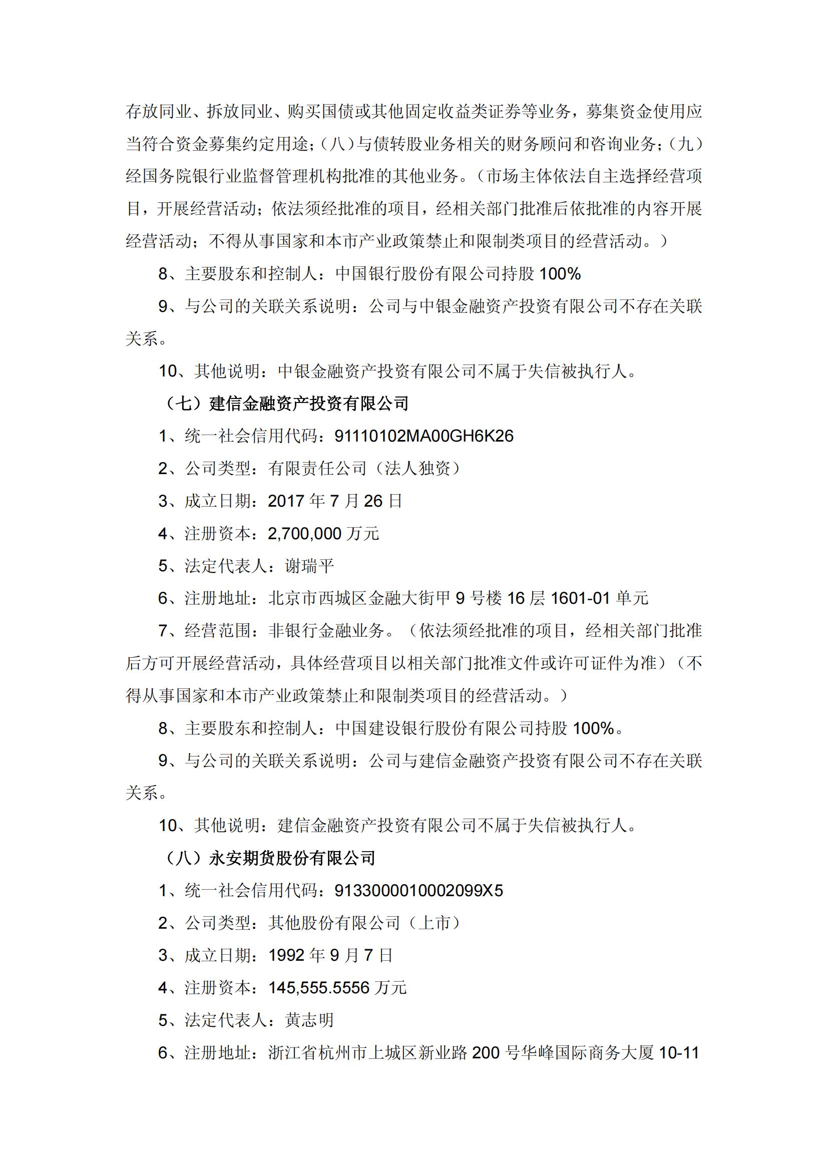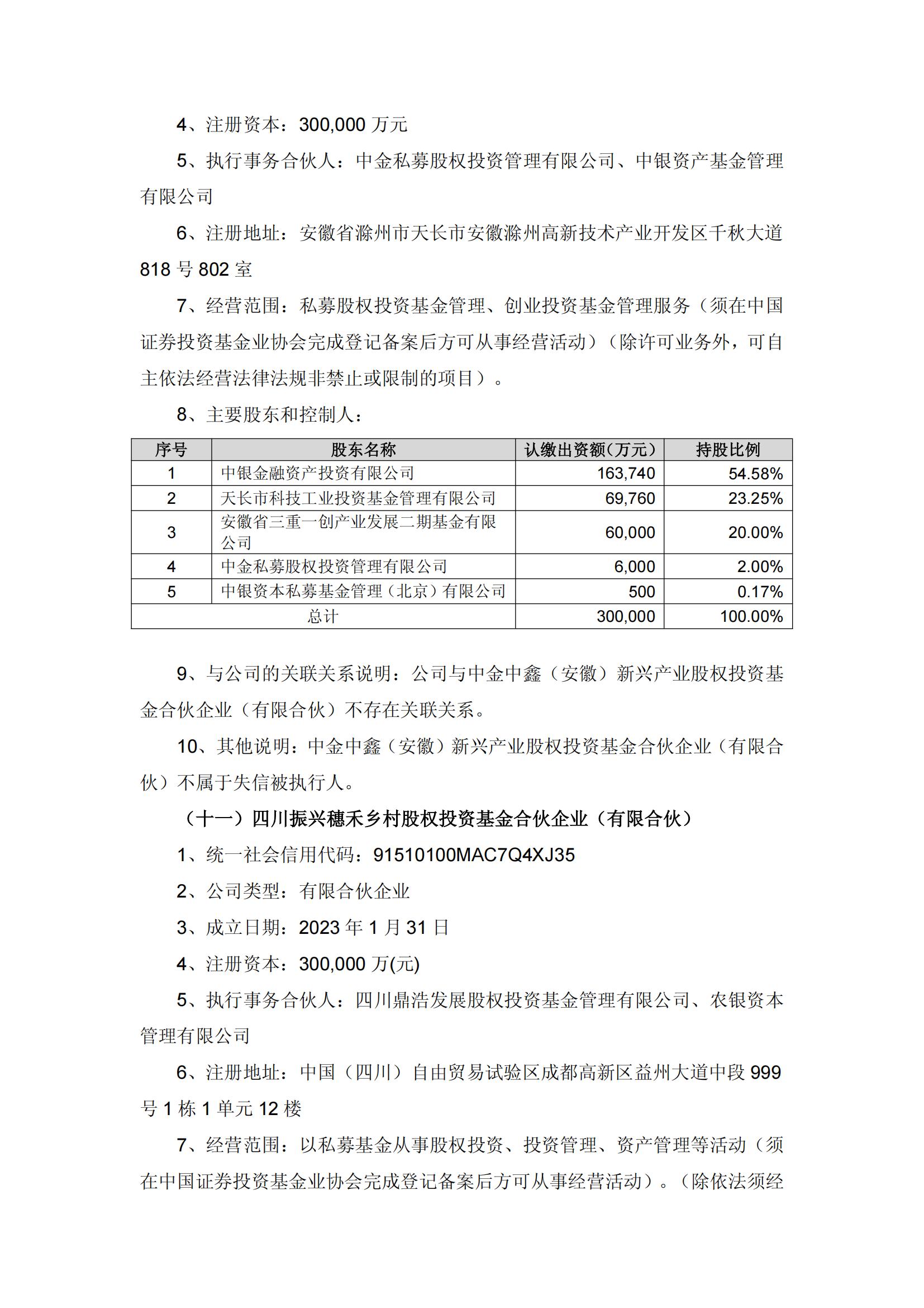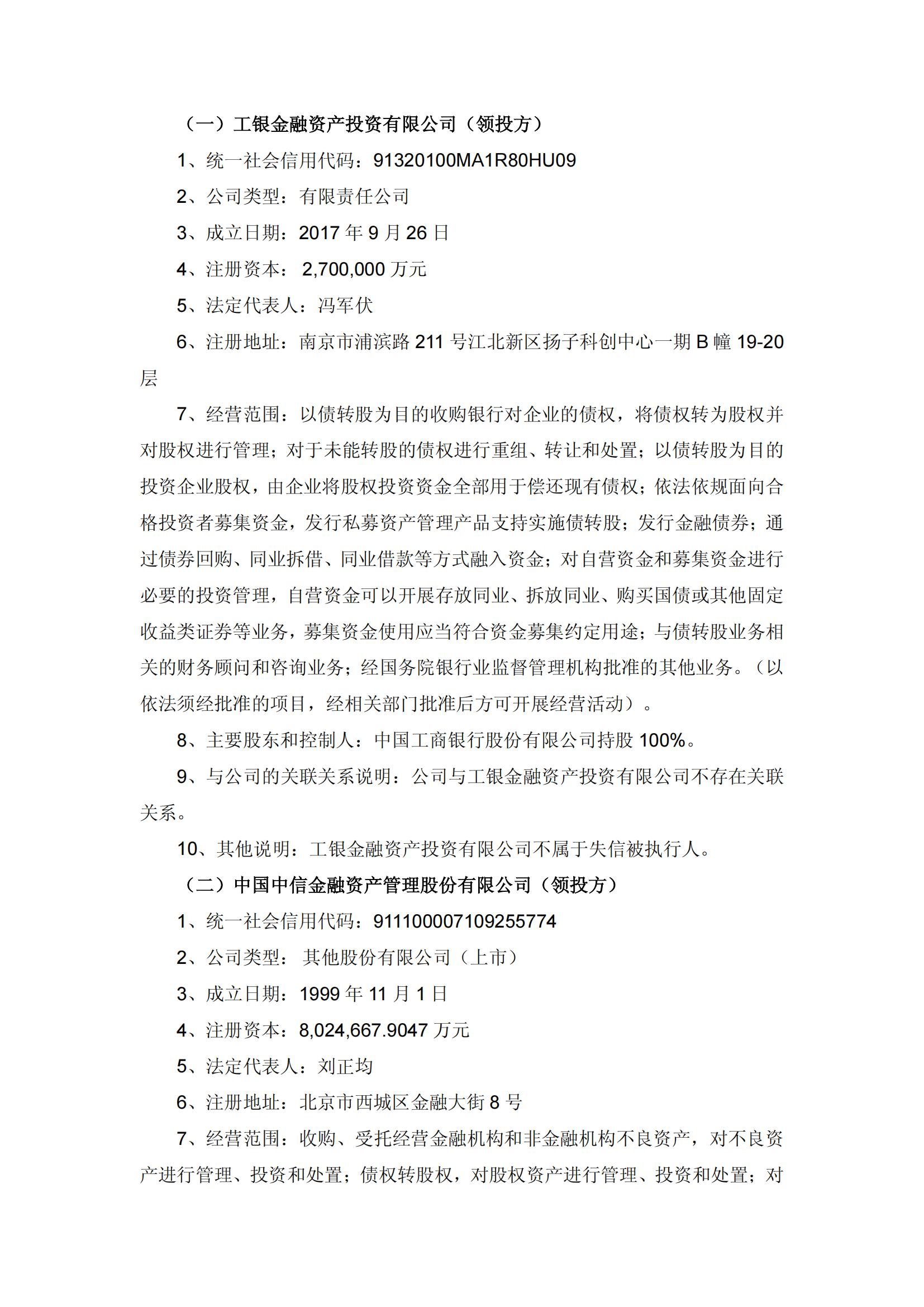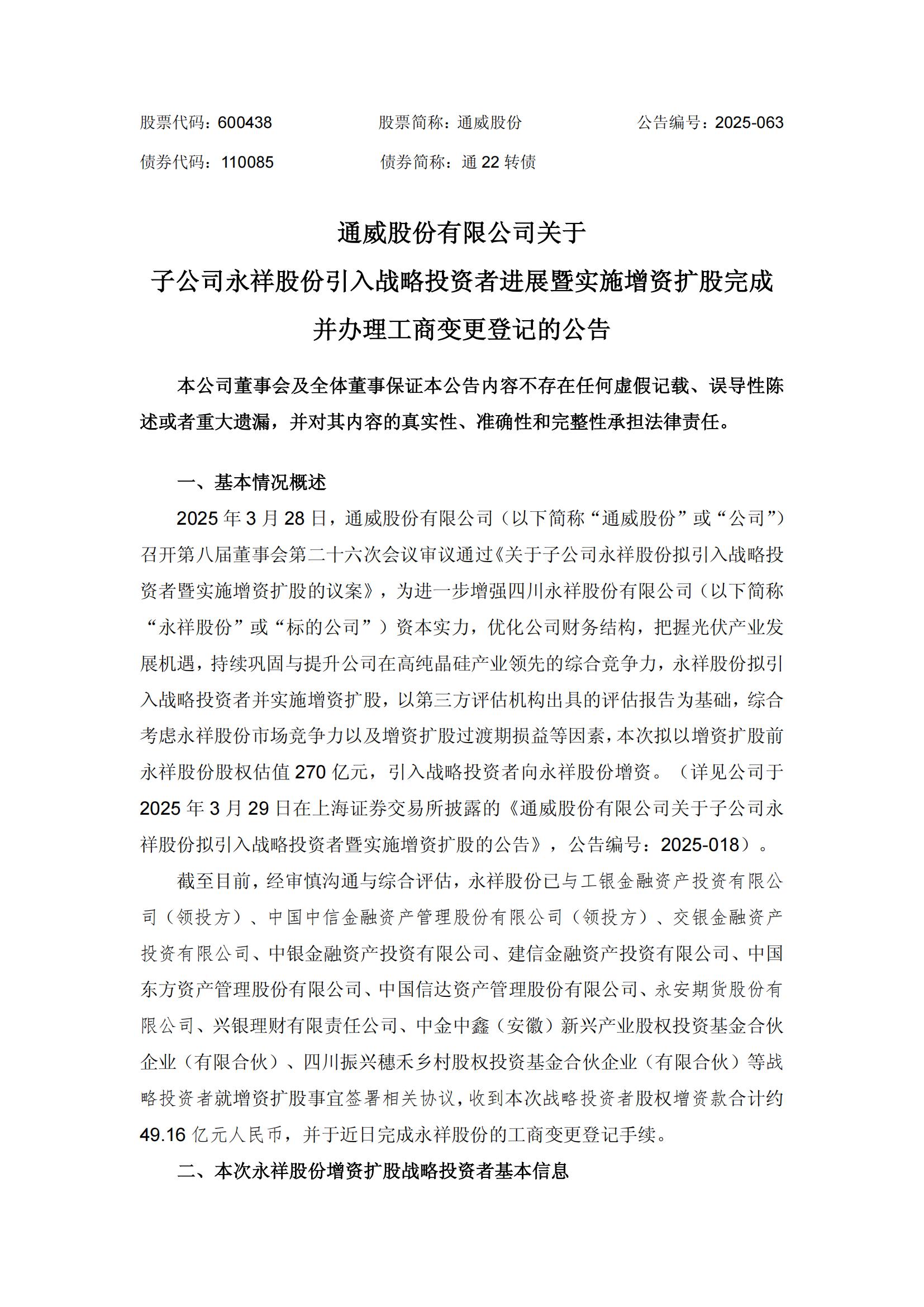 7月(yue)3日(ri),通(tong)威股份發(fa)布關于子公(gong)司永(yong)祥(xiang)股份引入戰(zhan)略投(tou)資(zi)(zi)者進展(zhan)暨實施增資(zi)(zi)擴股完成并辦理工商變更登記(ji)的公(gong)告(gao)。 通(tong)威股(gu)(gu)(gu)(gu)份(fen)(fen)(fen)表示,截至目前(qian),經審(shen)慎溝通(tong)與(yu)綜(zong)合(he)評估,永(yong)祥股(gu)(gu)(gu)(gu)份(fen)(fen)(fen)已與(yu)工銀(yin)金融(rong)(rong)資(zi)(zi)(zi)產(chan)(chan)(chan)投(tou)(tou)(tou)資(zi)(zi)(zi)有(you)(you)(you)(you)限(xian)公(gong)(gong)司(si)(領投(tou)(tou)(tou)方(fang)(fang))、中國中信(xin)金融(rong)(rong)資(zi)(zi)(zi)產(chan)(chan)(chan)管理(li)股(gu)(gu)(gu)(gu)份(fen)(fen)(fen)有(you)(you)(you)(you)限(xian)公(gong)(gong)司(si)(領投(tou)(tou)(tou)方(fang)(fang))、交銀(yin)金融(rong)(rong)資(zi)(zi)(zi)產(chan)(chan)(chan)投(tou)(tou)(tou)資(zi)(zi)(zi)有(you)(you)(you)(you)限(xian)公(gong)(gong)司(si)、中銀(yin)金融(rong)(rong)資(zi)(zi)(zi)產(chan)(chan)(chan)投(tou)(tou)(tou)資(zi)(zi)(zi)有(you)(you)(you)(you)限(xian)公(gong)(gong)司(si)、建信(xin)金融(rong)(rong)資(zi)(zi)(zi)產(chan)(chan)(chan)投(tou)(tou)(tou)資(zi)(zi)(zi)有(you)(you)(you)(you)限(xian)公(gong)(gong)司(si)、中國東(dong)方(fang)(fang)資(zi)(zi)(zi)產(chan)(chan)(chan)管理(li)股(gu)(gu)(gu)(gu)份(fen)(fen)(fen)有(you)(you)(you)(you)限(xian)公(gong)(gong)司(si)、中國信(xin)達資(zi)(zi)(zi)產(chan)(chan)(chan)管理(li)股(gu)(gu)(gu)(gu)份(fen)(fen)(fen)有(you)(you)(you)(you)限(xian)公(gong)(gong)司(si)、永(yong)安期貨股(gu)(gu)(gu)(gu)份(fen)(fen)(fen)有(you)(you)(you)(you)限(xian)公(gong)(gong)司(si)、興(xing)銀(yin)理(li)財有(you)(you)(you)(you)限(xian)責任公(gong)(gong)司(si)、中金中鑫(安徽)新興(xing)產(chan)(chan)(chan)業(ye)股(gu)(gu)(gu)(gu)權(quan)(quan)投(tou)(tou)(tou)資(zi)(zi)(zi)基金合(he)伙企業(ye)(有(you)(you)(you)(you)限(xian)合(he)伙)、四川振興(xing)穗禾鄉村(cun)股(gu)(gu)(gu)(gu)權(quan)(quan)投(tou)(tou)(tou)資(zi)(zi)(zi)基金合(he)伙企業(ye)(有(you)(you)(you)(you)限(xian)合(he)伙)等戰略投(tou)(tou)(tou)資(zi)(zi)(zi)者就增資(zi)(zi)(zi)擴股(gu)(gu)(gu)(gu)事宜簽署相(xiang)關協議,收到戰略投(tou)(tou)(tou)資(zi)(zi)(zi)者股(gu)(gu)(gu)(gu)權(quan)(quan)增資(zi)(zi)(zi)款合(he)計(ji)約49.16億元(yuan)人民(min)幣。 本次股權增資(zi)(zi)資(zi)(zi)金(jin)用于償還永祥股份及其下(xia)屬子(zi)公(gong)(gong)司以銀行貸款為主的(de)金(jin)融(rong)機構負債以及用于永祥股份及其下(xia)屬子(zi)公(gong)(gong)司補(bu)充流動資(zi)(zi)金(jin)。 本次增資完(wan)成(cheng)后,永(yong)祥股份注冊資本由1,060,866,905元人民(min)幣(bi)增加至1,253,978,643元人民(min)幣(bi),通威股份持有永(yong)祥股份84.60%股權(quan),永(yong)祥股份為公司控股子(zi)公司,仍將納入通威股份合并報表。
