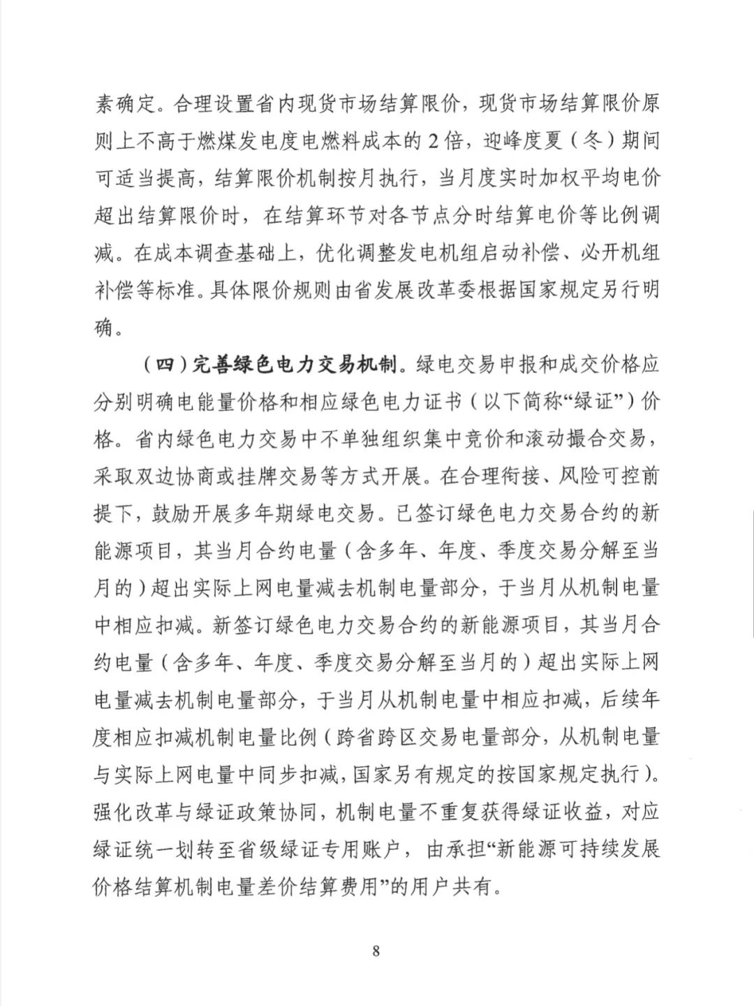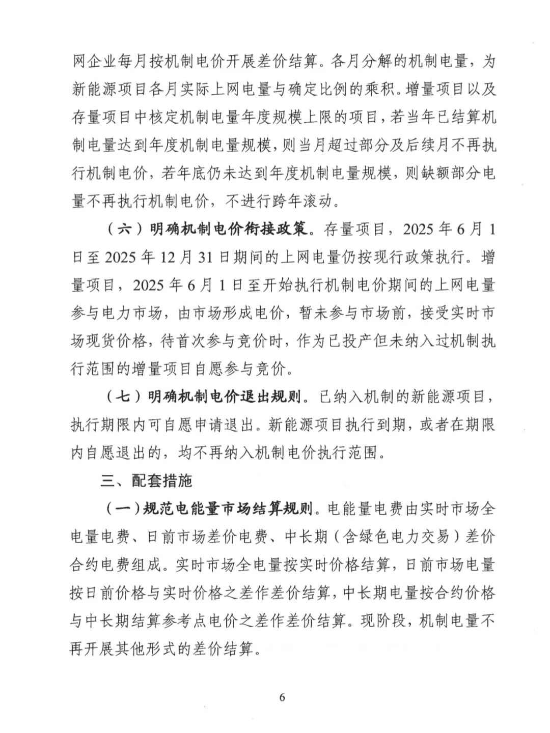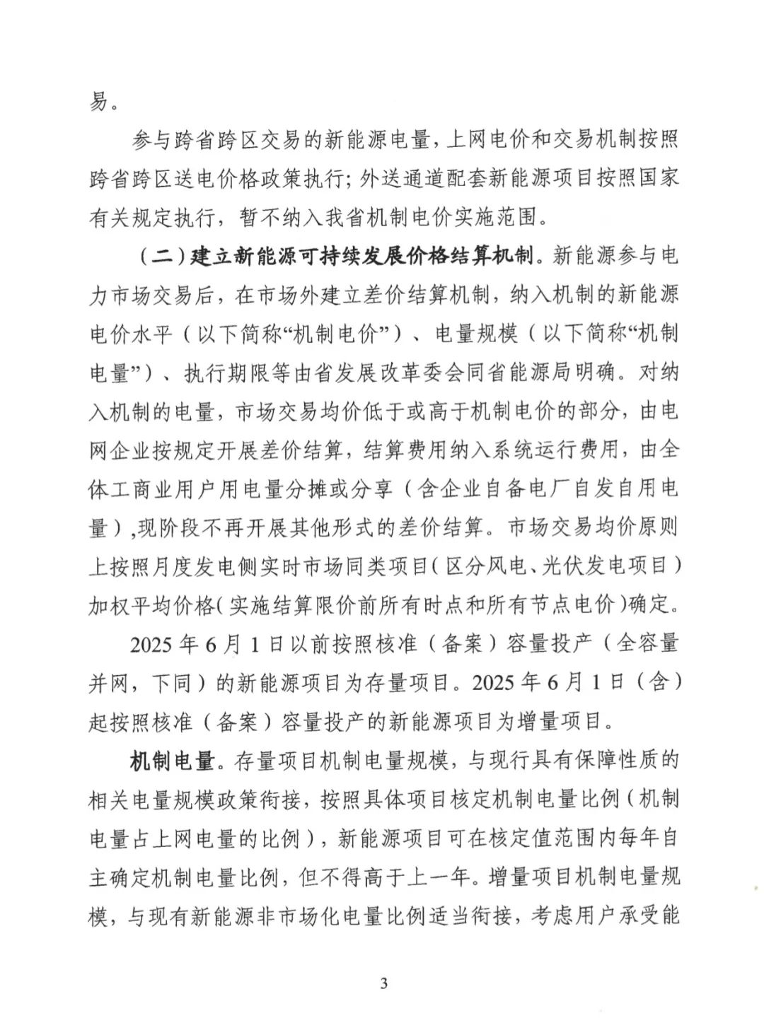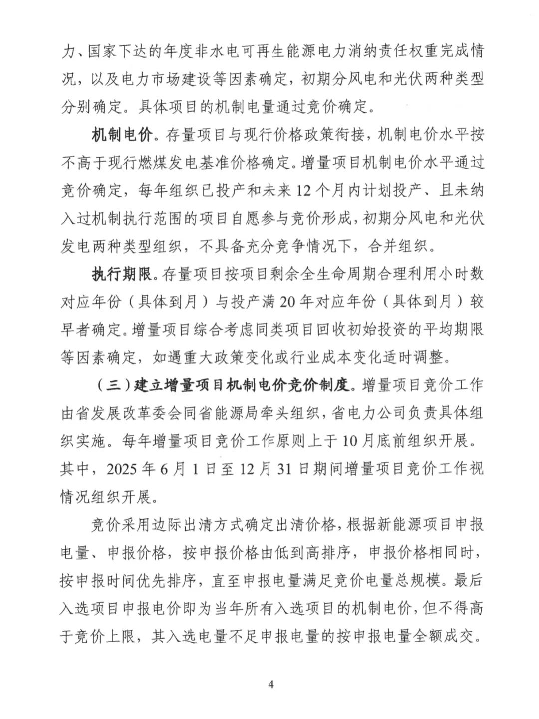 近日(ri),山西省(sheng)發改(gai)(gai)委(wei)下發關于征求對《山西省(sheng)深化(hua)新能(neng)源上網電價市場(chang)化(hua)改(gai)(gai)革促(cu)進新能(neng)源高質量發展(zhan)實施方(fang)案(征求意見稿)》意見建議的函(han)。 征求意見(jian)稿明確,新能源項目(mu)(風電(dian)(dian)(dian)、光伏發電(dian)(dian)(dian)項目(mu))上(shang)網電(dian)(dian)(dian)量(liang)原(yuan)則上(shang)全部進(jin)入電(dian)(dian)(dian)力市(shi)場,以“報量(liang)報價”方式參與(yu)交易形成上(shang)網電(dian)(dian)(dian)價,暫不具(ju)備(bei)條件的(de)接受市(shi)場形成的(de)價格(ge)。 參與跨(kua)(kua)(kua)省(sheng)跨(kua)(kua)(kua)區交易(yi)的(de)新能源電量(liang),上(shang)網電價(jia)和交易(yi)機制按照跨(kua)(kua)(kua)省(sheng)跨(kua)(kua)(kua)區送(song)電價(jia)格政策執行;外(wai)送(song)通道配套新能源項目暫不納入山西省(sheng)機制電價(jia)實施(shi)范圍(wei)。 劃分標準 2025年6月1日以前按照核準(備案(an))容(rong)量投(tou)產(chan)(全容(rong)量并網)的新能源項(xiang)目(mu)為(wei)存量項(xiang)目(mu);2025年6月1日(含)起按照核準(備案(an))容(rong)量投(tou)產(chan)的新能源項(xiang)目(mu)為(wei)增量項(xiang)目(mu)。 機制電量 存量項目機制(zhi)(zhi)電(dian)量規模,與現行具(ju)(ju)有保障性質的相關電(dian)量規模政策(ce)銜接,按照具(ju)(ju)體項目核(he)定(ding)機制(zhi)(zhi)電(dian)量比(bi)例(li)(機制(zhi)(zhi)電(dian)量占上(shang)網電(dian)量的比(bi)例(li)),新(xin)能源項目可在核(he)定(ding)值(zhi)范圍內每年自主確定(ding)機制(zhi)(zhi)電(dian)量比(bi)例(li),但不得(de)高于上(shang)一年。 增量(liang)(liang)項(xiang)目機(ji)制電(dian)(dian)量(liang)(liang)規模(mo),與現有新能(neng)源非市(shi)場(chang)(chang)化(hua)電(dian)(dian)量(liang)(liang)比例適當(dang)銜(xian)接,考(kao)慮用戶承受能(neng)力(li)、國(guo)家(jia)下達的年度非水電(dian)(dian)可再生能(neng)源電(dian)(dian)力(li)消納責任權(quan)重(zhong)完(wan)成情況,以(yi)及(ji)電(dian)(dian)力(li)市(shi)場(chang)(chang)建設等因素(su)確(que)(que)定(ding),初期分風電(dian)(dian)和光伏兩種類型分別確(que)(que)定(ding)。具(ju)體項(xiang)目的機(ji)制電(dian)(dian)量(liang)(liang)通過競價確(que)(que)定(ding)。 機制電價 存量項目與現(xian)行(xing)價格政策銜接,機制電價水(shui)平按(an)不高于現(xian)行(xing)燃煤發電基準(zhun)價格確定。 增量項目(mu)機制電價(jia)水(shui)平通(tong)過競價(jia)確定,每年(nian)組(zu)織(zhi)已投(tou)(tou)產(chan)和未來12個(ge)月內計劃投(tou)(tou)產(chan)、且(qie)未納入過機制執行范圍的項目(mu)自愿(yuan)參與競價(jia)形成,初期分(fen)風電和光伏(fu)發(fa)電兩(liang)種類(lei)型(xing)組(zu)織(zhi),不具備充分(fen)競爭情況下,合并組(zu)織(zhi)。 執行期限 存量項目按項目剩余全生命(ming)周期合理利用小(xiao)時數(shu)對應年份(fen)(具體到月)與投產滿(man)20年對應年份(fen)(具體到月)較早者確(que)定(ding)。 增(zeng)量(liang)項目綜合考慮(lv)同類(lei)項目回收初始投(tou)資的平均(jun)期限(xian)等因素確定,如遇重大政(zheng)策(ce)變化或行業成本變化適時調整。 征求意(yi)見(jian)稿明確,建立(li)增(zeng)量(liang)項(xiang)目機制(zhi)電價(jia)(jia)競價(jia)(jia)制(zhi)度。每年增(zeng)量(liang)項(xiang)目競價(jia)(jia)工作原(yuan)則上于10月底前組織開展。其(qi)中,2025年6月1日至(zhi)12月31日期間增(zeng)量(liang)項(xiang)目競價(jia)(jia)工作視情況(kuang)組織開展。 競(jing)價(jia)采用邊際出(chu)清(qing)方(fang)式確定出(chu)清(qing)價(jia)格(ge)(ge),根據新能(neng)源項目(mu)(mu)申(shen)(shen)(shen)(shen)報(bao)(bao)電(dian)(dian)(dian)量、申(shen)(shen)(shen)(shen)報(bao)(bao)價(jia)格(ge)(ge),按申(shen)(shen)(shen)(shen)報(bao)(bao)價(jia)格(ge)(ge)由低到高(gao)排(pai)序,申(shen)(shen)(shen)(shen)報(bao)(bao)價(jia)格(ge)(ge)相同時按申(shen)(shen)(shen)(shen)報(bao)(bao)時間優(you)先排(pai)序,直至申(shen)(shen)(shen)(shen)報(bao)(bao)電(dian)(dian)(dian)量滿(man)足競(jing)價(jia)電(dian)(dian)(dian)量總規模(mo)。最后(hou)入(ru)選項目(mu)(mu)申(shen)(shen)(shen)(shen)報(bao)(bao)電(dian)(dian)(dian)價(jia)即(ji)為當年所有入(ru)選項目(mu)(mu)的(de)機制電(dian)(dian)(dian)價(jia),但不(bu)得高(gao)于競(jing)價(jia)上限,其入(ru)選電(dian)(dian)(dian)量不(bu)足申(shen)(shen)(shen)(shen)報(bao)(bao)電(dian)(dian)(dian)量的(de)按申(shen)(shen)(shen)(shen)報(bao)(bao)電(dian)(dian)(dian)量全(quan)額成交。 競價(jia)上(shang)、下(xia)限由省發展改革委綜合(he)考慮合(he)理成本(ben)收益、綠色價(jia)值電(dian)力(li)市場(chang)供需形勢(shi)、用(yong)戶承受能力(li)、引(yin)導有(you)序競爭等因素確定并適時調整。為(wei)確保競爭有(you)效,機(ji)制電(dian)量申報總(zong)規(gui)模(mo)(mo)與核(he)定總(zong)規(gui)模(mo)(mo)比率原則上(shang)不低于1.2,否(fou)則相應(ying)調減核(he)定機(ji)制電(dian)量規(gui)模(mo)(mo)直至滿足比率要求。 鼓勵分布式(shi)光伏、分散式(shi)風電自行參(can)與競(jing)(jing)價(jia)(jia),也可聚合后統參(can)與競(jing)(jing)價(jia)(jia)。當年(nian)未(wei)參(can)與競(jing)(jing)價(jia)(jia)以及參(can)與競(jing)(jing)價(jia)(jia)但(dan)未(wei)入選的項(xiang)目,可順(shun)延至(zhi)后續年(nian)度參(can)與。期間,上(shang)網(wang)電價(jia)(jia)全部(bu)由(you)市(shi)場(chang)形(xing)成,不參(can)與機制電價(jia)(jia)結(jie)算(suan)。 同時(shi),建立增量項目競(jing)價約